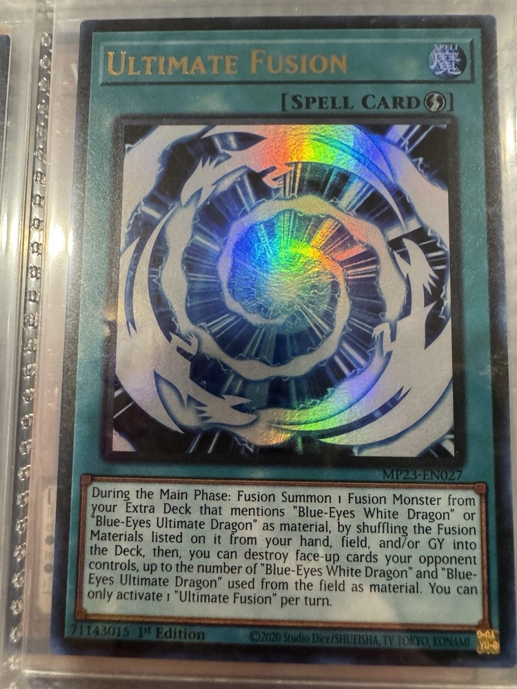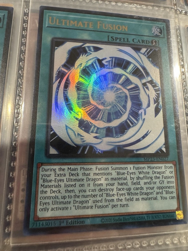Dive into the 25th Anniversary Tin: Dueling Heroes Mega Pack with the Ultimate Fusion MP23-EN027 card, a must-have for any Yu-Gi-Oh! TCG enthusiast. As a 1st Edition Ultra Rare card, it stands out with its Quick Play Spell attribute, allowing for strategic play during the Main Phase. Fusion Summoning becomes a streamlined process with the ability to shuffle Fusion Materials from hand, field, and/or Graveyard into the Extra Deck to fuse a powerful monster. Crafted by Konami, this English-language card features the iconic "Blue-Eyes White Dragon" and "Blue-Eyes Ultimate Dragon" as material, providing a unique and dynamic gameplay advantage. With the card's rarity and its potential to disrupt your opponent's cards, it's an asset that can turn the tide of battle. Enhance your deck with the prowess of "Ultimate Fusion" and outmaneuver your adversaries.
