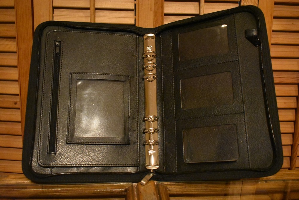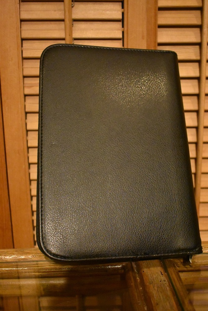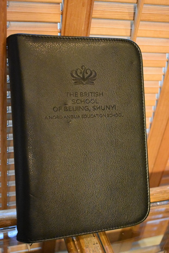 This is a unique zippered black faux leather portfolio that accommodates medium sized six-ring notebook paper, has a zipper interior pocket, three clear holders for business cards or credit cards, one clear holder for 3 ½” x 4” documents, and a fold-out pocket for loose papers. Located in Beijing, China, the school has identified itself as following “the English National Curriculum and IB Diploma Programme.” Measures: 10” Long 7” Wide 1 ¼” Deep Price Includes Free Shipping No Returns No International Sales
