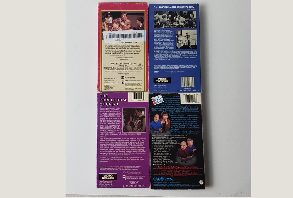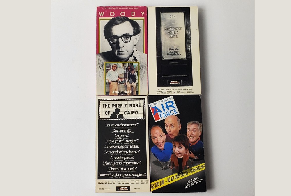 This product is a lot of four VHS tapes featuring comedy movies including Woody Allen's "Annie Hall" "The Purple Rose of Cairo" "Broadway Danny Rose" and "Royal Canadian Air Farce". These vintage tapes offer a collection of comedic films that are sure to provide hours of entertainment for fans of the genre. With classic titles included, this lot is a great addition to any movie enthusiast's collection.