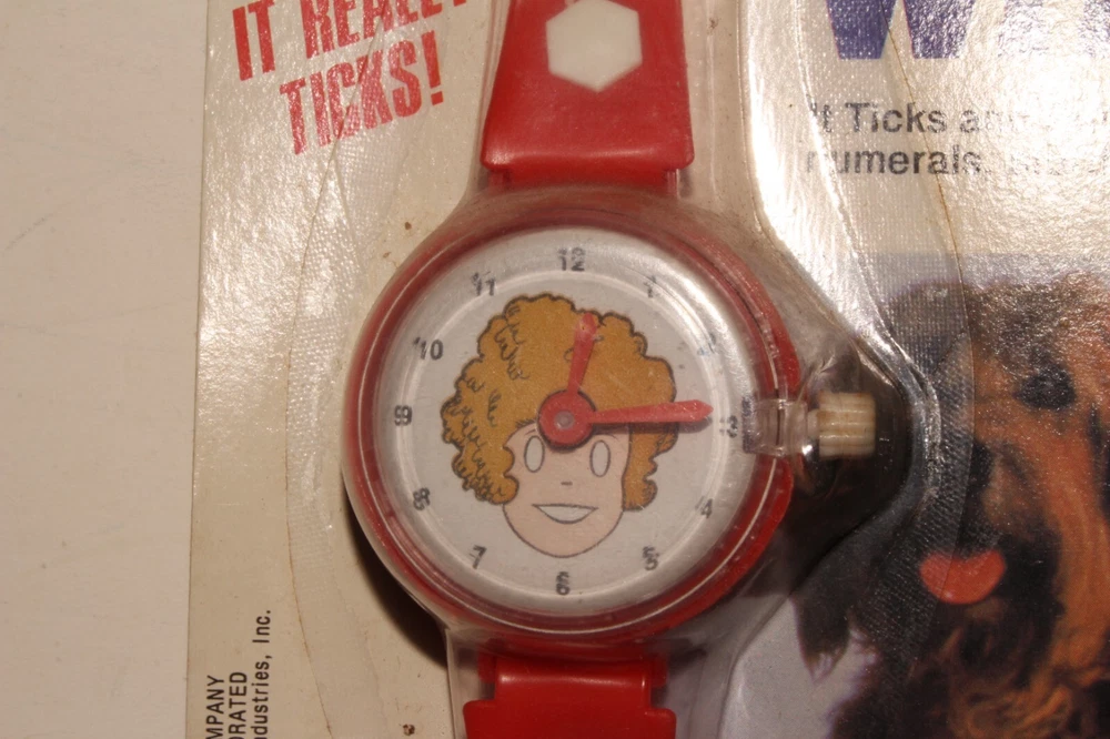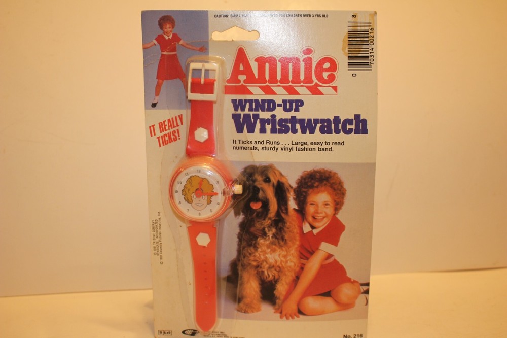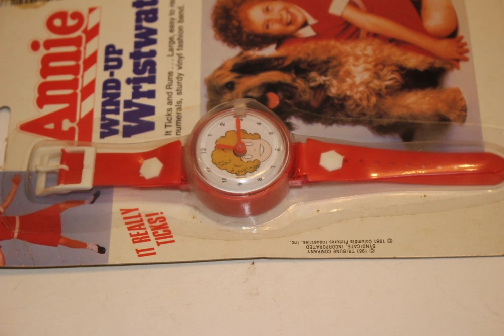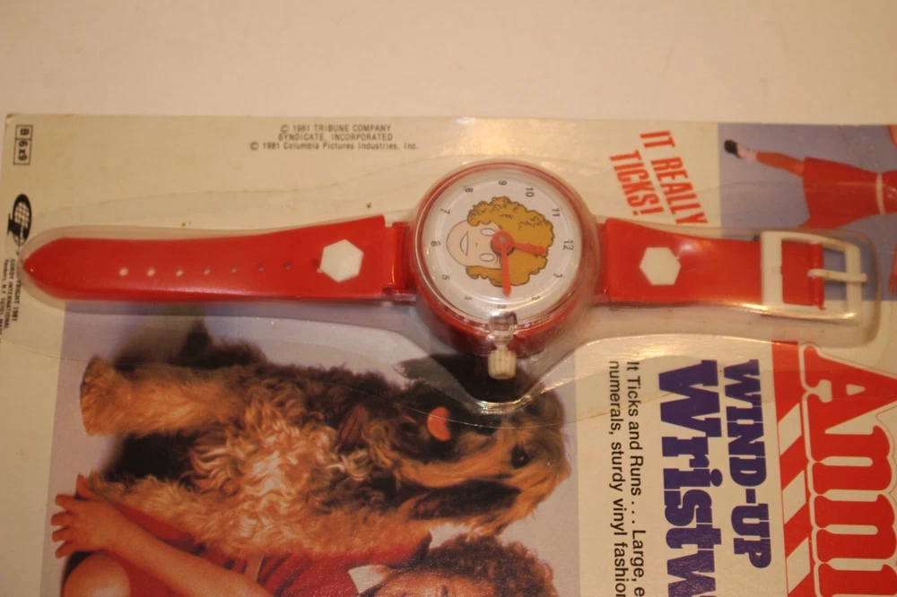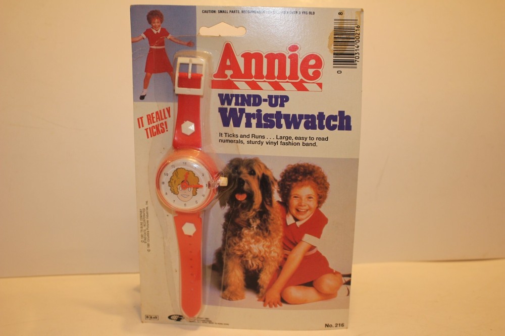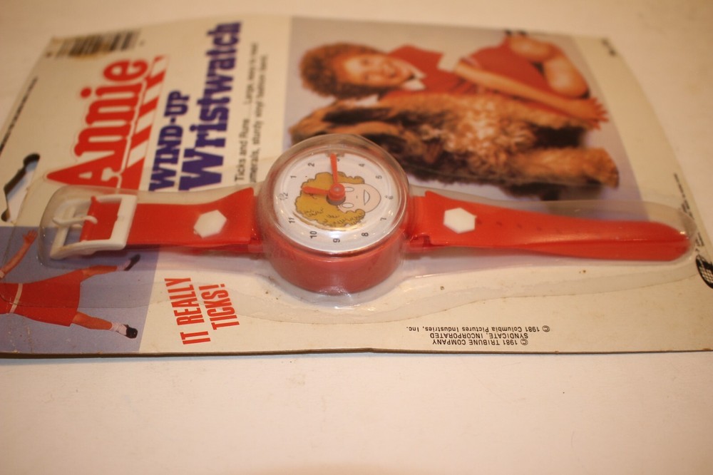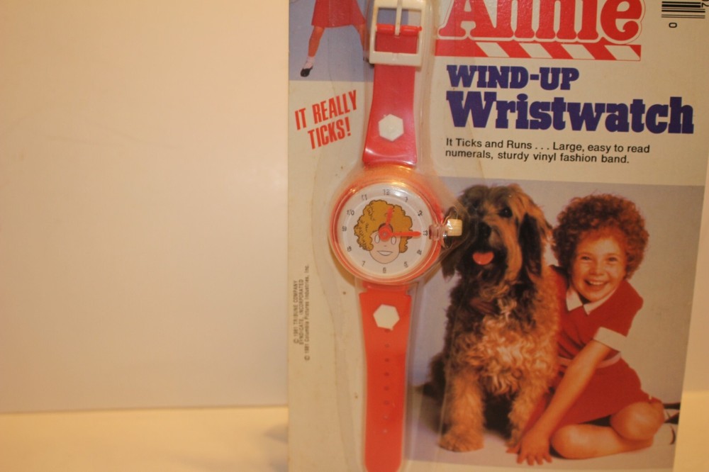 VINTAGE 1982 ANNIE WIND-UP WRIST WATCH LITTLE ORPHAN ANNIE NOS . IT IS BRAND NEW IN THE ORIGINAL PACKAGING. IT IS NEW OLD STOCK. IT HAS NEVER BEEN OPENED SO I DO NOT KNOW IF IT WORKS. SEE PICTURES FOR DETAILS.