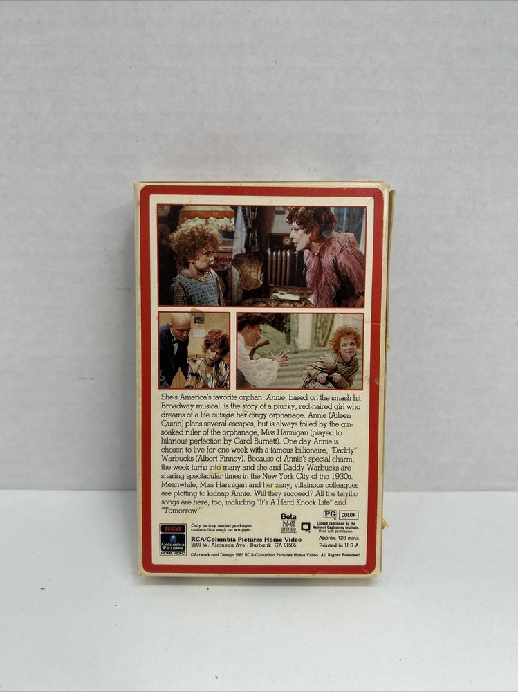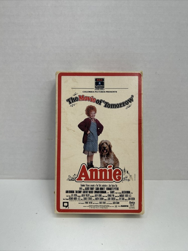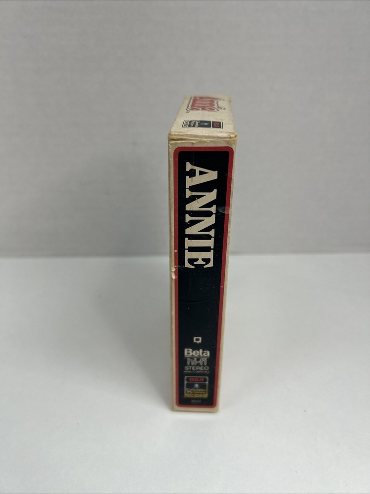 This is a vintage 1985 release of the beloved 1981 musical comedy "Annie" on Betamax format. The item has not been tested but is sold as-is. It features an all-star cast including Carol Burnett and Aileen Quinn, with John Huston directing. The film is in English and follows the adventures of the spunky orphan Annie as she searches for her family and finds love with her billionaire benefactor, Daddy Warbucks. The Betamax tape weighs approximately 10 oz and is rated G, making it suitable for all ages.