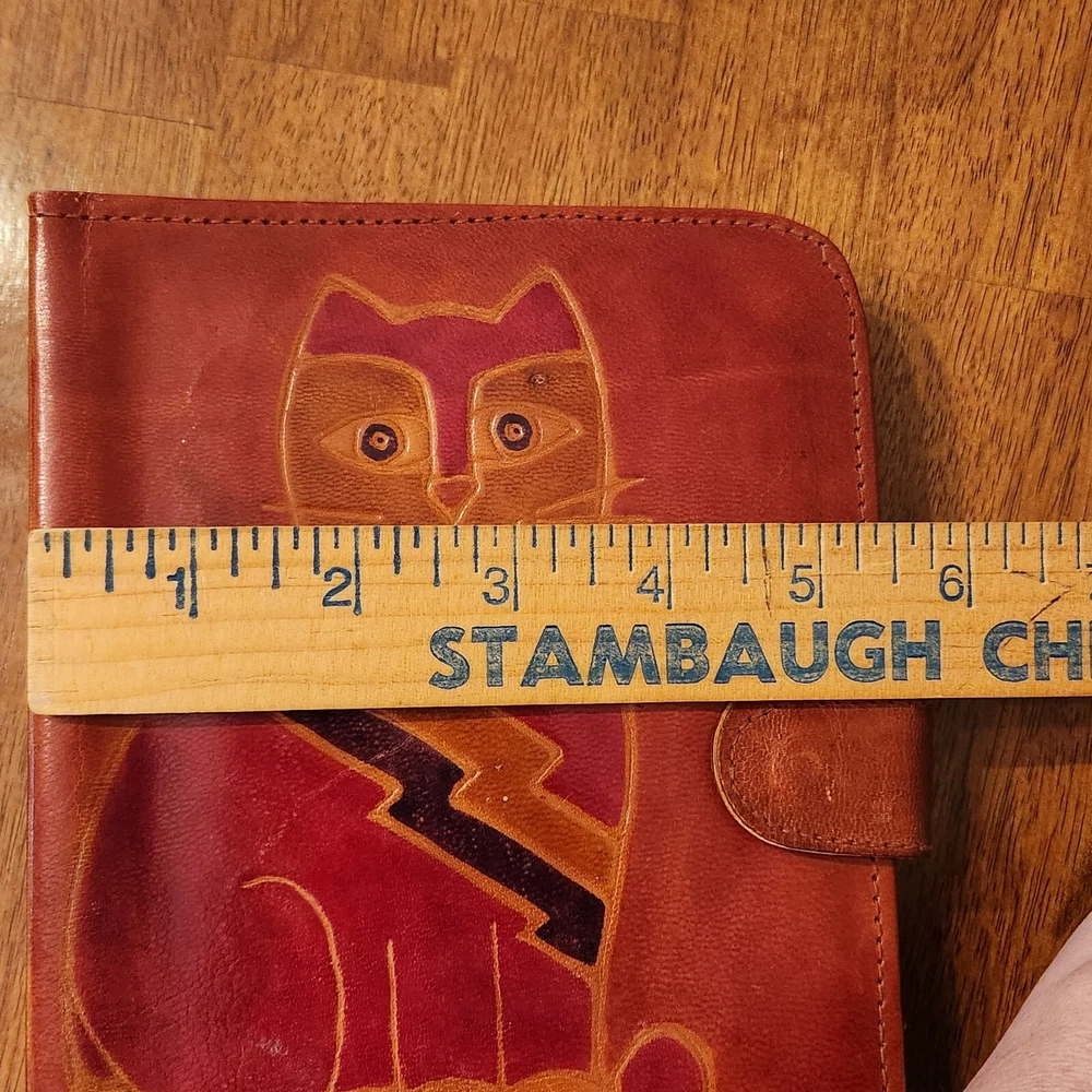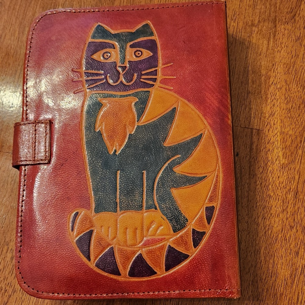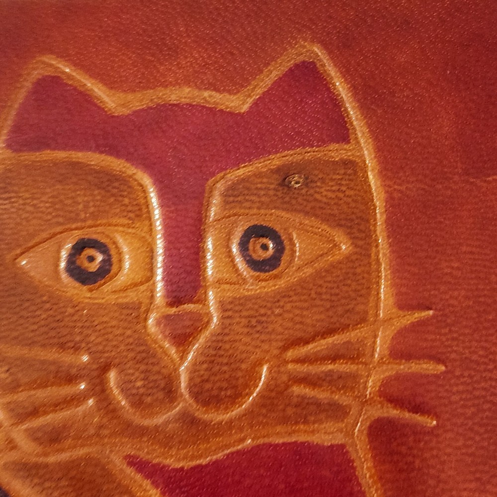 This is a vintage leather hand tooled planner/calendar that features a cat on the front and back. It has a tiny flaw on the front by the left eye. This can be seen in the photos. This planner has not been used, but I listed it as used because of the flaw. It is absolutely beautiful!! The measurements are in the photos as well. Please let me know if you have any questions. Thank you.