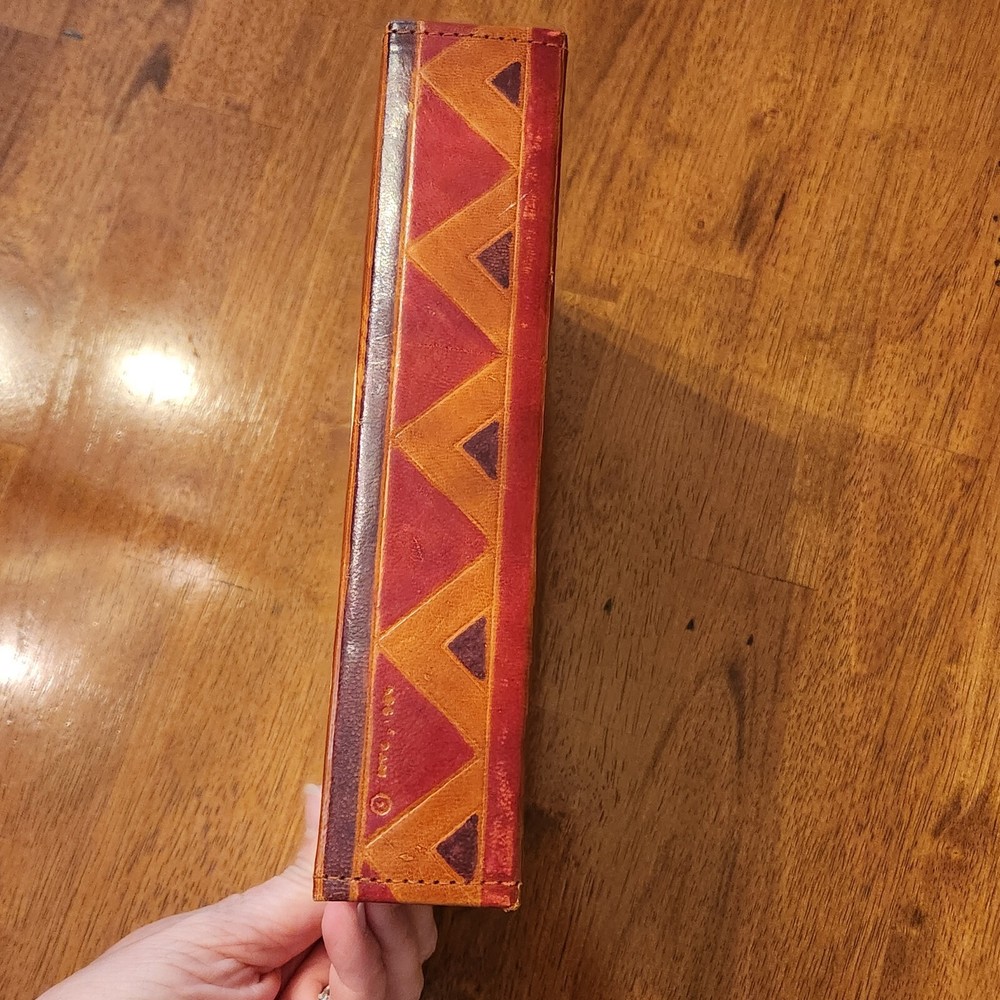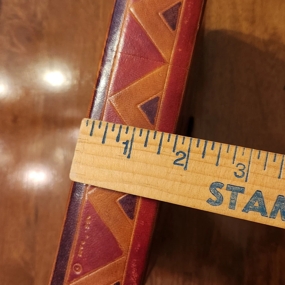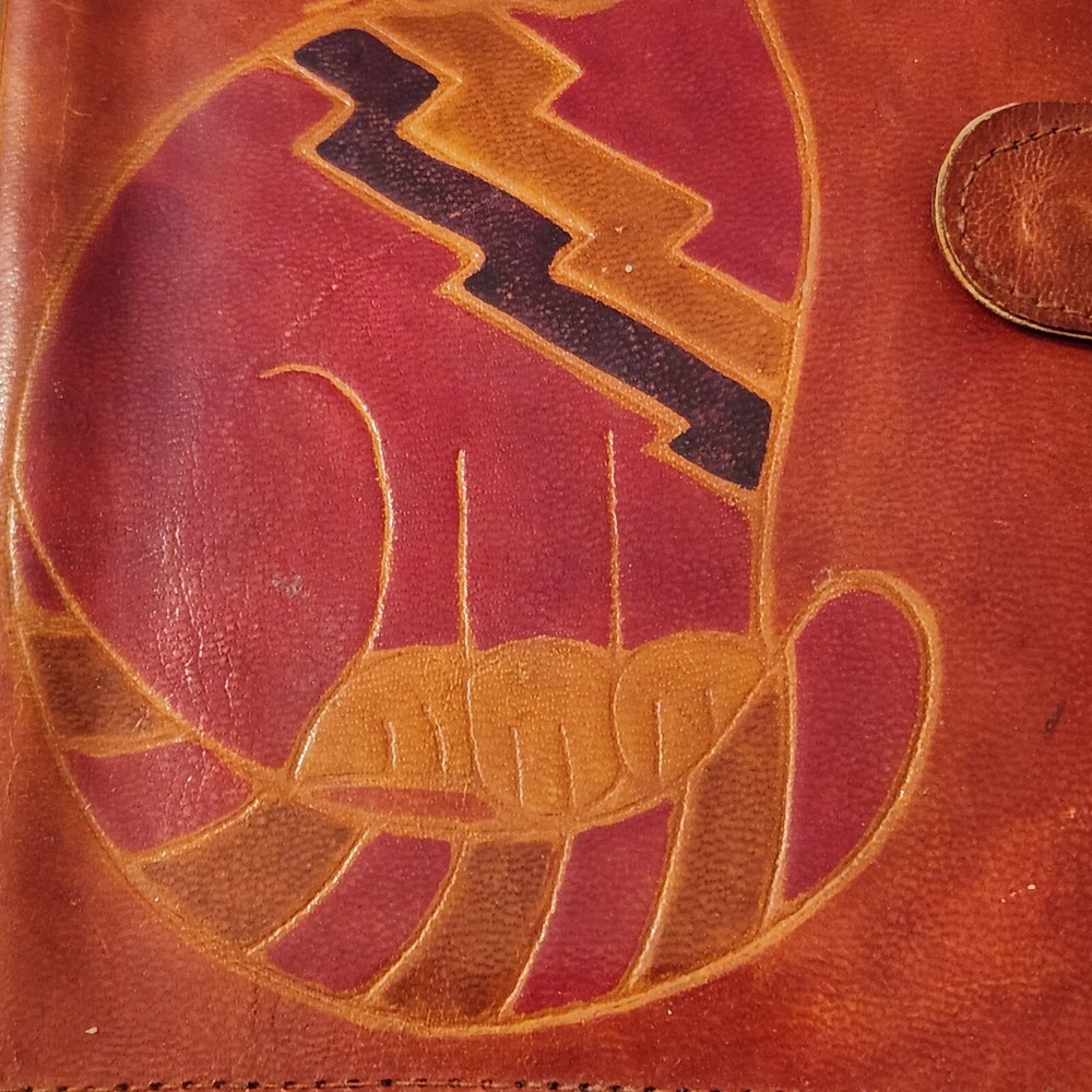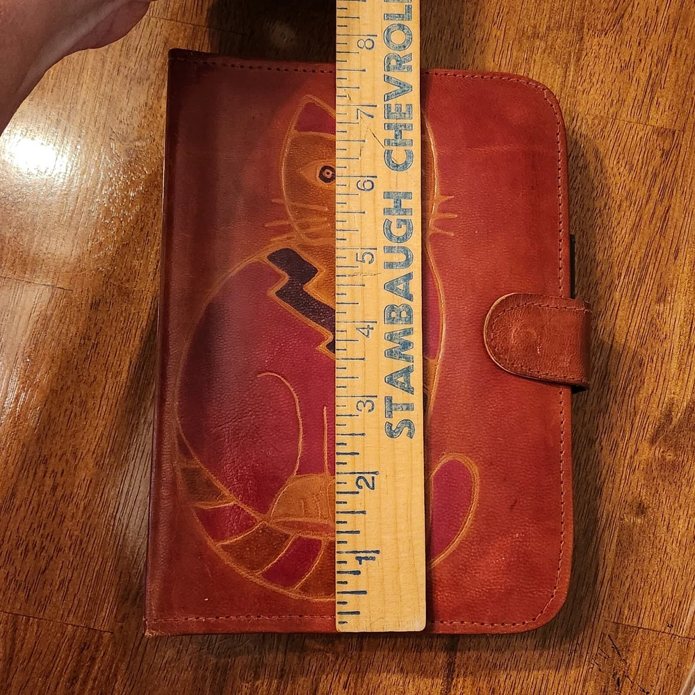 This is a vintage leather hand tooled planner/calendar that features a cat on the front and back. It has a tiny flaw on the front by the left eye. This can be seen in the photos. This planner has not been used, but I listed it as used because of the flaw. It is absolutely beautiful!! The measurements are in the photos as well. Please let me know if you have any questions. Thank you.