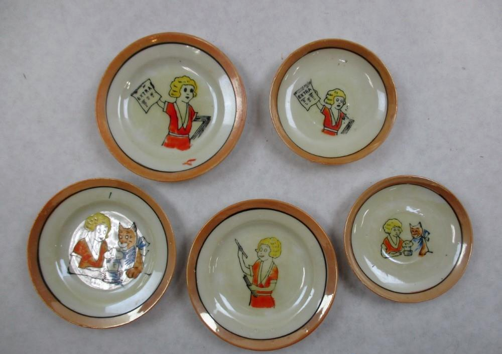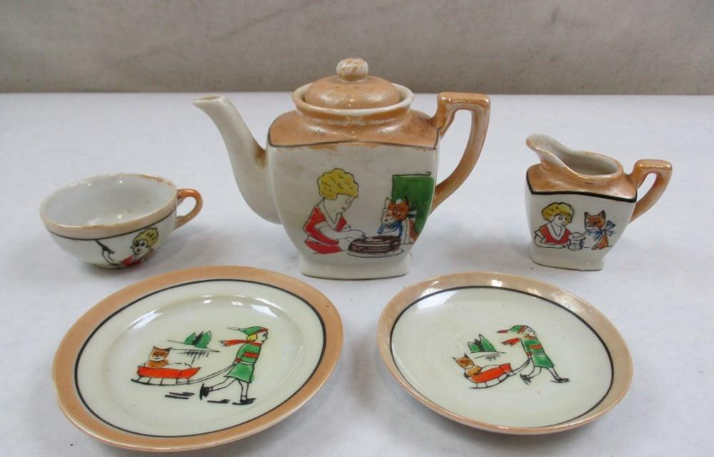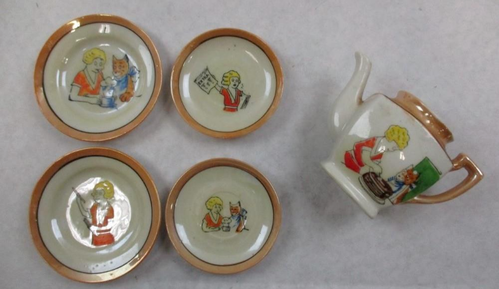 VINTAGE Child 's TEA SET 11 Pieces LITTLE ORPHAN ANNIE + HER DOG SANDY Lustreware 1940's Teapot Creamer Plates Cup MADE IN JAPAN Authentic ~~~~~~~~~~~~~~~~~~~~~~~~~~~~ Stored in a smoke free home. See my other great buys. . Recycled Materials Used For Shipping Whenever Possible! FREE SHIPPING IN THE USA!