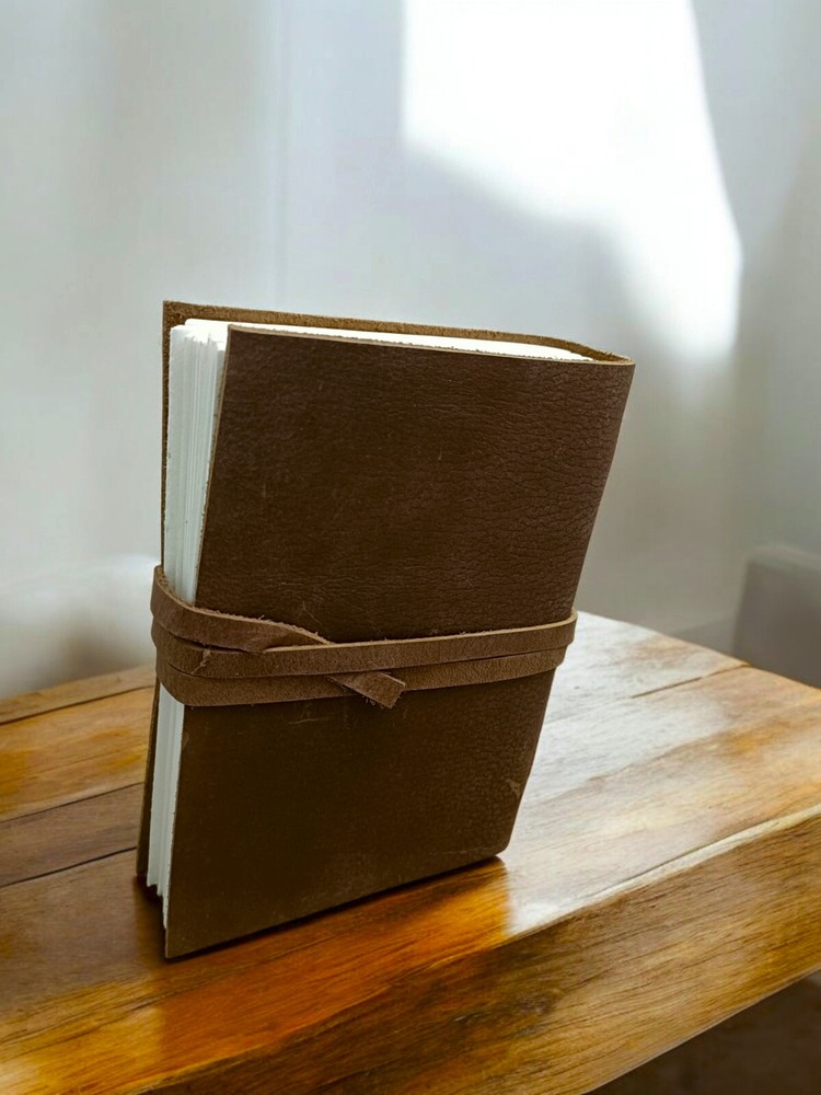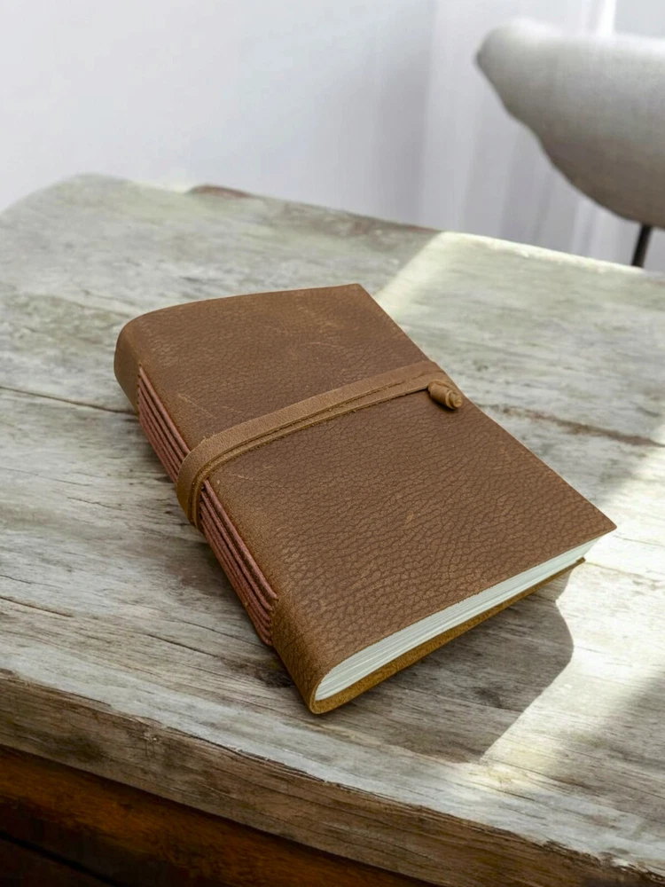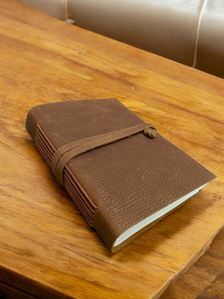 Product Description A BEAUTIFUL LEATHER JOURNAL NOTEBOOK OF THE HIGHEST QUALITY BROWN VINTAGE DIARY FOR MEN AND WOMEN MATERIAL - GENUINE LEATHER SIZE - 7x5 INCH PAGE COUNT - 192 PAGES (BOTH SIDE COUNT) PAGE TYPE - UNLINED BLANK PAGES Entirely handcrafted by Handicraft Export artesian, each leather-bound journal is a work of art and handmade. We use a thicker, higher-grade leather combined with incredible craftsmanship to create a journal that is soft and supple in the hand with that fabulous, intense leather scent. Our water buffalo leather is prepared in the crazy horse style and takes on its own distressed character with use. The natural colour vary due to resolution and light. You will be as proud to own your vintage journal as we have been to make it! Look and fell of an old book The Vintage Journal is made Thick and Rustic Paper which makes you feel like you are writing in an old relic. It will hold any ink without any bleed-through. The Leather Journal can be used as a Sketchbook, Shadow, Grimoire, Poetry journal, Food journal, memory journal, and many more. It transports you to a world all your own. STYLISH AND A TIMELESS MASTERPIECE Old Fashioned Paper along with the beauty of distressed leather, handmade by Artisans creates a masterpiece that you can cherish over decades. Add your special touch and you have a piece of art to hand down to the generations. STURDY BINDING AND LEATHER WRAPAROUND Sturdy hand-stitched binding to make sure that no paper comes out loose from your vintage notebook. The leather wraparound keeps the papers of the journal safe and secure. Naturally tanned leather will age with character - or simply rub away your markings if you choose. A lifelong companion on your journeys A BEAUTIFUL LEATHER JOURNAL OF THE HIGHEST QUALITY LOOK AND FEEL OF AN OLD BOOK STYLISH AND A TIMELESS MASTERPIECE STURDY BINDING AND LEATHER WRAPAROUND Why you should buy the Nomads Vintage Leather Journal ? THE STYLISHLY ANCIENT GIFT The antique cotton paper combined with the beauty of distressed leather, hand-stitched by Artisans, creates a keepsake you will cherish forever. Makes a great gift for the men, women, and Wiccans in your life! CREATE YOUR OWN ADVENTURE Escape with your Nomad Journal and create your own masterpiece. Write, Sketch, Doodle, or Draw, options are limitless.