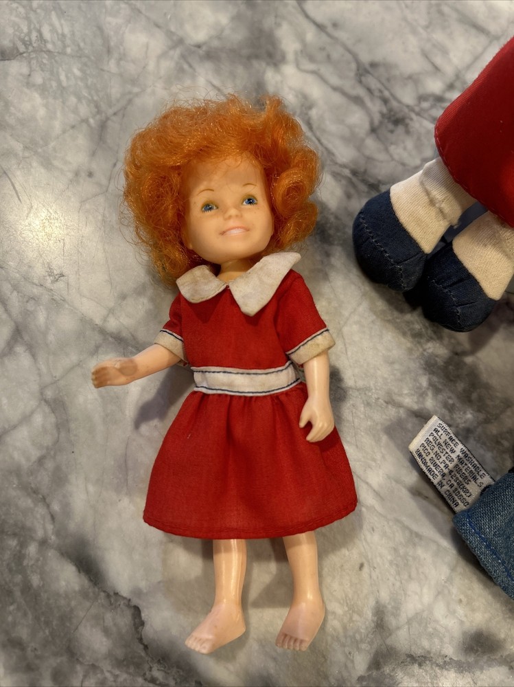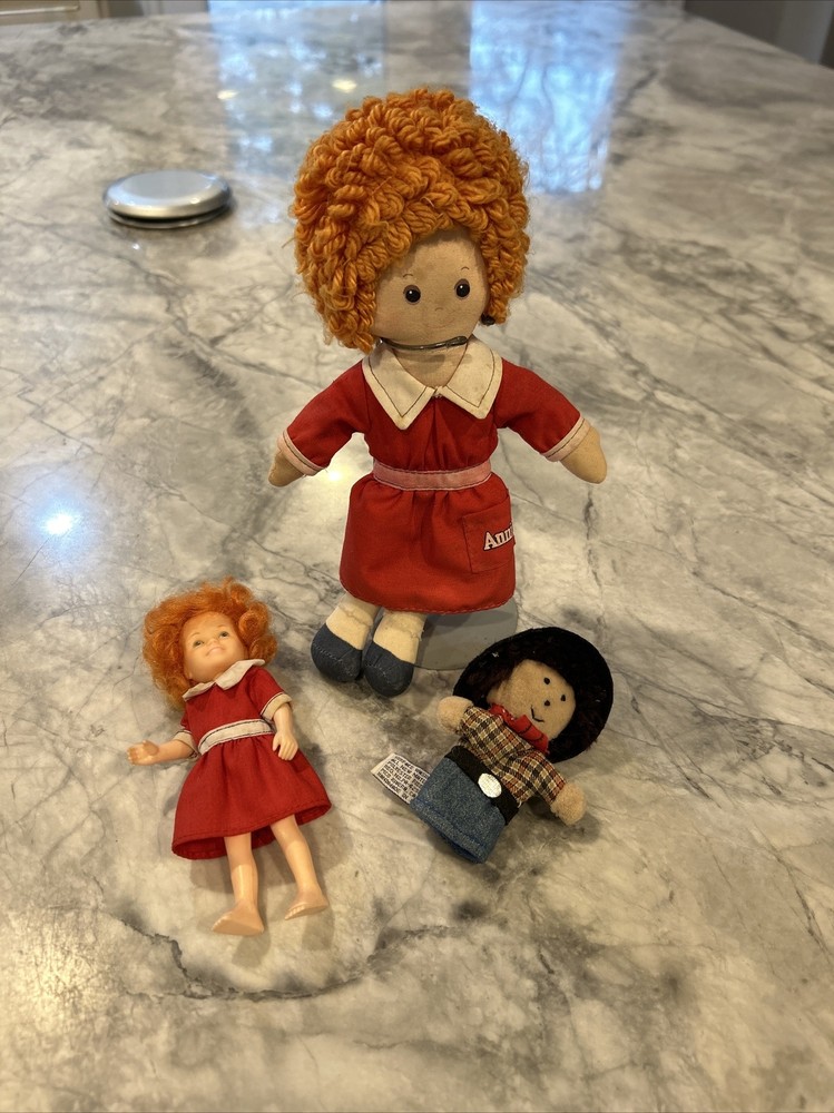This listing features a vintage 1977 Little Orphan Annie Knickerbocker doll measuring 10 inches, along with a 1982 Annie doll and an Aurora Puppet. The Little Orphan Annie doll displays the classic red dress and white apron, while the 1982 doll features a different outfit. Both dolls are in good condition and come with their own accessories. The Knickerbocker doll is a great collector's item for fans of vintage toys and 1970s memorabilia. The Aurora Puppet adds an extra layer of fun to playtime, allowing children to act out their favorite Annie scenes. Don't miss out on the chance to own a piece of pop culture history with this unique set.