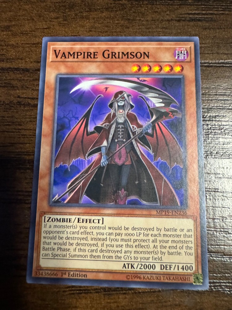 This is a rare and highly sought-after card featuring the powerful Vampire Grimson, with an attack strength of 2000 and defense/toughness of 1400. It is a 1st edition card from the 2019 Gold Sarcophagus Tin Mega Pack, with a rarity of Common/Short Print. The card is in English language and manufactured by Konami for the Yu-Gi-Oh! TCG game. This card is perfect for collectors and players alike, and is sure to be a valuable addition to any collection. Its unique features include an Effect card type and a card number of MP19-EN236. Don't miss out on the chance to own this incredible card!