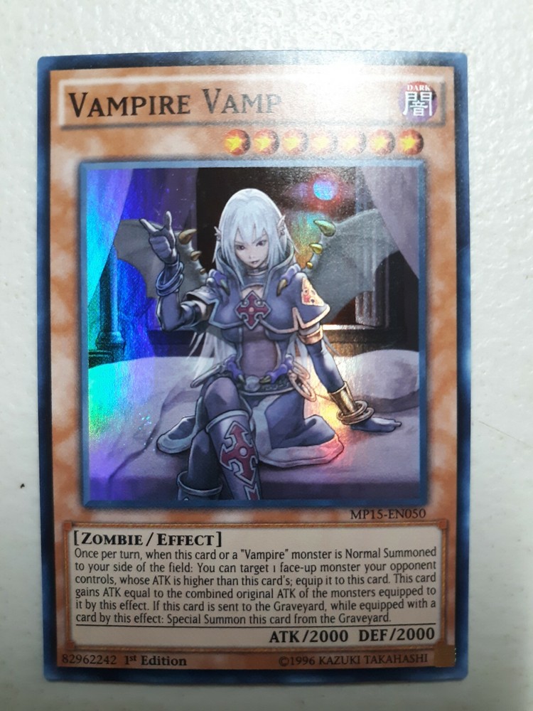 For sale, Vampire Vamp MP15-EN050 Super Rare 1st Edition 2015 Mega Tins Lightly Played (as pic tured). Pictured card only. Light play, very good shape. Any ques tions, please ask and thanks for lookin...