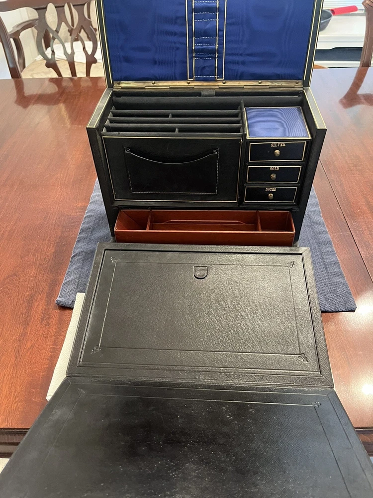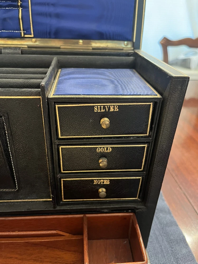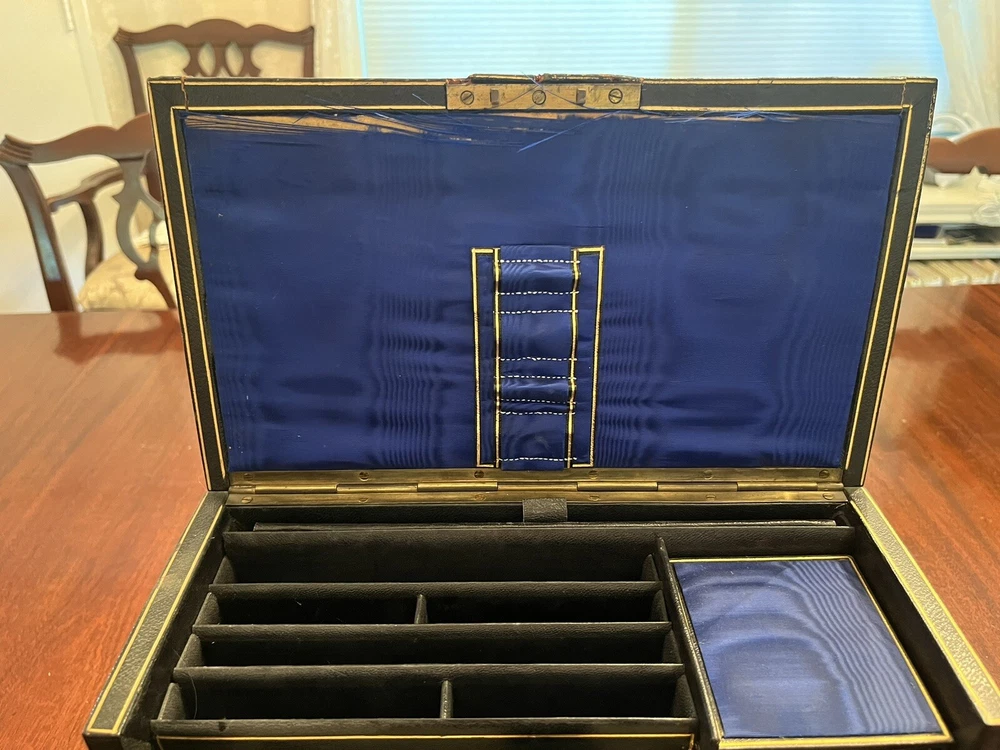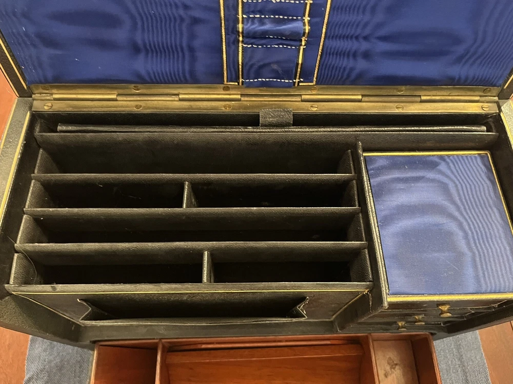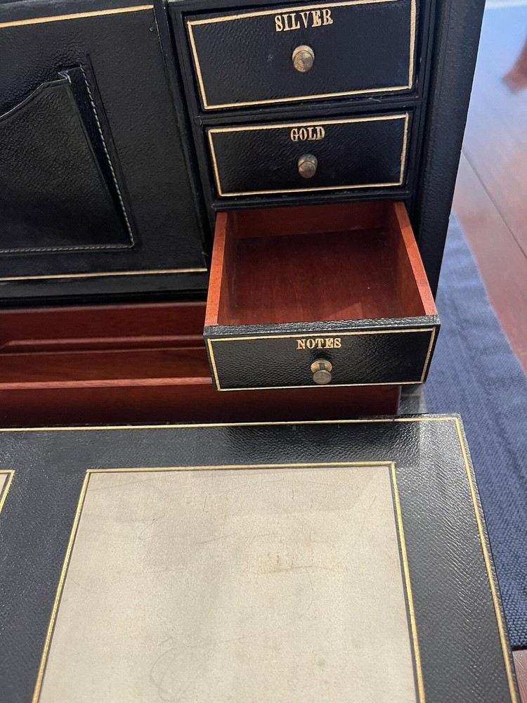 Circa 1890. Purchased in London in 1968 A fantastic 19th century ladies stationary chest. Of a superior quality build with an updated lock and key installed, which is delicate but functional! Has initials embossed onto top, we think it’s G.J.A. and the maker of the box is embossed on base “D.A. Anderson, Arcade Edinburgh” Depth: 7.25” Height: 9.5” Width: 12.25” The box looks pretty much unused and has been very well looked after. The fitted interior has: Fold down writing slope with underside storage. Hard writing boxes for minimal damage to box during writing. Automatic opening wooden drawer when the writing slope is folded down for glass inkwell. The original leather bound matching notebook that fits in the back compartment. Three small storage drawers embossed with - Notes, Gold, Silver. A great desktop item for anyone wanting that antique look.