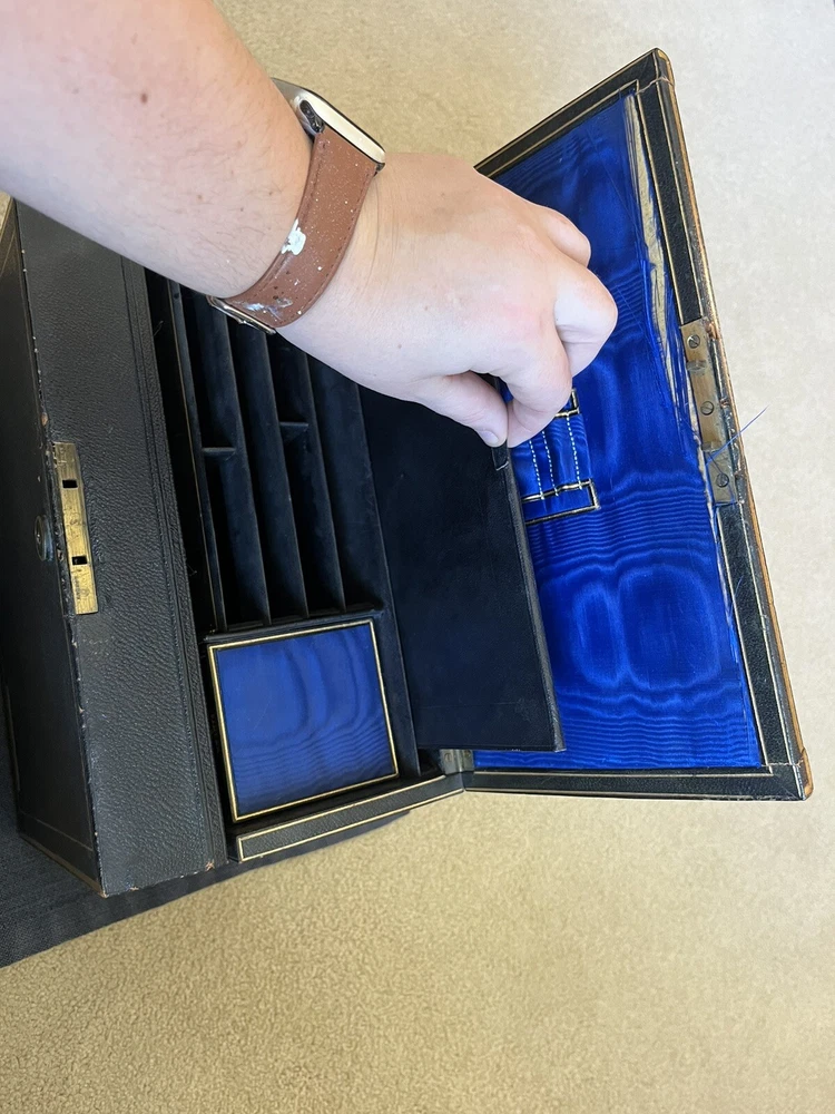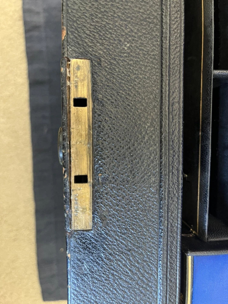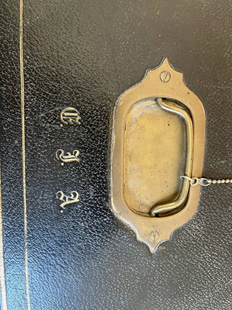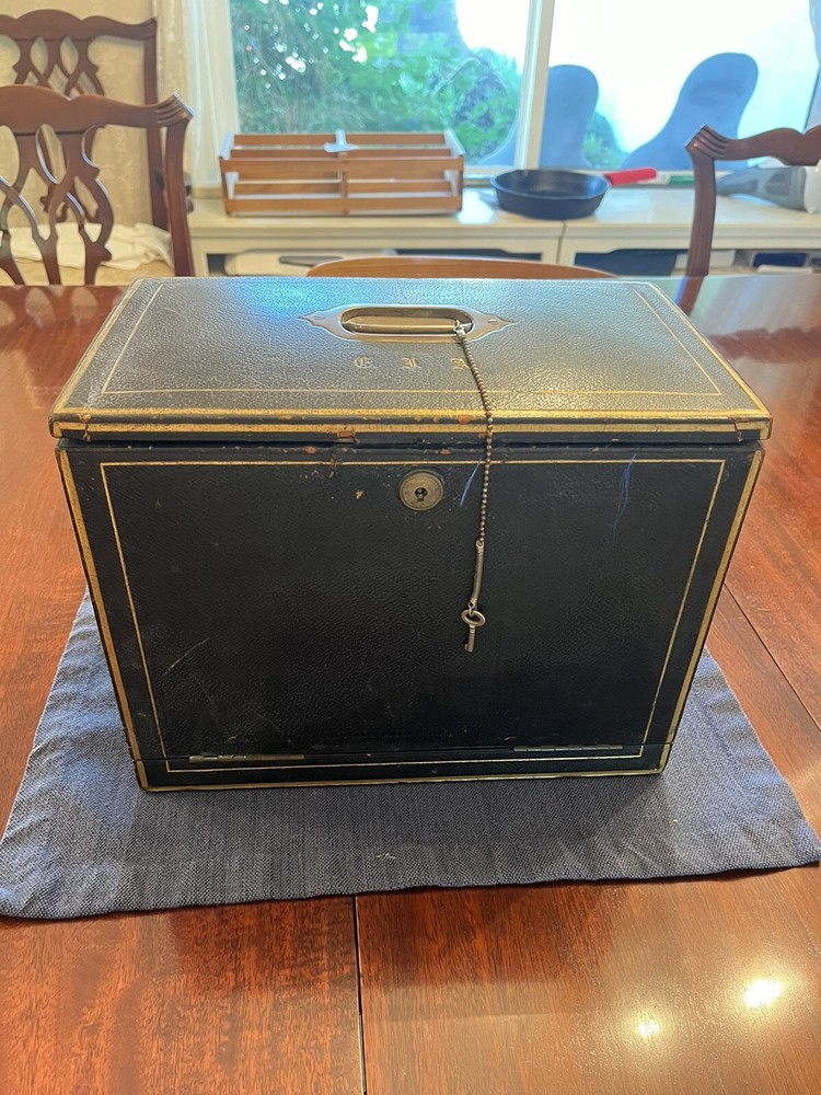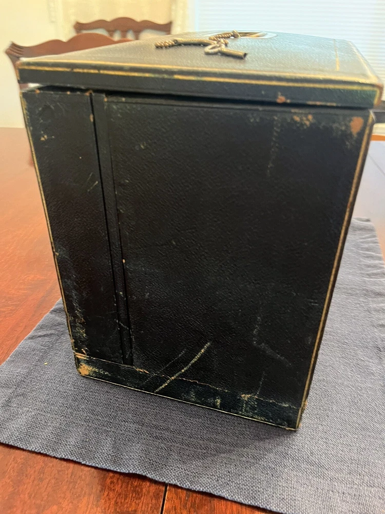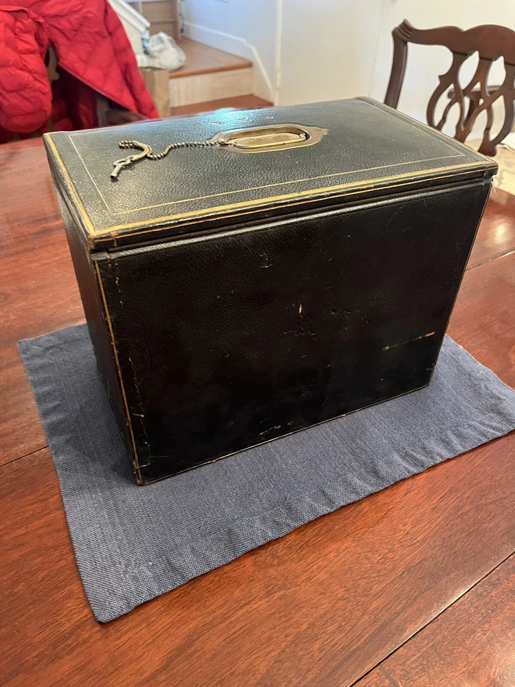 Circa 1890. Purchased in London in 1968 A fantastic 19th century ladies stationary chest. Of a superior quality build with an updated lock and key installed, which is delicate but functional! Has initials embossed onto top, we think it’s G.J.A. and the maker of the box is embossed on base “D.A. Anderson, Arcade Edinburgh” Depth: 7.25” Height: 9.5” Width: 12.25” The box looks pretty much unused and has been very well looked after. The fitted interior has: Fold down writing slope with underside storage. Hard writing boxes for minimal damage to box during writing. Automatic opening wooden drawer when the writing slope is folded down for glass inkwell. The original leather bound matching notebook that fits in the back compartment. Three small storage drawers embossed with - Notes, Gold, Silver. A great desktop item for anyone wanting that antique look.