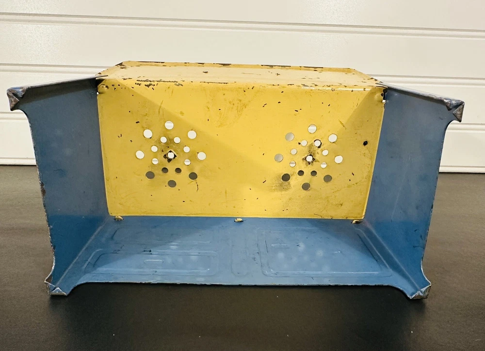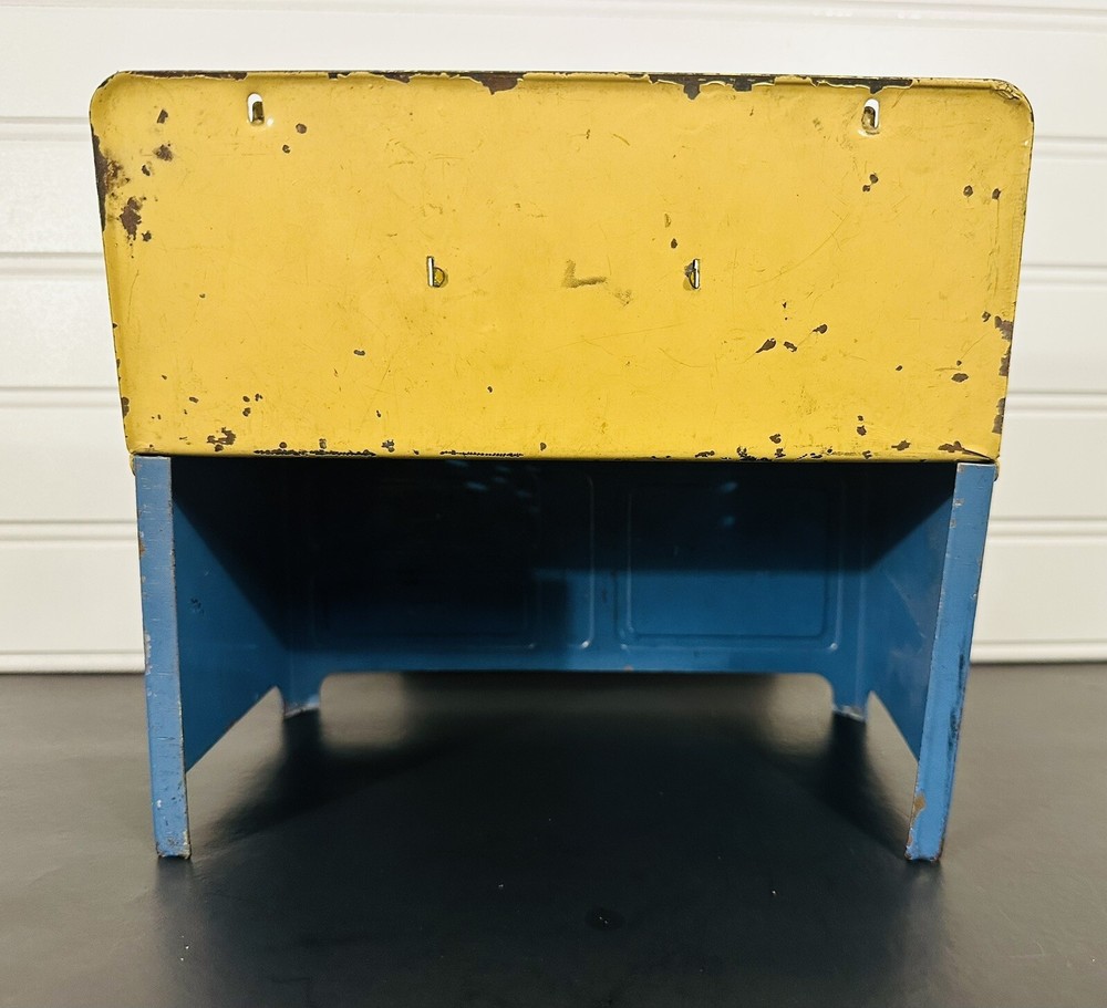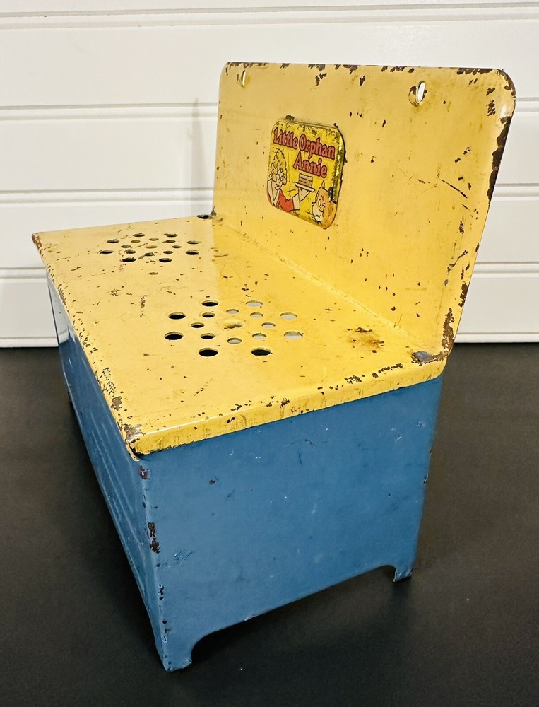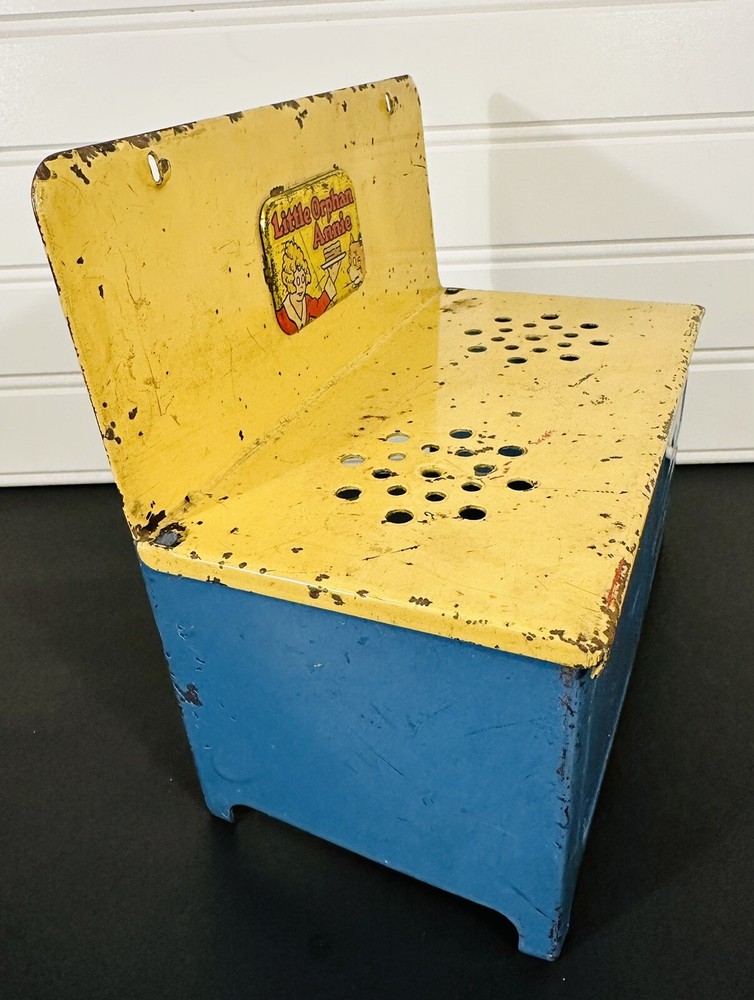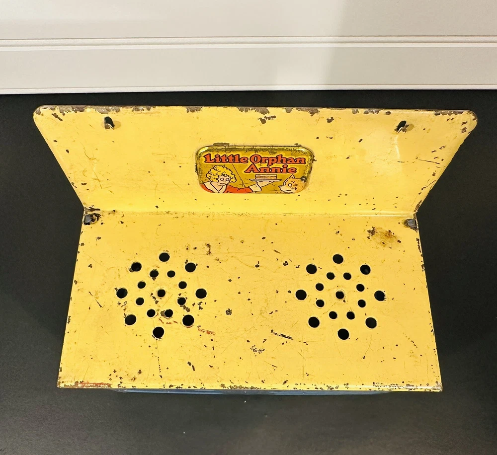 This vintage Little Orphan Annie metal stove is a charming addition to any collection. With its blue and yellow color scheme, it's sure to catch the eye of any toy enthusiast. Made in the 1930s, this piece is a true antique and a wonderful example of the character's beloved design. The brand and character family are, of course, Little Orphan Annie, making this a must-have for fans of the classic comic strip. The stove is ready for display or play.