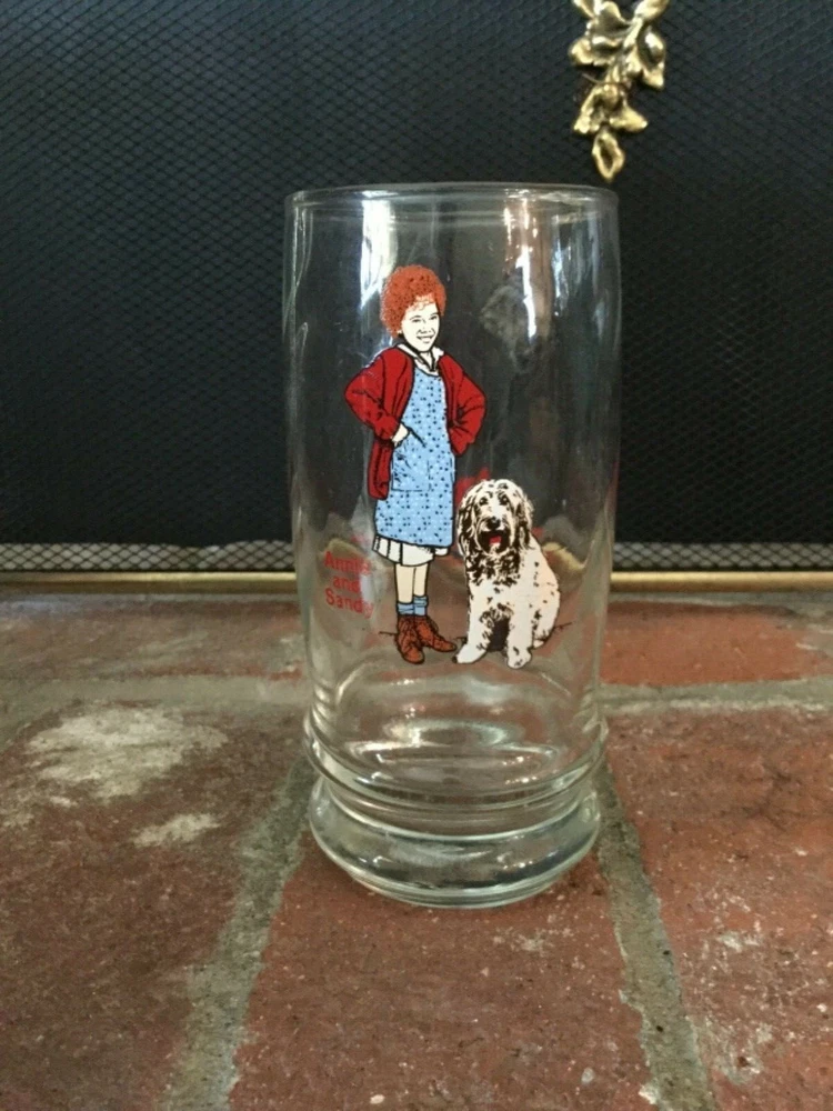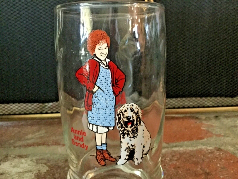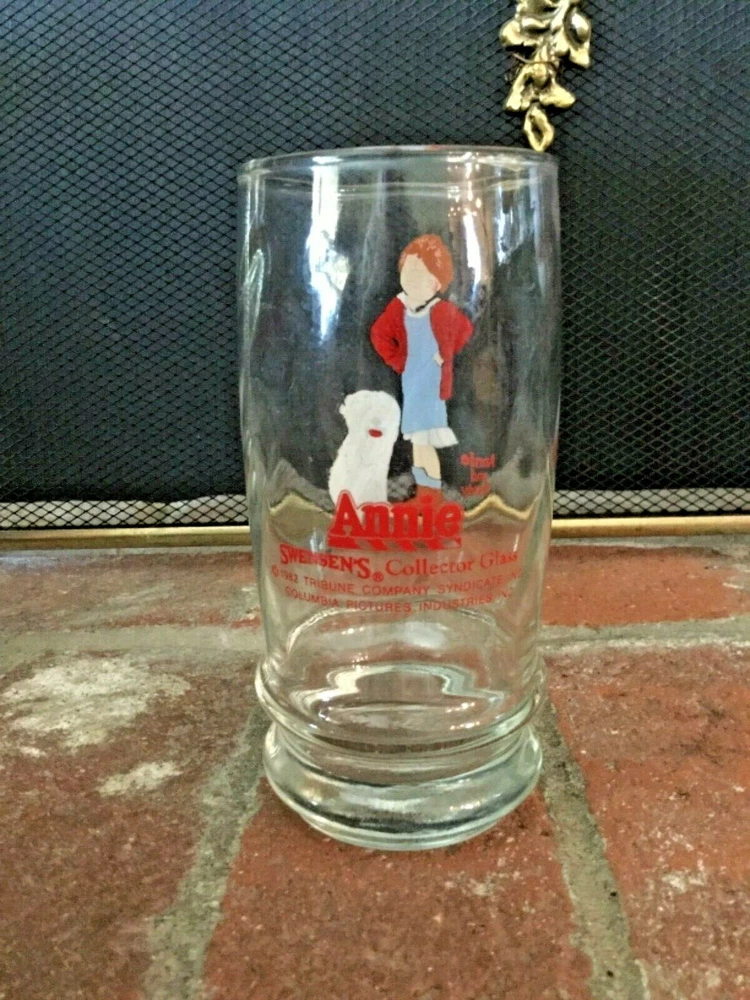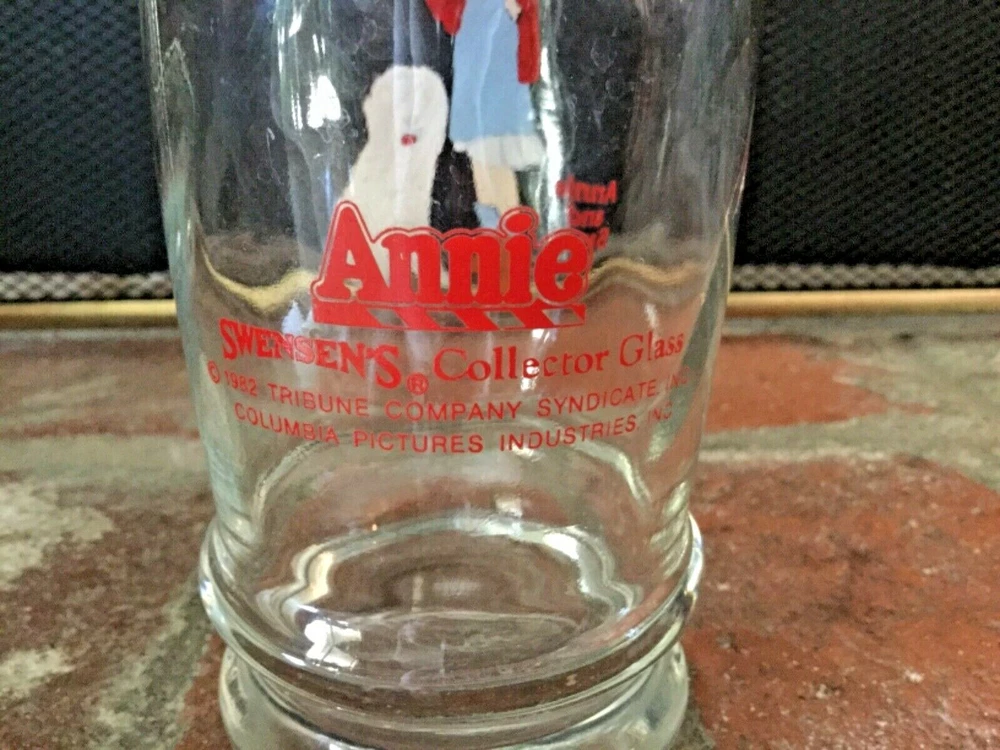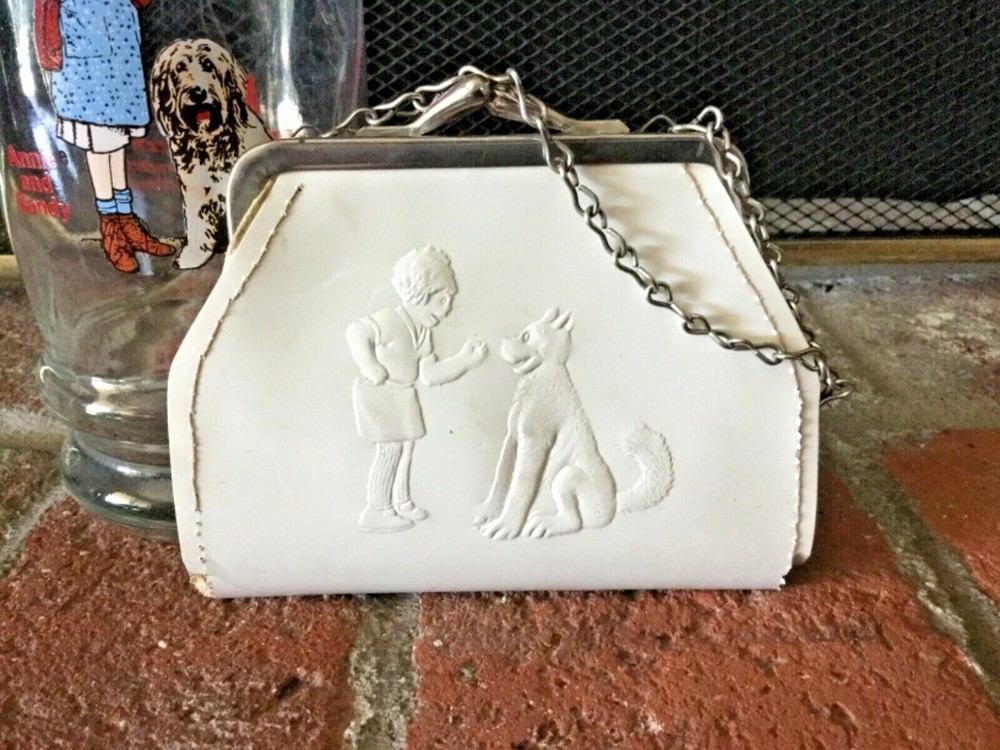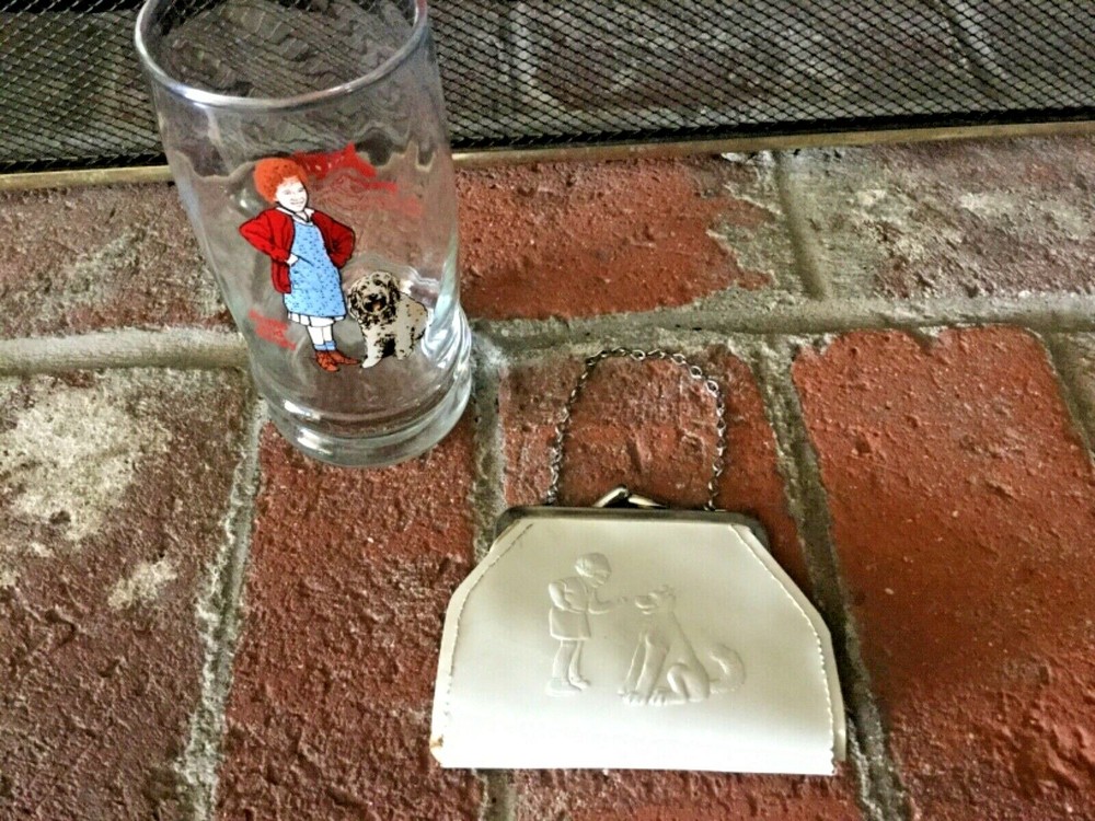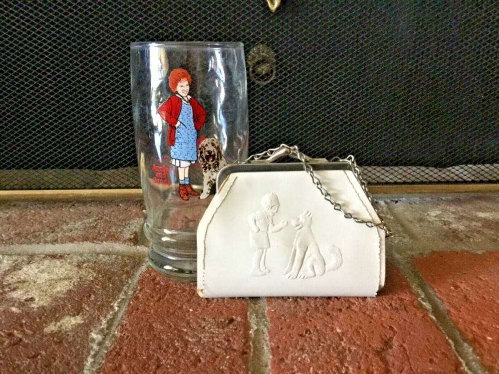 0's.This is a wonderful pair of vintage Little Orphan Annie collectibles. Included is a beautiful patent leather child's purse from the 1930's. It is white and measures 4.5 inches wide, 4 inches tall and the chain strap measures 3.5 inches. The front of the bag is embossed with an image of Annie and Sandy. The back is solid white. Overall, it is in good vintage condition for it's age. the only issues are on the bottom corners where the patent leather is worn or missing. Please see photos. Also included is a Annie and Sandy drinking glass from Swensen's dated 1982. It is from the 1982 movie and measures 6 inches tall. It is in excellent condition. Thanks!