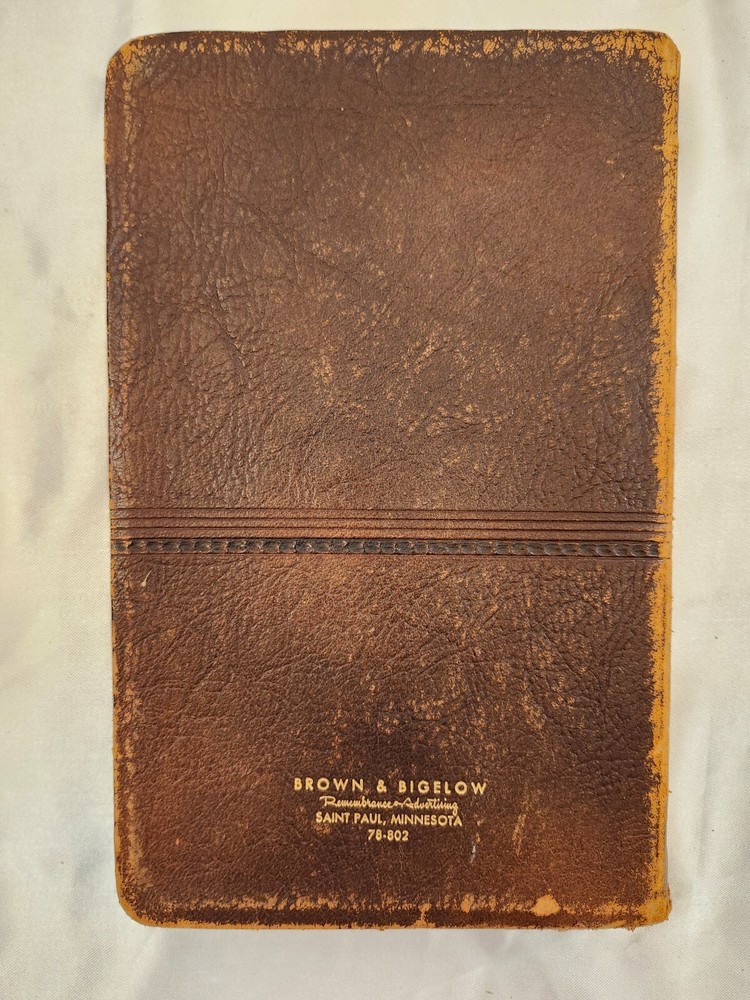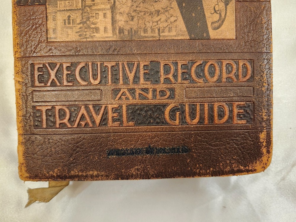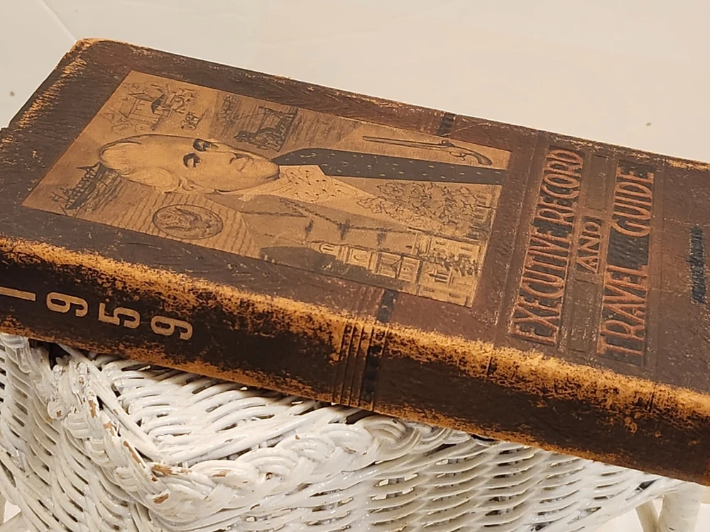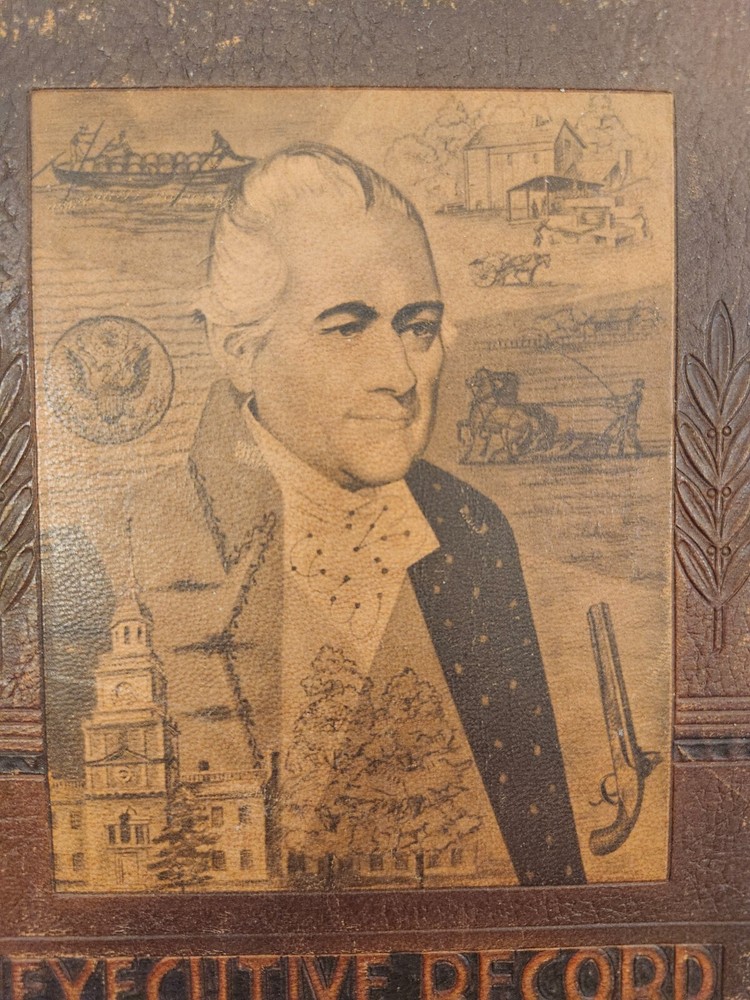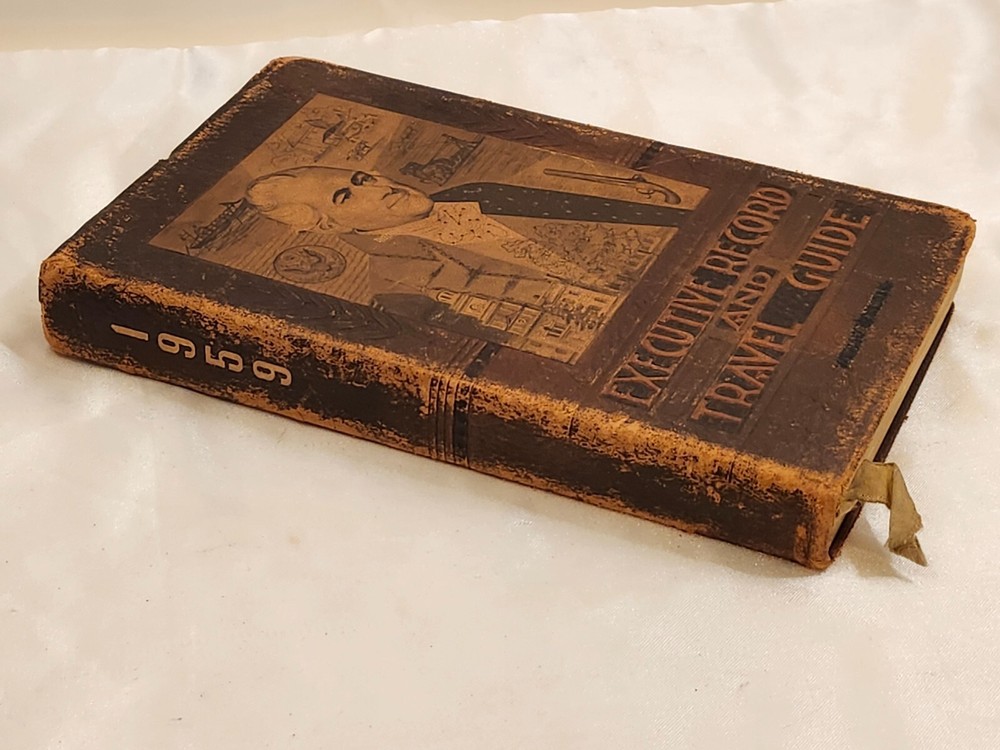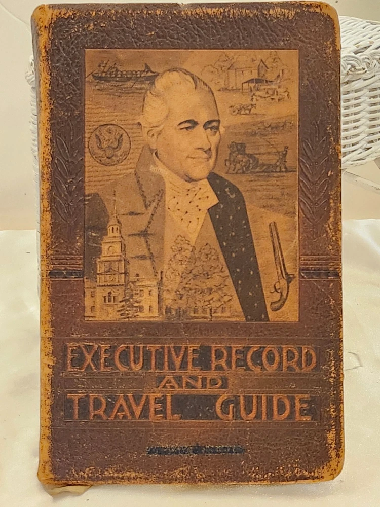 Vintage 1959 Leather Bound Executive Record & Travel Guide Ilustrated Planner. The front says- Executive Record & Travel Guide 1959 and the back says- Brown & Bigelow, Remembrance Advertising, St. Paul, Minnesota, 78-802. This AMAZING book features: Calendar Travel Maps Appointments Records Information Travel Guide Color & Black/ White Pages Original Bookmark still attached The cover, featuring a portrait of Alexander Hamilton & is embossed at the bottom with the name- William J Morris. Leather Bound with the year in gilt on the spine. Perfect for Historians, Historical Collectors, Alexander Hamilton Fans, Brown & Bigelow Collectors, Book Collectors, Display Book, Gift for a Favorite Friend! Condition is preowned with no rips or missing pages. Rubbing & general wear to the leather on the outside & paper pages on the inside. The spine shows a little extra wear. Photos are showcasing the handful of pages with writing. Prop not included- book only. Photos ARE the description. T6