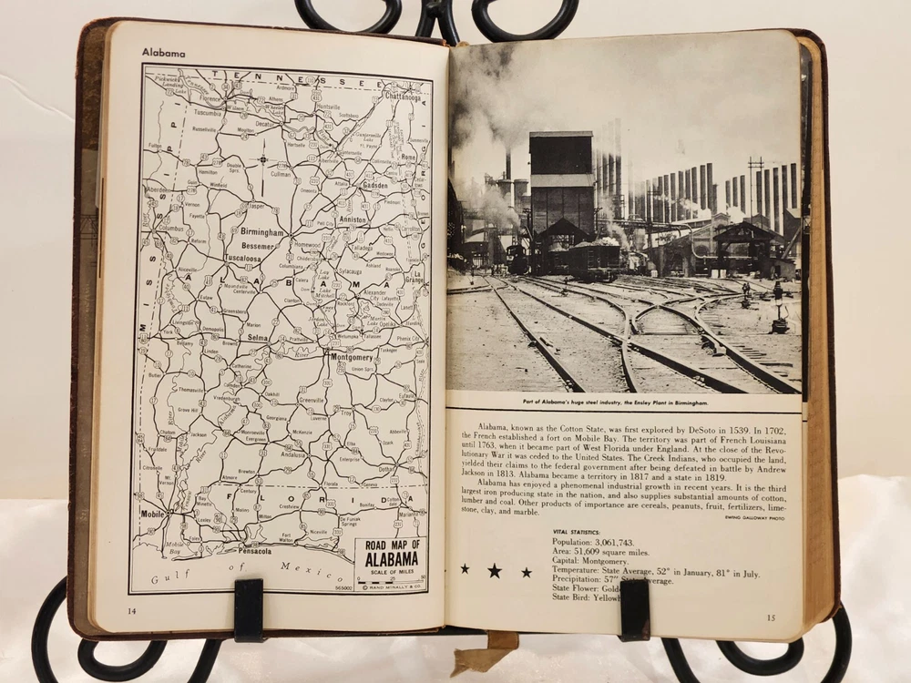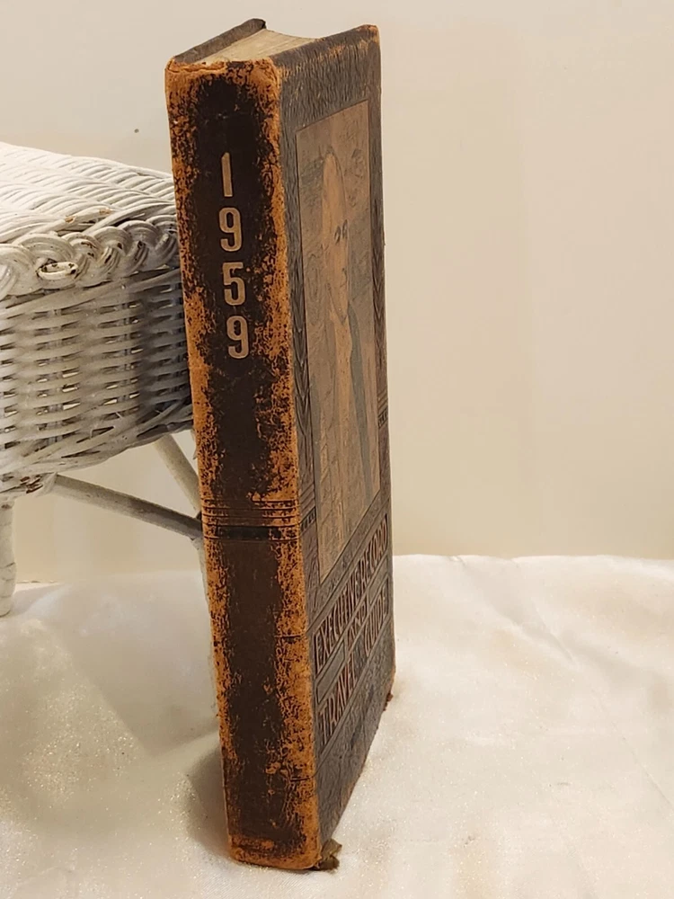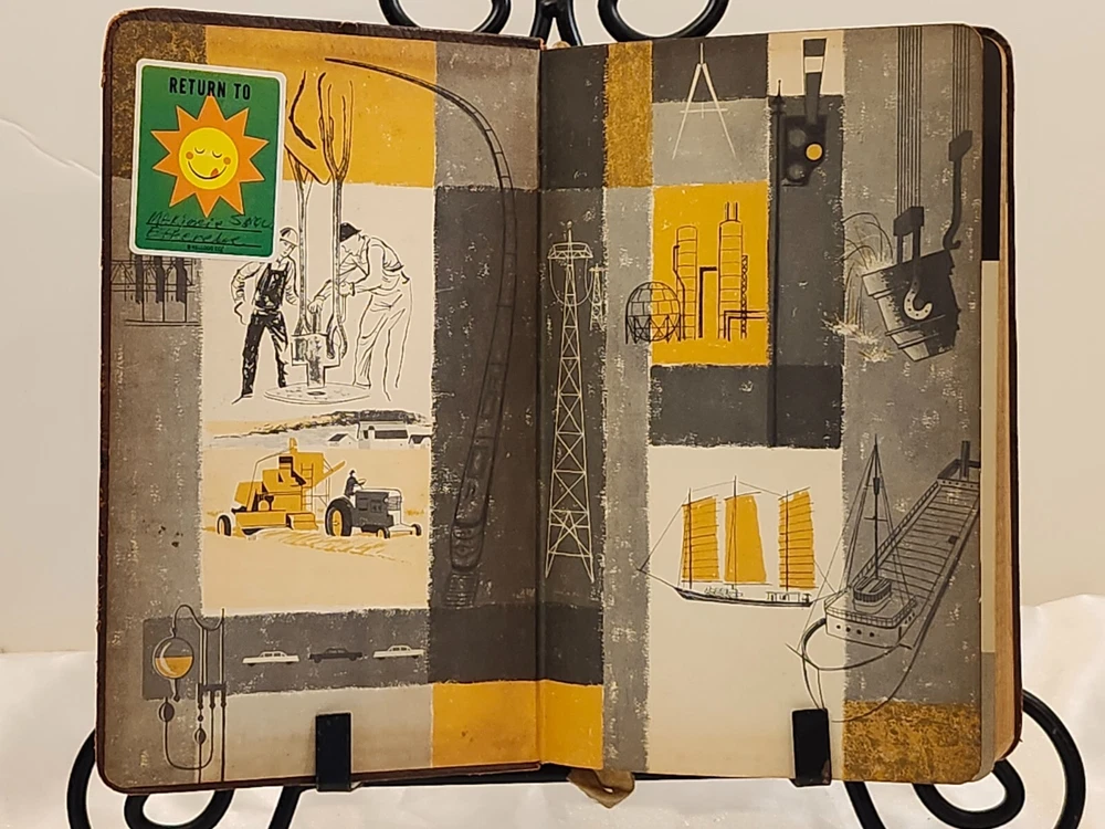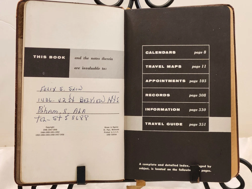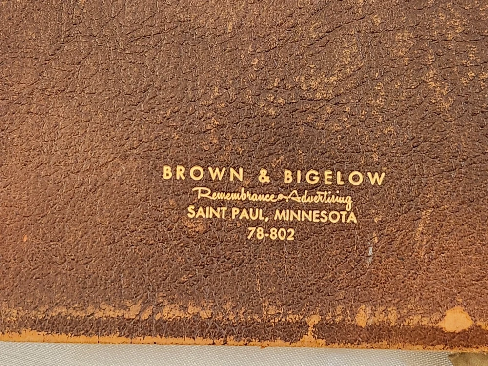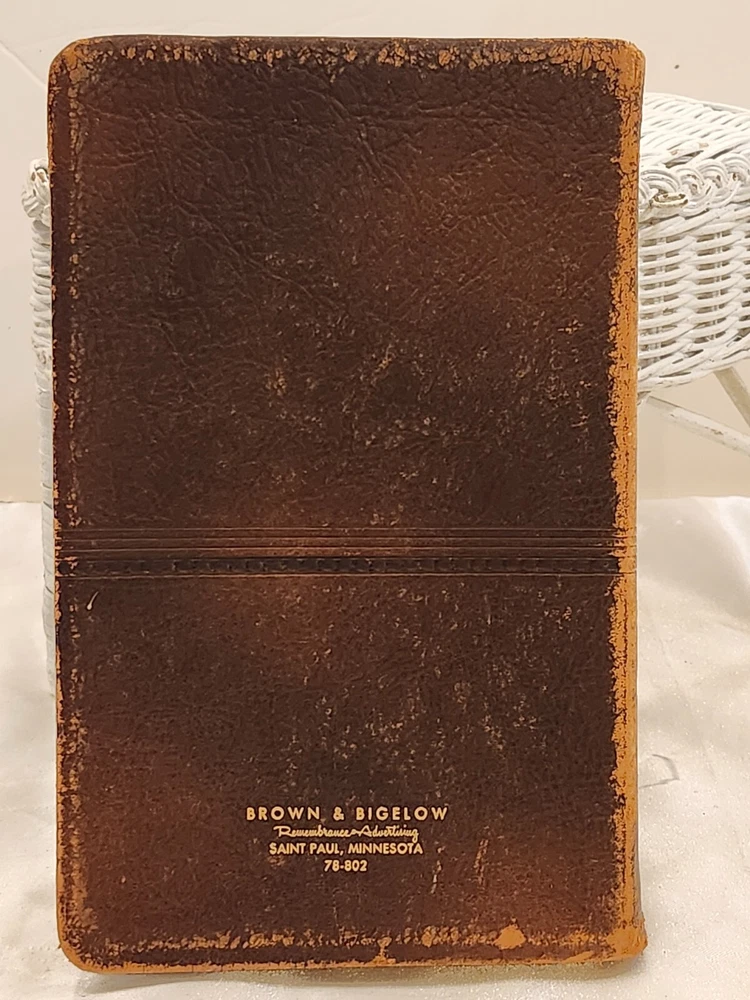 Vintage 1959 Leather Bound Executive Record & Travel Guide Ilustrated Planner. The front says- Executive Record & Travel Guide 1959 and the back says- Brown & Bigelow, Remembrance Advertising, St. Paul, Minnesota, 78-802. This AMAZING book features: Calendar Travel Maps Appointments Records Information Travel Guide Color & Black/ White Pages Original Bookmark still attached The cover, featuring a portrait of Alexander Hamilton & is embossed at the bottom with the name- William J Morris. Leather Bound with the year in gilt on the spine. Perfect for Historians, Historical Collectors, Alexander Hamilton Fans, Brown & Bigelow Collectors, Book Collectors, Display Book, Gift for a Favorite Friend! Condition is preowned with no rips or missing pages. Rubbing & general wear to the leather on the outside & paper pages on the inside. The spine shows a little extra wear. Photos are showcasing the handful of pages with writing. Prop not included- book only. Photos ARE the description. T6