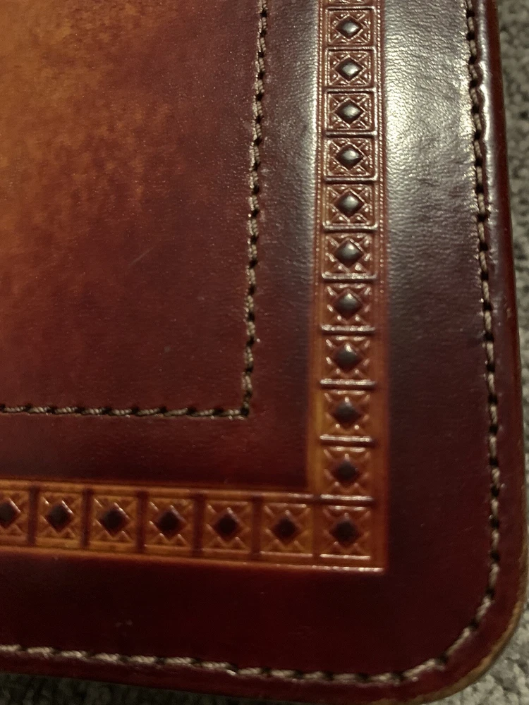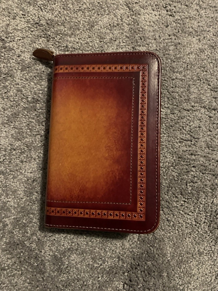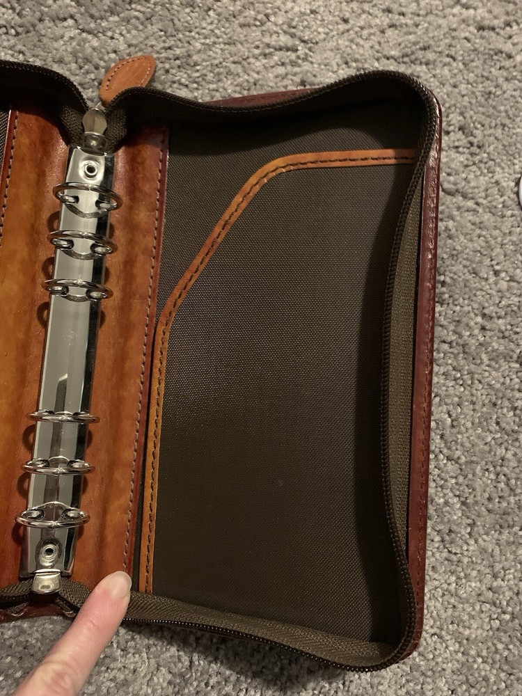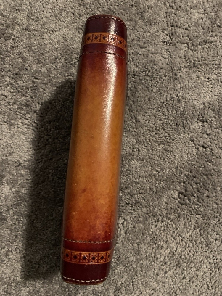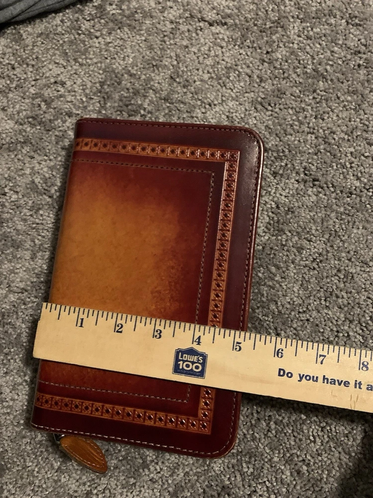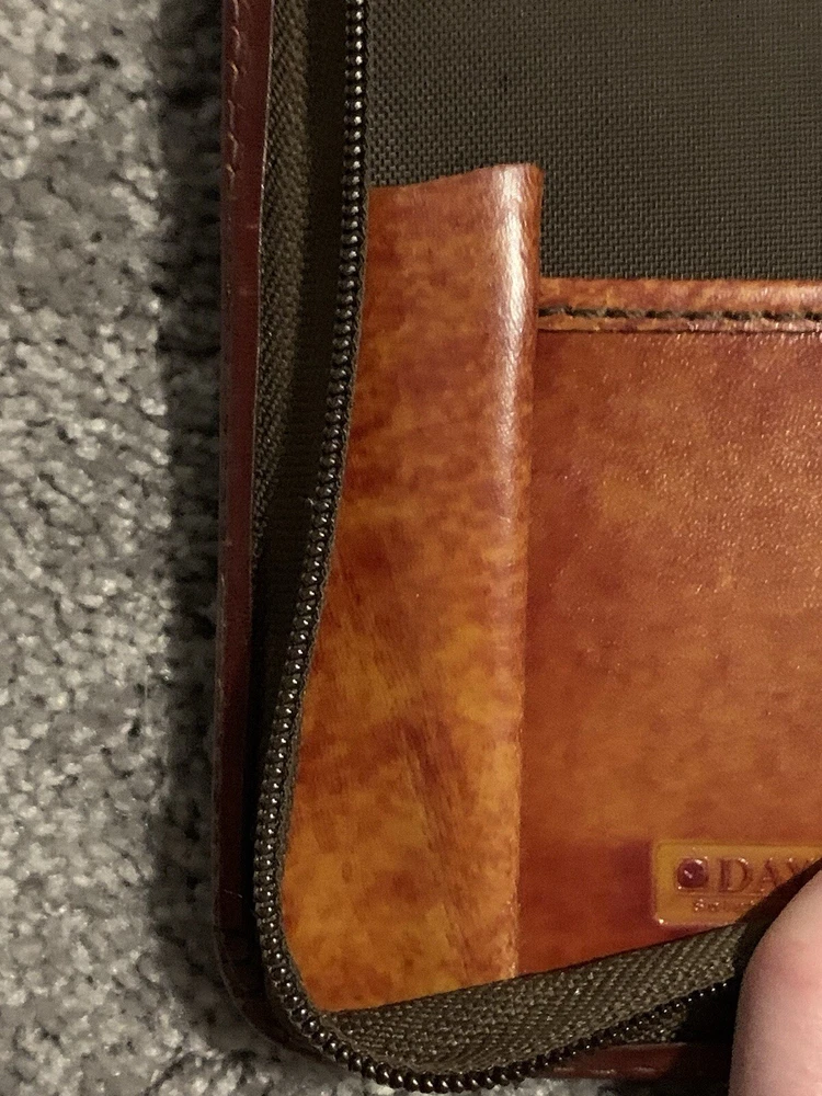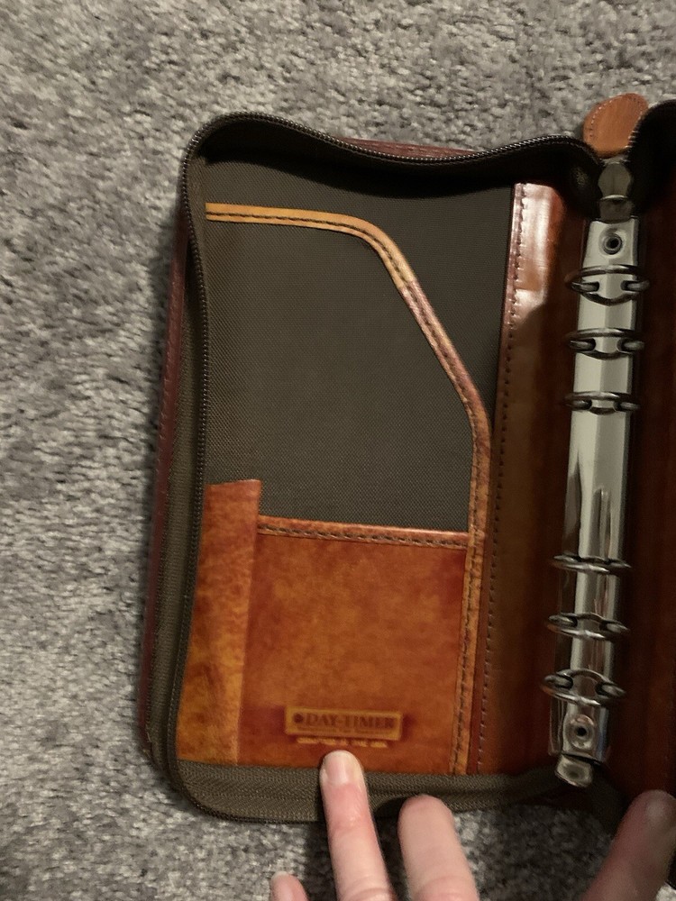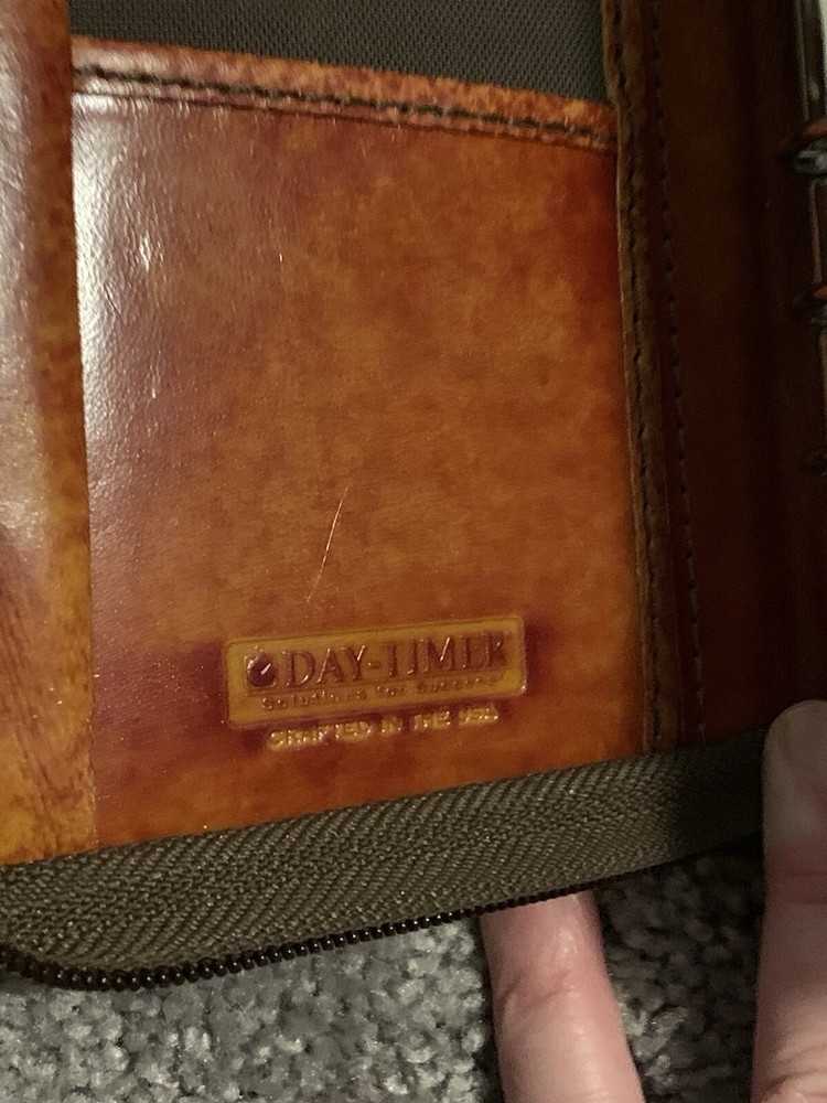 Excellent condition Zipper around with leather pull Tooled leather The Vintage Day-Timer is a medium-sized ring-bound planner with a leather exterior and interior that features intricate tooling. It includes six rings for organization and a zip closure for security. The planner offers both daily and monthly formats, making it ideal for keeping track of appointments and tasks in a stylish and timeless manner. Personalization options are not available for this classic Day-Timer planner.