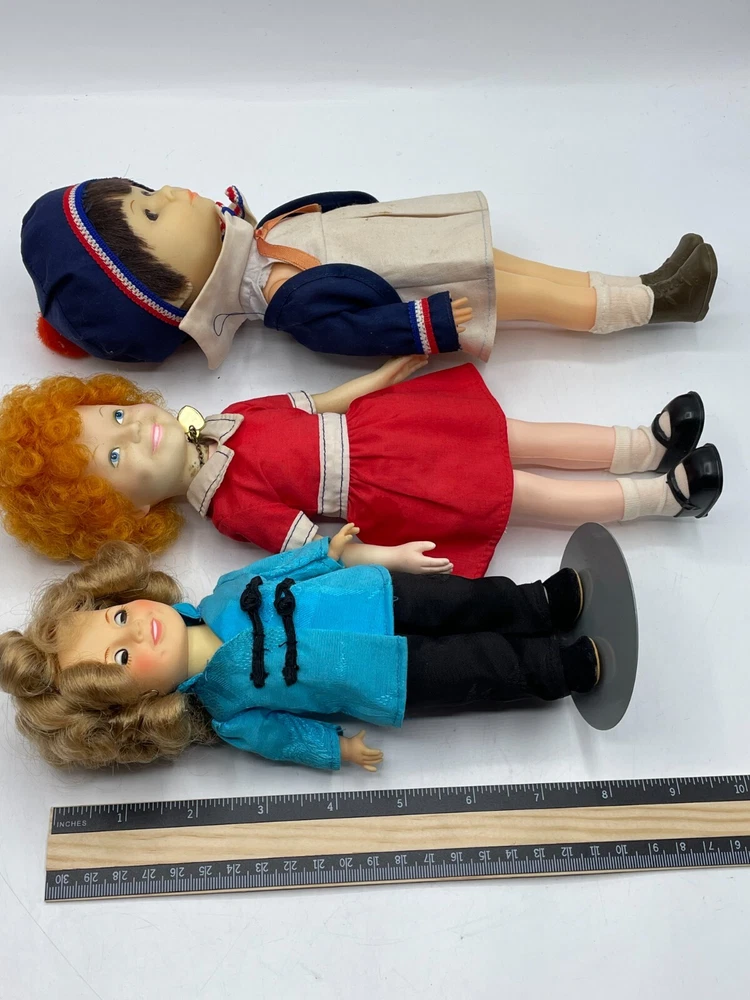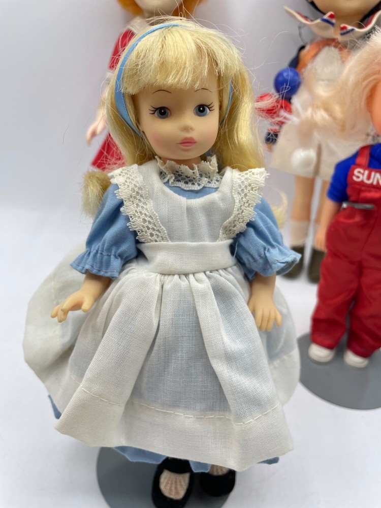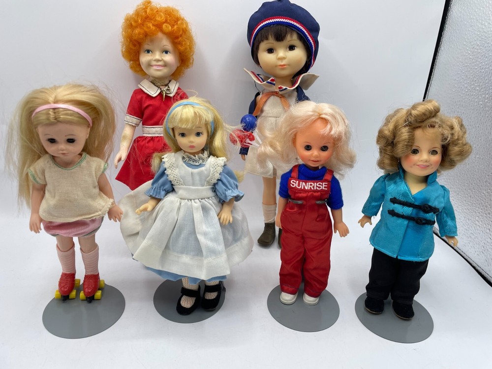 Vintage Doll Lot Horsman Alice in Wonderland Annie Ginny Sunrise Shirley Temple. Beautiful licensed Doll Lot! Includes: Horsman Alice in Wonderland, Little Orphan Annie, Ginny on roller-skates, Sunrise in America, Shirley Temple, Little Miss Marker. All dolls are vintage. Wear as shown. Annie's neck is marked up by her necklace. 4 of the dolls include doll stands. Sold as is. Please look at all photos and reach out to us if you have any questions. Thank you.