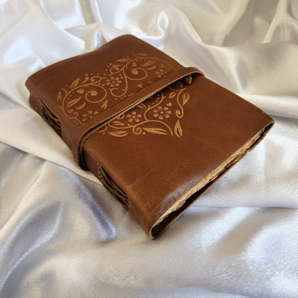 1. This Vintage Heart Embossed brown leather journal is a stunning piece that combines elegance and functionality. Crafted from high-quality brown leather, this journal features a beautiful floral design that adds a touch of sophistication. The leather lace closure ensures that your thoughts and sketches are kept safe and secure. 2. Perfect for jotting down notes, sketches, or even dreams, this notebook is versatile and can be used as a diary, sketchbook, or dream journal. With 200 deckle pages measuring 7 by 5 inches, there is plenty of space for all your creative endeavors. Whether you're a writer, artist, or simply someone who loves to document their thoughts, this leather journal is the perfect companion. 3. This Leather Lace Writing Journal makes for a thoughtful and personalized gift for a loved one. Whether it's for a birthday, anniversary, or even a wedding gift, this journal is sure to be cherished for years to come. Give the gift of creativity and inspiration with this beautifully crafted leather diary.