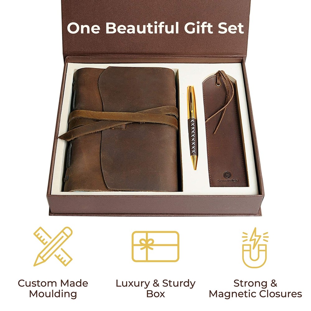 Vintage Leather Bound Journal 8" x 6" - Handmade Gift Set w/ Bookmark & Pen RUSTIC DESIGN: Achieves a unique and distressed look when scratched and features decorative stitching for added charm. Coated with special natural oils that make handling a joy. Plus, it has a wonderful authentic leather smell that inspires you to write daily. QUALITY CREAM PAPER: 300 premium unlined multipurpose sheets for notes, daily plans, sketches, inspiring ideas, memories and more. Zero bleed through with fountain pens. Not refillable. PERFECT SIZE: 8x6" to suit a wide range of writing styles. We also offer many other sizes and styles of journals, including refillable journals. There's something for everyone! UNIQUE GIFT SET: Handmade leather journal and matching bookmark with designer pen and hidden pen holder. Presented in a finely crafted presentation box. A timeless gift for someone special who loves to write. PREMIUM LEATHER: Crafted with delicate yet super tough buffalo leather, including a long strap that secures the notebook firmly. Our leather is thicker than competitors and offers lifetime durability with lasting softness. Shipping We offer FREE shipping on all orders! We ship within Three business days of payment, usually sooner. We use a selection of shipping services such as UPS, FedEx, USPS etc. We only ship to the lower 48 states, no APO/FPO addresses or PO Boxes allowed. Local pickups and combined shipping options are not provided at this time. Return You can return a product for up to 30 days from the date you purchased it. Any product you return must be in the same condition you received it and in the original packaging. Please keep the receipt. Payment We accept payment by any of the following methods: PayPal & Credit Cards Thrugh Ebay Please pay as soon as possible after winning an auction, as that will allow us to post your item to you sooner! Feedback Customer satisfaction is very important to us. If you have any problem with your order, please contact us and we will do our best to make you satisfied. Contact Us If you have any queries, please contact us via ebay. We usually respond within 24 hours on weekdays. Please visit our eBay store to check out other items for sale! Thank you for shopping at our store.