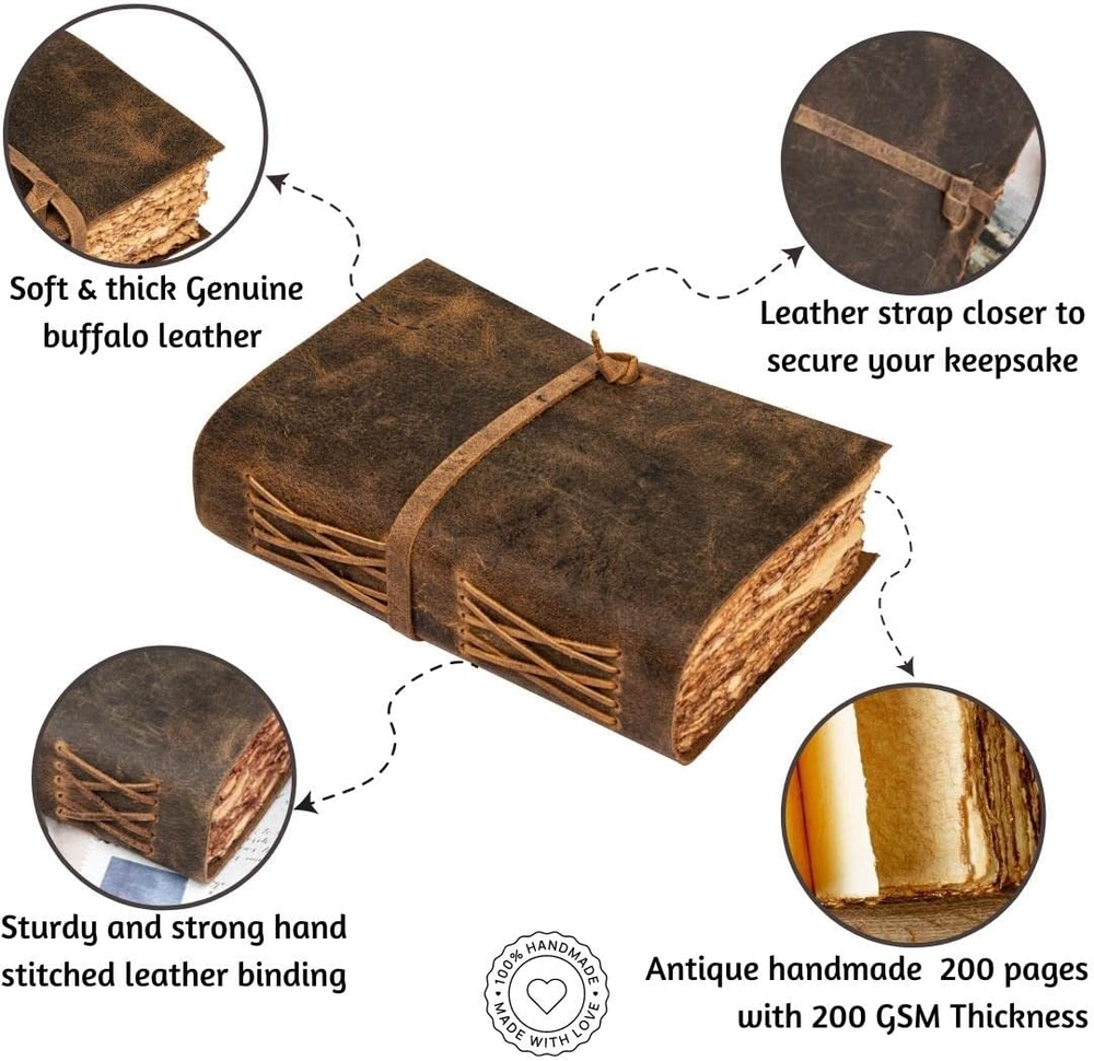 Soft Supple Thick Genuine Leather - The Leather Journal Is Made From Naturally Tanned Full Grain Leather Which Feels And Smells Amazing. It'S Soft And Very Comfortable In The Hands. Don'T Be Fooled With Competitors Using Cheap Substitutes, This Is The Real Deal. Vintage Paper - Vintage Journal Is Made Of Unique Vintage Paper Which Looks Like It Was Pulled From History. You Will Love The Old Looking Handmade Cotton Paper (200 Pages) Which Is Unique To Our Vintage Journals. Use Any Kind Of Pen - Sketch, Doodle, Write On Your Journal Notebook With A Calligraphy Pen Fountain Pen, Brush Pen, Ball Pen, Acrylic Colours, Watercolor And Many More. Stylishly Medieval- Ancient Looking Rustic Cotton Paper Combined With The Beauty Of Distressed Leather, Hand Stitched By Artisans, Creates A Keepsake You Will Cherish Forever. Makes A Great Gift For The Men, Women, And Wiccans In Your Life! Sturdy Binding, Leather Wraparound - Sturdy Hand Stitched Binding To Make Sure That No Paper Comes Out Loose.The Leather Wraparound That Slips In Will Make Sure That The Papers Inside The Journal Are Safe And Secure. Product Description