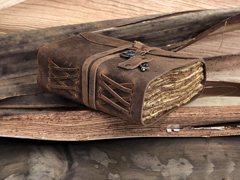PERFECT HANDCRAFT JOURNAL - Made from 100% Buffalo Leather with Antique Deckle Edge Paper. This Book Is Hand Crafted by Artisans Working with Leather for Decades. The Color of The Journal Is Very Unique Vintage Brown. USE ANY KIND OF PEN - Write/sketch/doodle on your journal notebook with a Fountain Pen CalligraphyPen, Ball Pen, Brush Pen, Acrylic Colours. DIMESNIONS - (8” X 6” X 1.5”) With Uncut Deckle Edge Paper, Easily Handle Notebook, You Can Fit with Minimum Space, Easily Handle in Long Journey. Once You Have Used It You Will Feel Like You Have the Best Journal in the World. IDEAL USE AND PERFECT GIFT – Perfect Use for Business Executive, Poetry Work, Journalists, Craftsman, Writer. A Lovely Treat for Your Loved Ones for An Anniversary, Birthday or Graduation Present, Or for Someone Starting A New Adventure and A Perfect Gift for Those Who Love Vintage One. BINDING AND KEY BOOKMARK – Binding Is Made by Hand Stitching Which Having Enough Strength That the Paper Never Comes Out. The Key Is Very Antique Can Be Used as Bookmark. The Leather Strap Wrap Around the Journal Is Complete Solution for Paper Safety and Open-Close the Journal. The Journal Made by High Quality Buffalo Leather and Paper Have Been Used Is Vintage Historical Paper Which Is Very Durable.