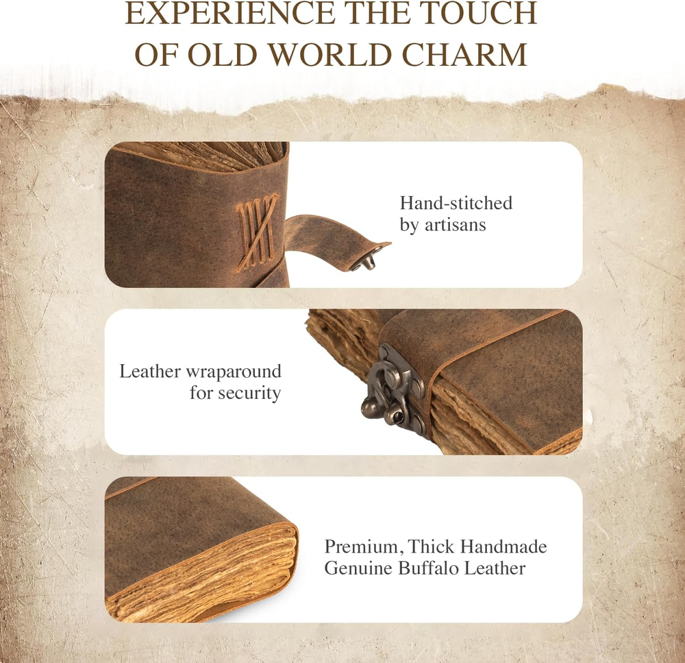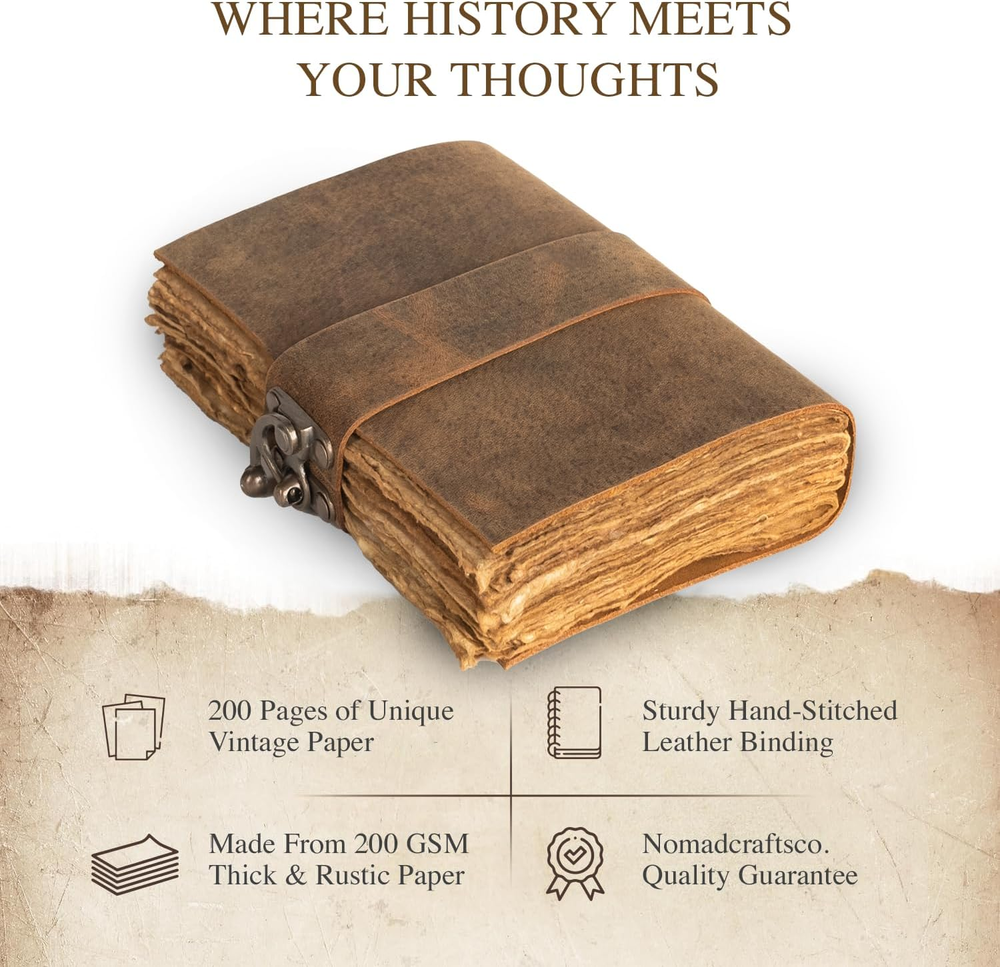 Menu Other Items Feedbacks About Us Contact Us Add To Favorites Vintage Leather Journal with Gift Box - Old Leather Bound Grimoire, Sketchbook, and Notebook - Perfect Leather Journals for Women and Men - Elegant Vintage Book for Writing and Drawing VINTAGE LEATHER JOURNAL WITH GIFT BOX : Capture memories in style with this vintage leather scrapbook, perfect for creating a unique junk journal book. This vintage journal is made from genuine buffalo leather, naturally tanned with oils and chrome-free. Each daily journal, crafted from cruelty-free leather, varies in look and shade, producing a truly unique item. LEATHER SKETCHBOOK WITH VINTAGE LOCK : This sketchbook combines elegance and functionality with a belt wrap-around closure and an antique brass lock, keeping your pages safe and secure. The hand-stitched binding is sturdy, ensuring that no paper comes loose, so you can sketch and journal with peace of mind. 200 GSM WATERCOLOR PAPER : Ideal for artists, writers, and vintage enthusiasts, this leather-bound journal is a must-have accessory. It features handmade deckle-edged paper crafted from recycled cotton waste, ensuring a no-bleed experience. This mixed media sketchbook is perfect for writing, watercolor, acrylics, pastels, and all dry and wet mediums. Use it as a sketch pad, watercolor sketchbook, and more THE PERFECT GIFT: This vintage-inspired journal makes an exquisite and timeless gift for a wide range of recipients, including women, men, teen girls, boys, and beloved grandparents. It’s an ideal present for anniversaries, birthdays, graduations, or for anyone embarking on a new adventure. Treat your loved ones to this charming keepsake. NOMADCRAFTSCO. : Buy our vintage journal with confidence, thanks to our 100% satisfaction —if you're not happy, we'll your money. Enjoy the timeless charm of this beautifully crafted journal. Product Description Item Specification Item model number NOMAD-LOCKBELT-BOX-VB-10-7 Package Dimensions 11.14 x 8.07 x 2.48 inches Style Vintage Leather Journal Number of Items 1 Color Rustic Brown Pages 200 Pages Cover Material Leather Sheet Size 10 x 7 inches Manufacturer Part Number NOMAD-LOCKBELT-BOX-VB-10-7 Item Weight 1.85 pounds Theme Book Ruling Ruled Ruling Type Ruled Special Feature Lock Size 10 Inches x 7 inches Dimensions Shipping Returns Additional Info Product Dimensions: 8.07 inches x 11.14 inches x 2.48 inches. Weight: 1.85 lb Fast shipping is very important for us. Our standard shipping service is FREE. Your order will be shipped within 1-3 business days upon full payment received. Most items are delivered within 3-5 business days, however, please allow 3-10 business days. We are shipping only to USA. We only ship to the confirmed Paypal address. We reserve the right to cancel any order for any reason at any time. We are not responsible for undeliverable addresses. We offer a 30 day return policy from checkout winning date. Your satisfaction is guaranteed! If for any reason you are unhappy with your item, just return it within 30 days for a full refund, minus shipping cost. Please contact us prior to initiating a return so that we can issue you a refund authorization. Items defective upon receipt must be packaged in their retail packaging as if new and returned with a detailed description of the problem. Return shipping fees are not refundable. We reserve the right to decline any returns if the above guidelines are not followed. All of our items, unless otherwise stated, will only run on 120 volts. Please check to make sure your country complies with these specifications. If you have a problem or question regarding your transaction please contact us before leaving any type of feedback. We will work with you to resolve any problem you may have.