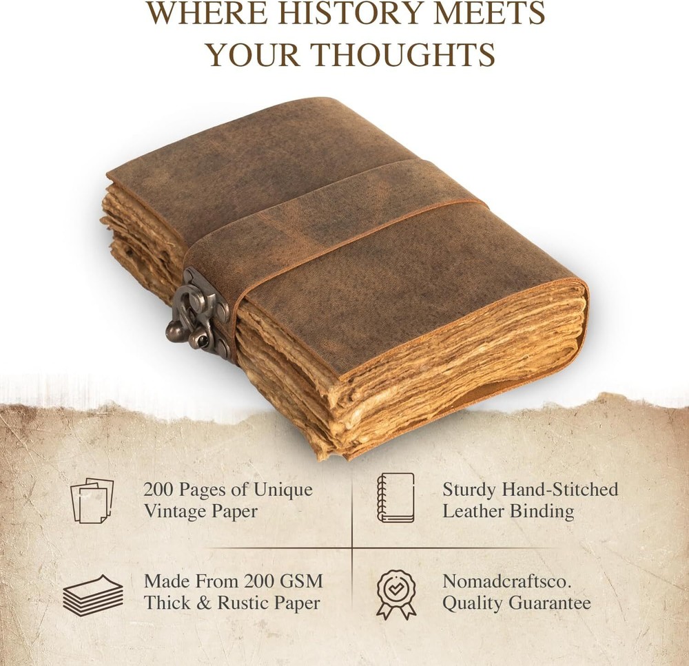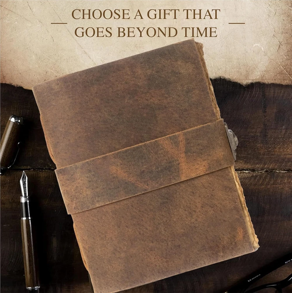 About this item VINTAGE LEATHER JOURNAL WITH GIFT BOX: Capture memories in style with this vintage leather scrapbook, perfect for creating a unique junk journal book. This vintage journal is made from genuine buffalo leather, naturally tanned with oils and chrome-free. Each daily journal varies in look and shade, producing a truly unique item. LEATHER SKETCHBOOK WITH VINTAGE LOCK: This sketchbook combines elegance and functionality with a belt wrap-around closure and an antique brass lock, keeping your pages safe and secure. The hand-stitched binding is sturdy, ensuring that no paper comes loose, so you can sketch and journal with peace of mind. 200 GSM WATERCOLOR PAPER: Ideal for artists, writers, and vintage enthusiasts, this leather-bound journal is a must-have accessory. It features handmade deckle-edged paper crafted from recycled cotton waste, ensuring a no-bleed experience. This mixed media sketchbook is perfect for writing, watercolor, acrylics, pastels, and all dry and wet mediums. Use it as a sketch pad, watercolor sketchbook, and more. THE PERFECT GIFT: This vintage-inspired journal makes an exquisite and timeless gift for a wide range of recipients, including women, men, teen girls, boys, and beloved grandparents. It’s an ideal present for anniversaries, birthdays, graduations, or for anyone embarking on a new adventure. Treat your loved ones to this charming keepsake. Product dimensions: 14.25 x 10.55 x 2.56 inches