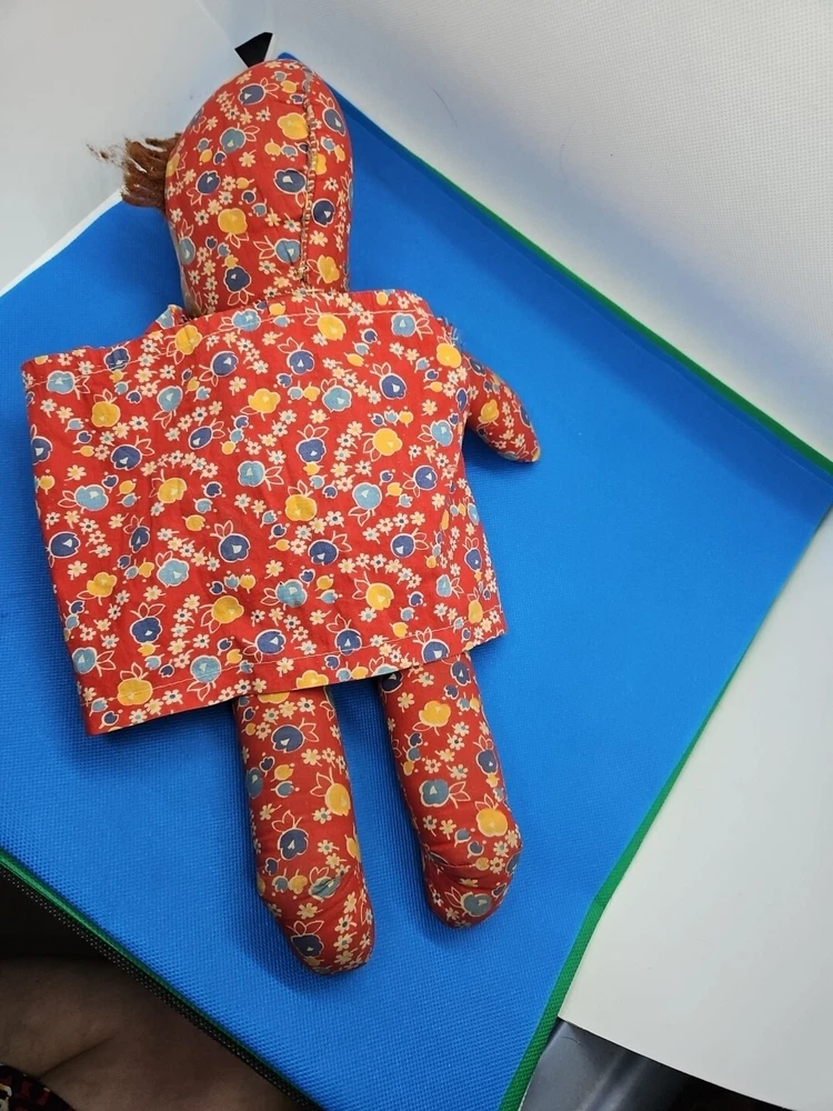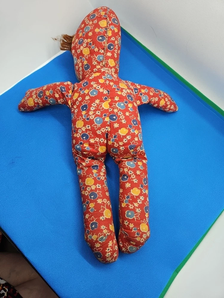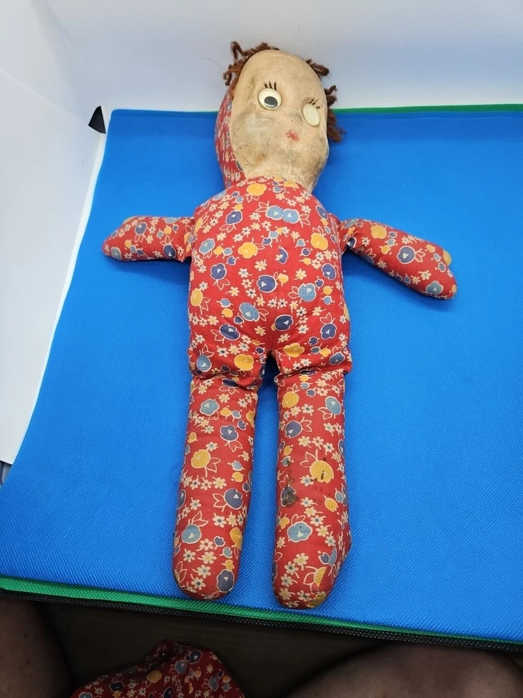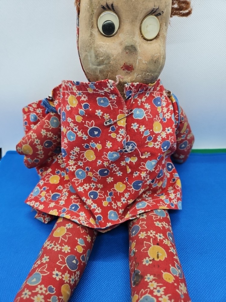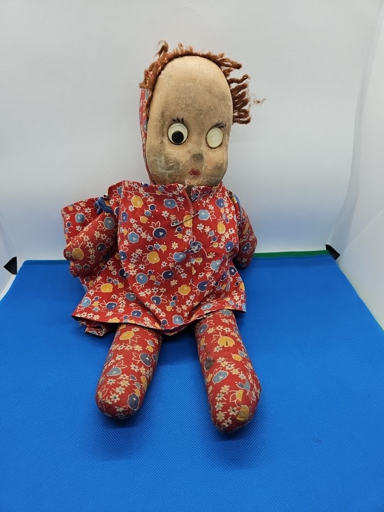 For sale is a vintage 15 1/2" tall cloth doll with an oil cloth face and yarn hair. Her eyes are "Googly" - one black spot that makes an eye work is gone. The elastic on the dress that would go around her neck is gone. Please look closely at the pictures and email me with any questions. I will combine shipping. Thank you!