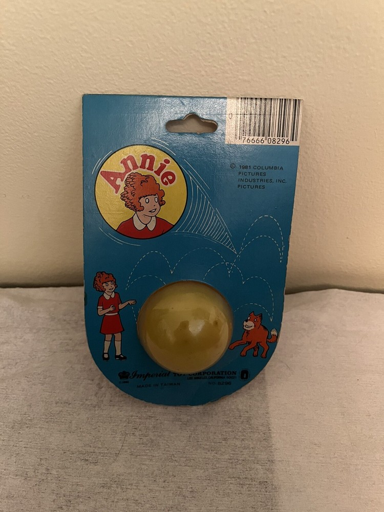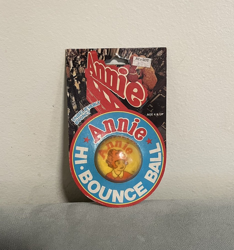 I am selling a Vintage Sealed 1981 Annie Movie Hi Bounce Ball Toy made from Imperial corporation. There Pic N Save original sticker on the top corner and this originally cost 39 cents. The card stock on top leans to one side and the item is a little dirty. Thank you for looking and please check out my other listings. I have a lot of other items which include Disney, vintage, plush, children's toys and more!!!