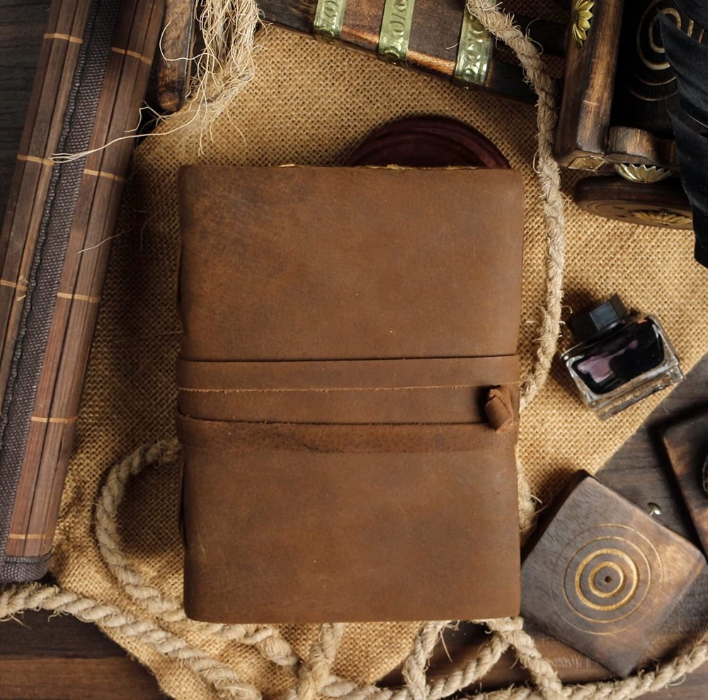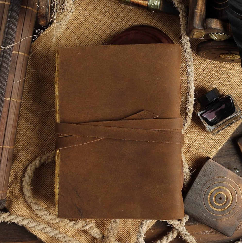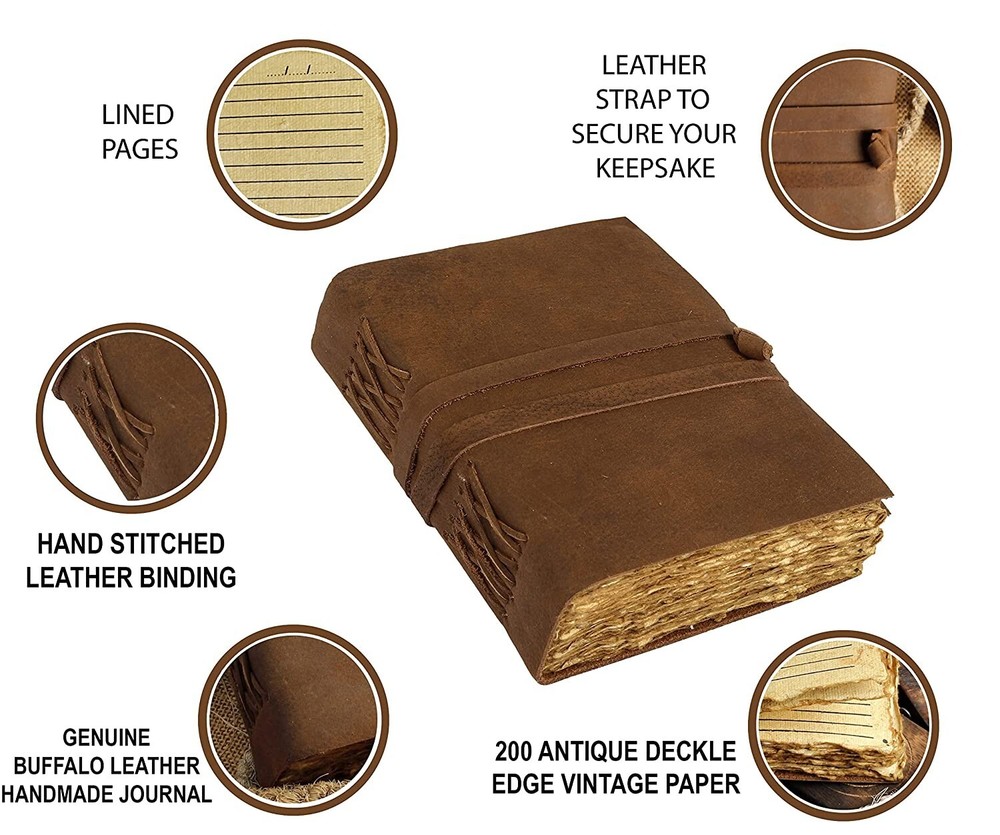 *Product details Vintage Style Personalized Leather Journal - Antique Handmade Bound Journal With Deckle Edge Paper For Men And Women- Leather Sketchbook Customized size Size - 7x5 inches (200 on both sides) Size - 8x6 inches (200 on both sides) Paper - 100 pages (200 on both sides) Paper - Pure Cotton Hand Made Plain Paper (Unline) Leather Colour: Brown and dark brown Leather - Full Grain Leather (Best Quality) Soft and durable natural handmade leather Quality Metal Hardware (Brass metal) Ideal gift for writers, poets, artists etc. Tied with traditional sewing methods *Materials: Full Grain Leather, Antique Brass Hardware, Handmade Sheets, Natural Leather, Handmade Paper, Unlined Paper, Leather Journal, Leather Diary, Leather Unlined Diary, Blank Paper Diary, Leather Cover, Notebook, Leather Sketchbook Artist Sketchbook, Photo Album, Traveling Notes, Business Executive, Logbook, Poetry Work, Journalist, Food Planner, Instagram Scrapbook, Bible Journalism, Documenting Your Spiritual Journey, A Dream Journal, A Book of Shadows, Grimoire, Sketchbook, Idea Book for Ideal , prayer book, gratitude journal, a daily journal or anything else you can think of. Luxury, Handmade, Fair Trade and Eco-Friendly Capture and share your thoughts before you walk away Handy for handwriting, drawing or sketching and compact to carry in your bag hpprox 100 sheets/200 pages of online paper Hand crafted non-bleeding paper made from recycled cotton that is chemical free Due to the Coptic binding process, this magazine is not refillable - it is unique in its kind! Hand-stitched Coptic leather binding secures pages firmly Suitable for all pens and pencils easy to care for Wipe slightly dry with a tissue, or rub in circular motions to reduce scratches and dust Shipping&Delivery Free worldwide shipping on all products. USP Inspired by distressed vintage style Handcrafted by Me and Skilled Village Artisans Fair trade factory price (no middleman) GUARANTEED HIGH QUALITY SELECTED LEATHER y friendly (no chemicals used) Handmade recycled cotton pit paper Welcome to the world of Leather Diary