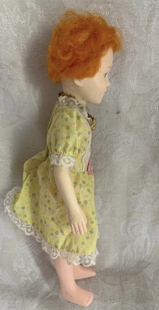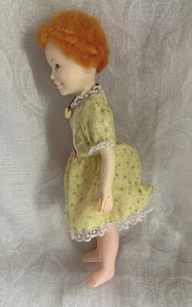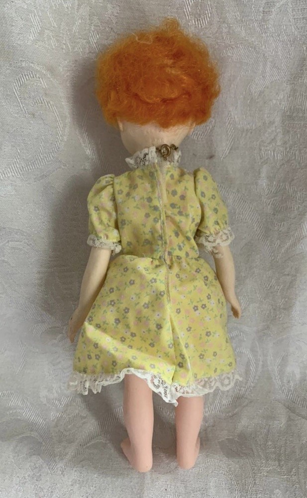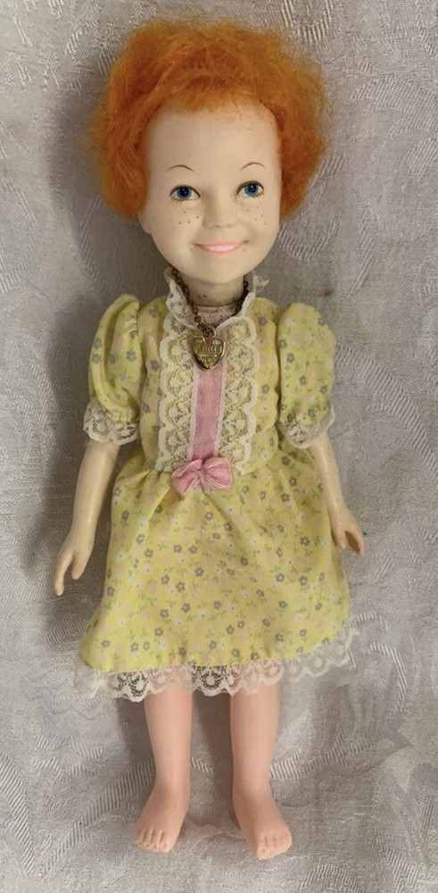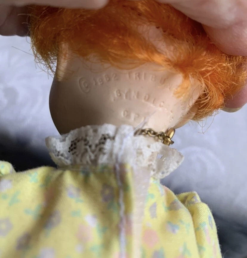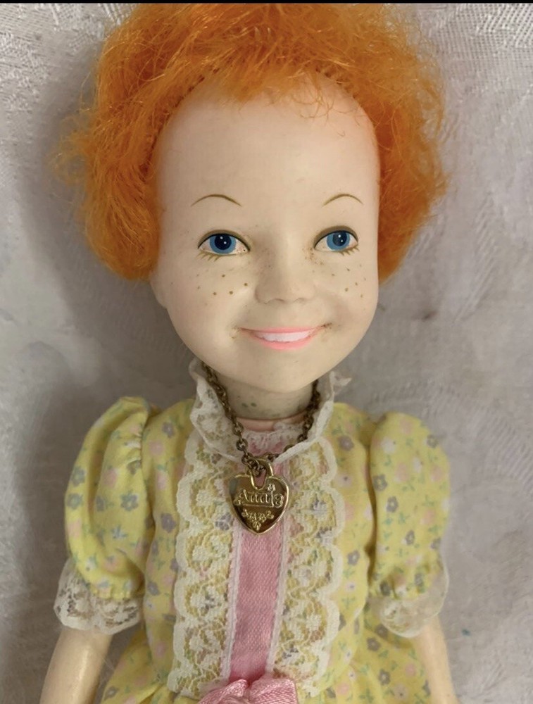 Vintage Tribune 1982 Knickerbocker plastic Annie doll 9” with necklace no socks. Vintage 1982 Tribune Knickerbocker plastic Annie doll 9” in height. In overall good physical condition. Light marks from use and wear barely notable. She has a little heart necklace that says Annie