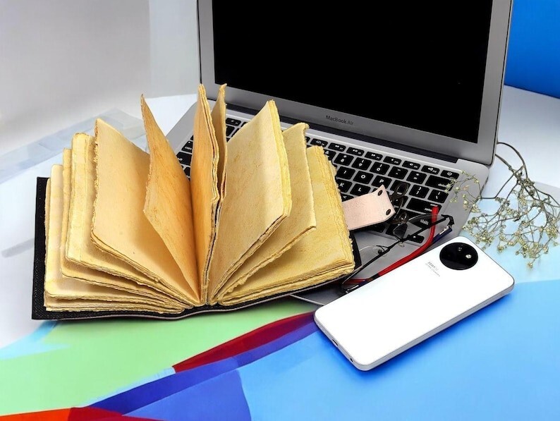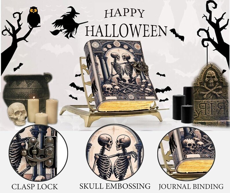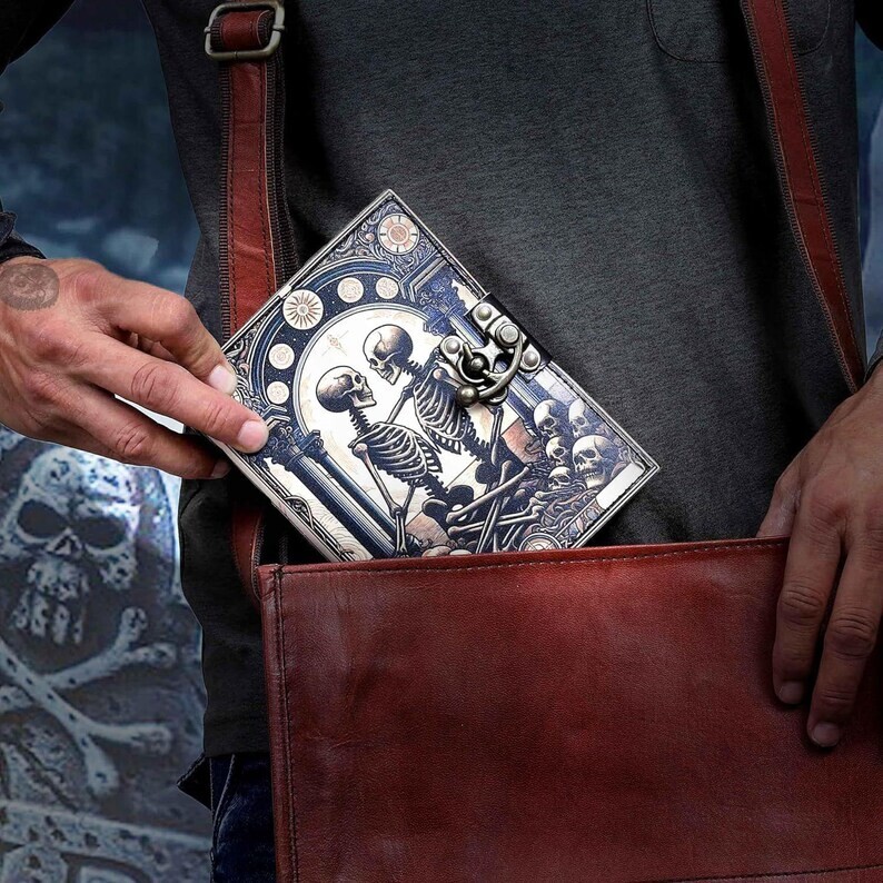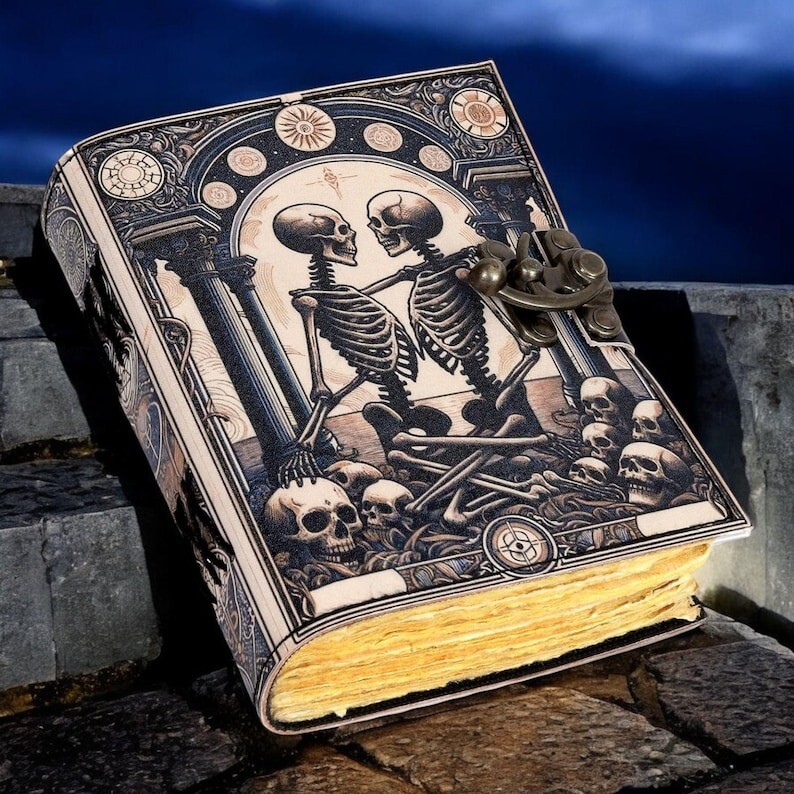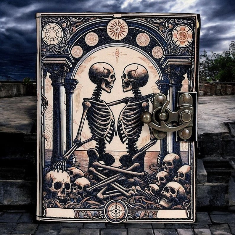 600 Page Large Grimoire leather journal, Print The Lovers Journal, blank spell book book of shadows Leather Celestial Gifts For Him Her * Print - The Lovers * Brass C Clasp lock closure * Genuine buffalo leather * Vintage deckle edge old paper *handmade rustic cotton paper * 200 Sheet (400 pages both side) * Availability in multiple size’s - 7x5 inches 8x6 inches 10x7 inches 13x10 inches 200 pages is also available in this journal perfect gifts for him and her ●leather journal witchcraft book of shadows notebook is made with 400 pages of Antique Paper which looks like it was pulled from history. You will fall in love with the the antique handmade cotton paper which is unique to our vintage journal Notebook. ● The vintage clasp lock will keep all your valuable writing locked inside. Sturdy hand stitched binding to make sure that no paper comes out loose from your spell notebook. ● The witchcraft supplies journal is printed with a special “ tree of life ” which helps to reveal inner truth within yourself and encourage self-awareness and self expression. We have taken extra to make sure that the emboss is perfect in every piece. ● Sketch, Doodle, Write on your Leather Blank Spell Journal with a Calligraphy Pen Fountain Pen, Brush Pen, Ball Pen, Acrylic Colours, Watercolor and many more. We guarantee no bleed through. ● Can be used as a notepad, journal, writing notebook, sketch book. 1.25 inch thickness, easy for handwriting, drawing or sketching and compact for carrying in your bag. Ideal for alternative ● Artist Sketchbooks, Photo Album, Traveling Notes, Business Executive, Logbook, Poetry Work, Journalists, Food Planner, Instagram Scrapbook and Bible Journaling. ● Best Gift For Your Companion: A Journal Is Like A Trusted Friend. You Can Use It To Solve Queries, Get Inventive, Or Record Valuable Memories For Them To Last Forever Or You Can Just Use It As A Gift For Your Wife, Son, Or A Daughter Or For Some Enthusiastic Writer In Your Family. Even For Looking For A Miraculous Spell Book Or A D&D Gamer Looking For His Quest Book. ● Perfectly Sized For Multi-Purpose Use: Length 5", Width 1", Height 7" Inches, This Easy To Carry Personal Diary Is Perfect To Use As A Health Journal, Sketchbook, And Poetry Journal. It's An Ideal Journal Which Records Your Daily Thoughts And Life Lists. And Also Good For Designing, Doodling, Or Calligraphy Of Your Choice.