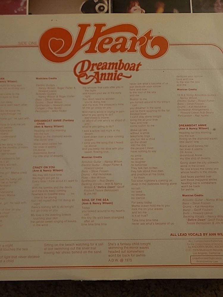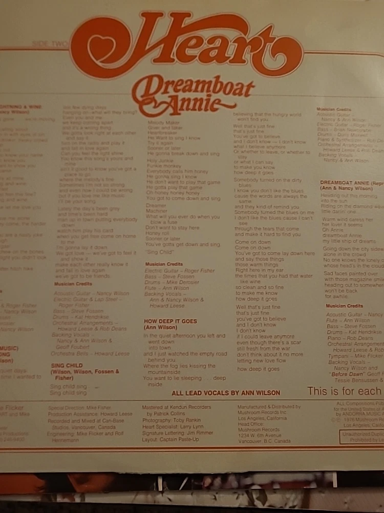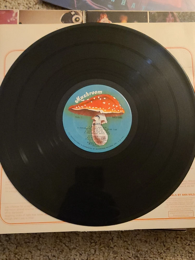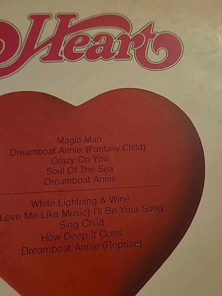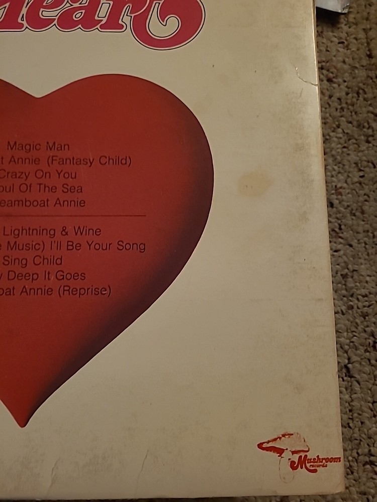 This is a vinyl record LP of Heart's Dreamboat Annie, released by Mushroom Records. The record is in the rock genre and is graded as Very Good (VG). The sleeve and inlay are also in Very Good (VG) condition. The record is a 12" LP with a speed of 33 RPM and is made of black vinyl material. The case type is cardboard sleeve. The release title is Dreamboat Annie and the artist is Heart. The record is in English language and was made in the United States.