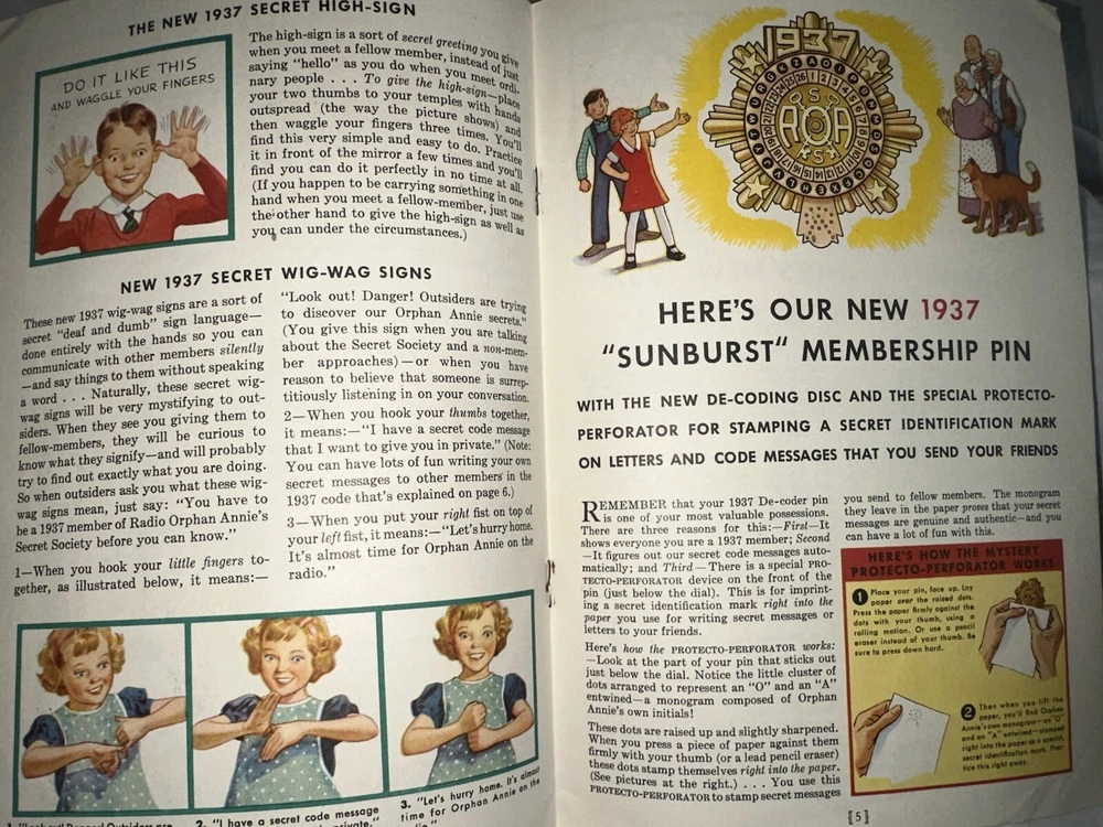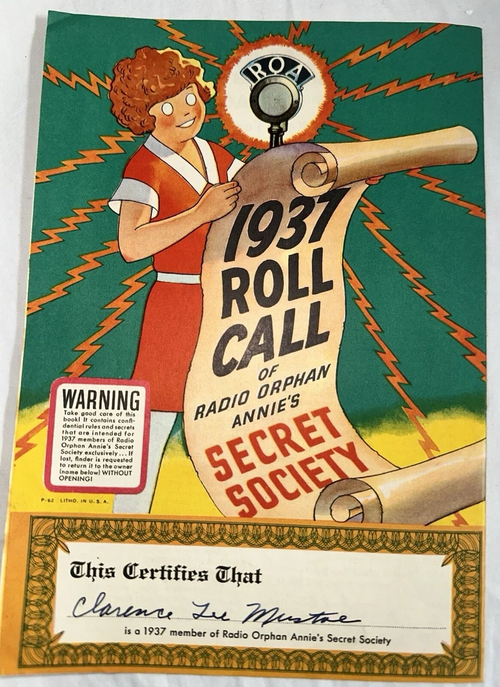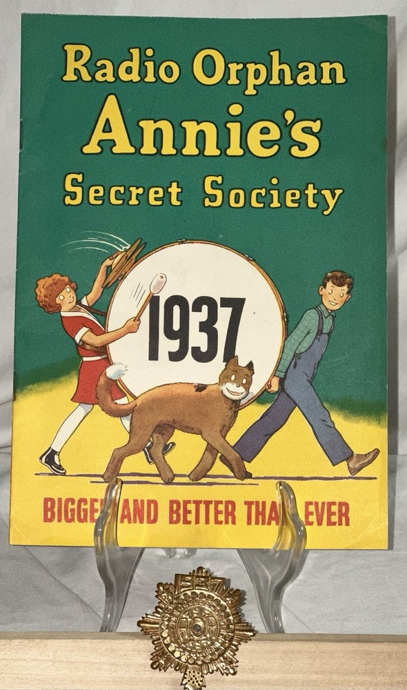 Delve into the past with this vintage 1937 Radio Orphan Annie Secret Society Book and Decoder Badge Pin. A cherished piece for collectors, this set captures the spirit of an iconic radio character, Annie, and her adventurous escapades. The set includes an illustrated book and a unique decoder badge pin, both reflecting the quality and charm of the mid-20th century. The Orphan Annie Secret Society Book is a testament to the enduring legacy of vintage character memorabilia, perfect for enthusiasts of radio history and antique toys. The set is a rare find, offering a glimpse into the rich cultural tapestry of the United States in the 1930s. Add this distinctive piece to your collection and own a slice of broadcasting history. The book does have pen/pencil present as well as some yellowing. Colors are still vibrant. In good vintage condition.
