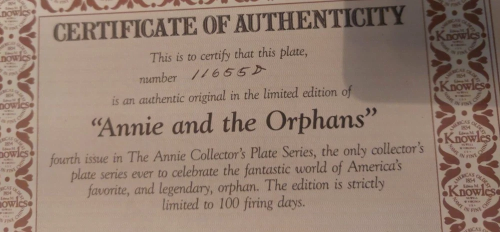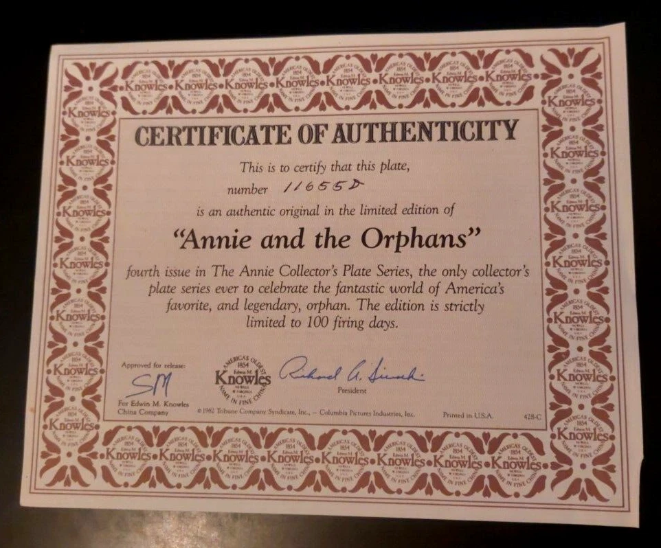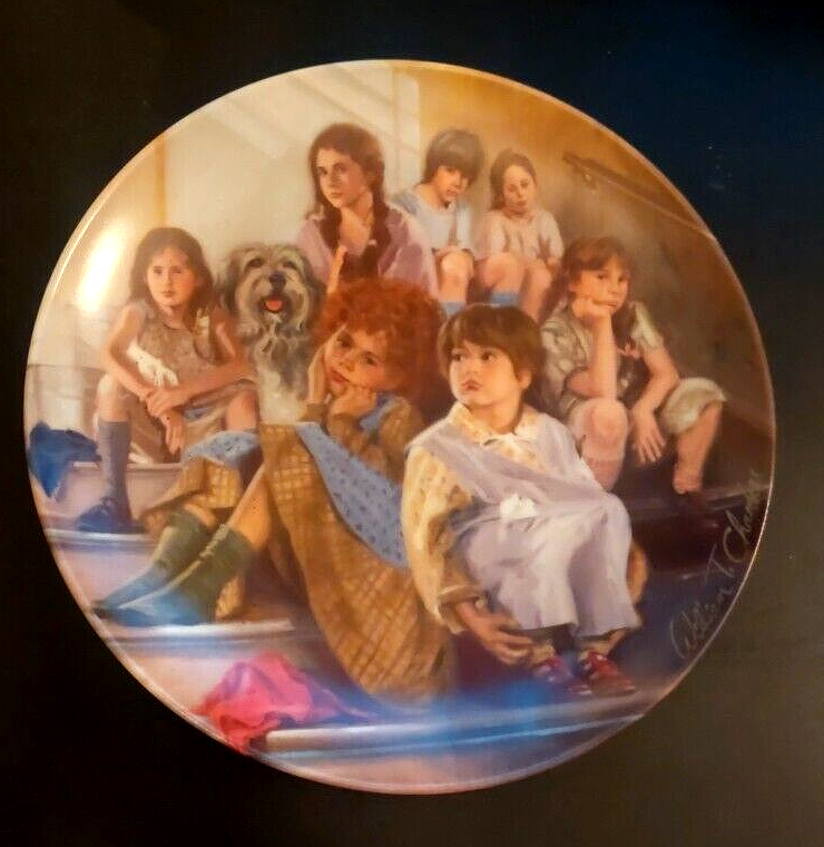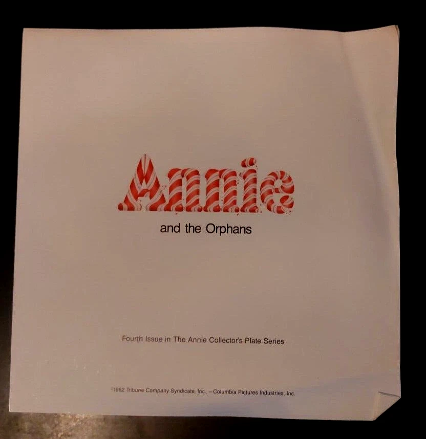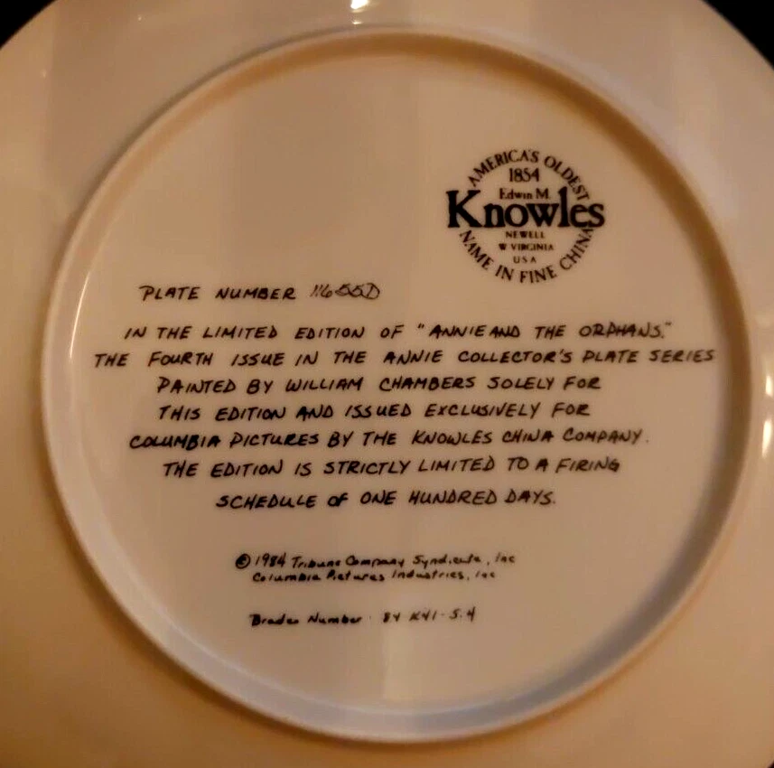 Vintage 1984, Edwin M. Knowles China Co., Collectors Plate, thru The Bradford Exchange. " Annie & the Orphans "COA #11655D and signed by Artist William Chambers. Diameter Measures 8 1/2". Bradex Number: 84-K41-5.4 Plate #11655D is the fourth issue in the "Annie's Collector's Plate Series. This Edition was painted & issued solely for Columbia Pictures and strictly limited to a firing schedule of 100 days. Plate is in very good preowned condition with no scratches, cracks, chips, chiggers, paint wear or any damage that I can find. Ships to the States by Ground Advantage for 10.00. I will ship International thru Ebay's shipping program. #13