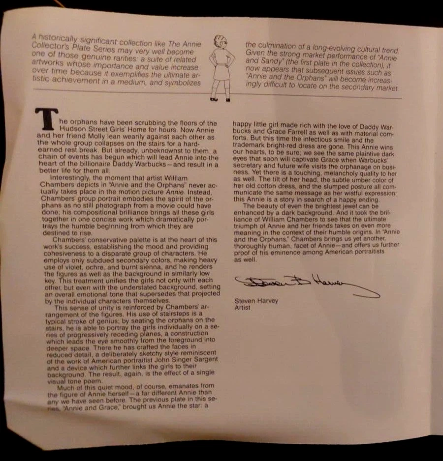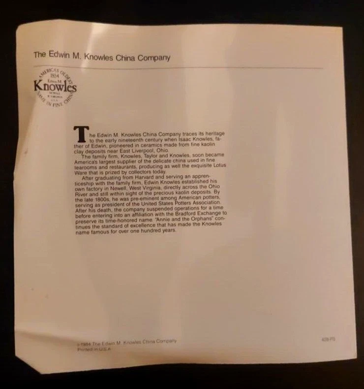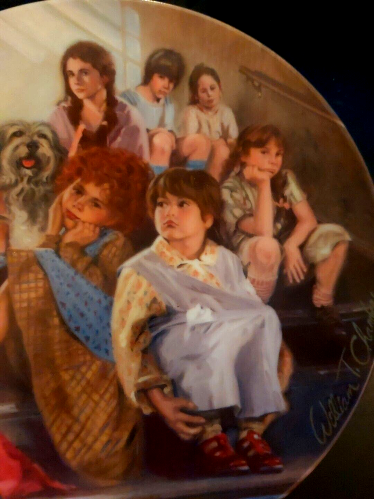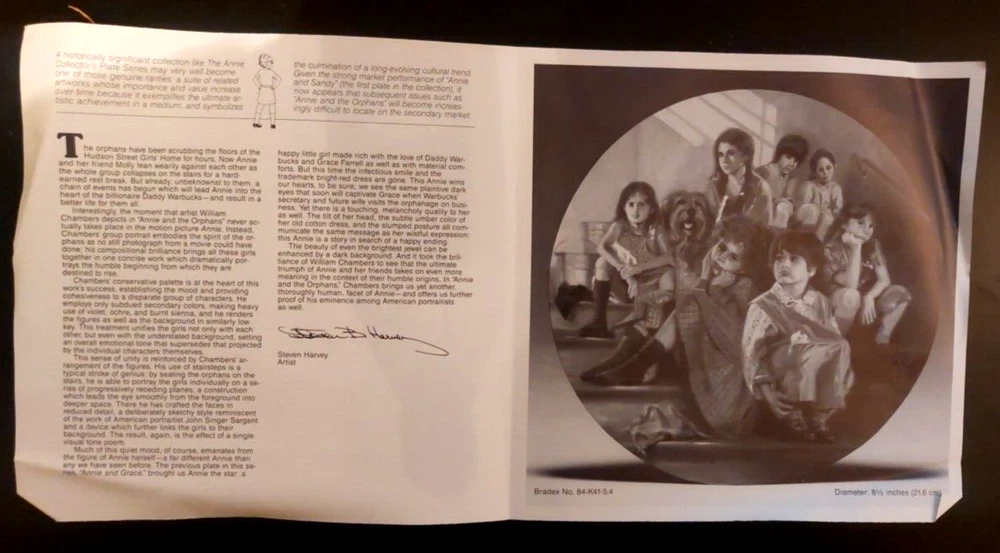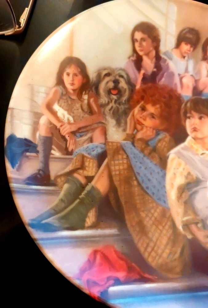 Vintage 1984, Edwin M. Knowles China Co., Collectors Plate, thru The Bradford Exchange. " Annie & the Orphans "COA #11655D and signed by Artist William Chambers. Diameter Measures 8 1/2". Bradex Number: 84-K41-5.4 Plate #11655D is the fourth issue in the "Annie's Collector's Plate Series. This Edition was painted & issued solely for Columbia Pictures and strictly limited to a firing schedule of 100 days. Plate is in very good preowned condition with no scratches, cracks, chips, chiggers, paint wear or any damage that I can find. Ships to the States by Ground Advantage for 10.00. I will ship International thru Ebay's shipping program. #13