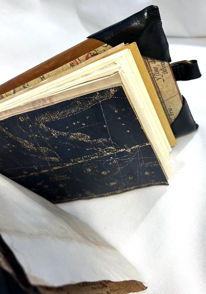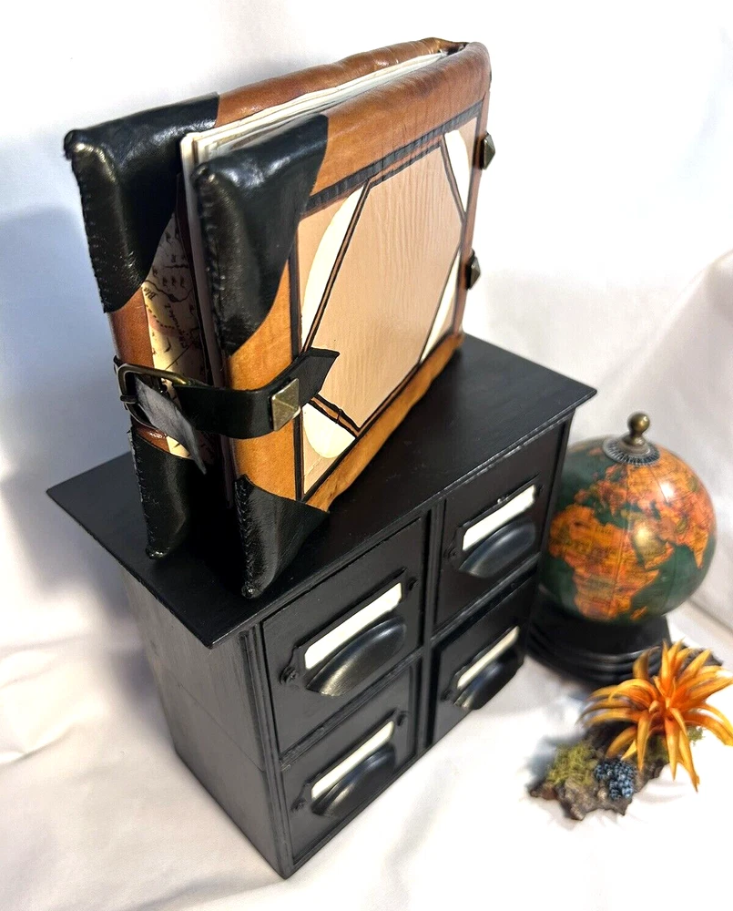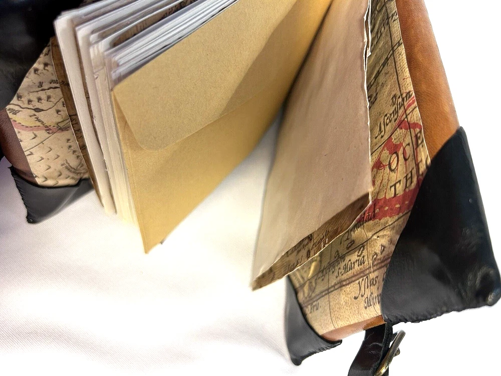 World Map Traveler's Leather Journal/Notebook 134 pages Various blank, lined, and map themed pages, including a secret envelope for covert notes! All pages are aged for an authentic vintage feel and aesthetic Handmade Leather Hardcover and Handsewn Binding 7" Tall x 8" Wide Genuine Leather with vegetable dye Leather strap and buckle closure The World Map Traveler's Leather Journal feels like an undiscovered treasure left over from the likes of Indiana Jones' adventures! The aged pages maintain the durability of "new" while lending the enchanting aesthetic of an "ancient" historical text. With 134 blank and cartography themed pages, this journal is ready to inspire the academic observations and awe-inspiring anecdotes of a life worth living! #SSLB0004 This item is certified One Of A Kind Safar Studios Safar Studios' products are handcrafted in the United States by Natasha Safar with the utmost care and attention to detail. She has been making art and expanding her sales in shops throughout the East Coast , and Mokarran is pleased to be able to offer works from her collection exclusively online. Custom art pieces available upon request CUSTOM ART COMMISSIONS: If you wish to commission a custom piece of art, please contact us with your requests. We will work with you to get all the details right and have Ms. Safar provide you with any designs for approval. We will provide you with details pertaining to cost, time-frames, etc. for your approval. Upon completion of your custom piece(s), we will contact you to work out a convenient time for us to post the item(s) on eBay for the agreed upon cost (a fixed price listing). WE WILL ONLY SELL THROUGH EBAY AT THIS TIME. We apologize for any inconvenience this may present, but that way the sale is covered under both Buyer and Seller Protections. PAYMENT : Payment is requested and expected within three (3) days of the close of the auction/listing (post purchase-date), unless you have contacted us and other arrangements have been made. We ship most items within one (1) day of receiving cleared payment. RETURNS : If you are not 100% satisfied with your purchase, please contact us within 30 days of receiving your item(s). Upon receiving your return, we will issue a full refund of the purchase price (original price + original shipping). In most cases, you, the buyer will be responsible for any return shipping costs. INTERNATIONAL SHIPPING: We ship internationally, but please check the shipping price and service offered prior to bidding or purchasing. We use calculated shipping based upon your location and the weight of the package, which is provided by eBay’s Shipping Calculator. The shipping price you see in the listing is eBay’s calculation for the cost of shipping directly to you; that price does not include any taxes, tariffs, or customs charges that may be incurred at your end. We have no way of calculating taxes, tariffs, or customs duties; they are your responsibility to pay in addition to shipping charges. For more information or details please contact your local post office. Please contact us with any other questions regarding shipping internationally. COMBINED SHIPPING: Whenever possible we combine shipping to save you money. To ensure you get accurate combined shipping, you can request a combined invoice. Please wait until we have sent you an invoice through eBay/PayPal before you pay for items that you wish to have shipped together to ensure accuracy of pricing. ADDITIONAL PICTURES POLICY: Please contact us if you would like to see more pictures of any of the items we have in stock. We strive to give you the best possible representation of the actual item available for purchase; however, we do use stock photos provided by suppliers for many of our items. If you would like more detailed pictures in general or pictures of specific details of an item, please let us know.