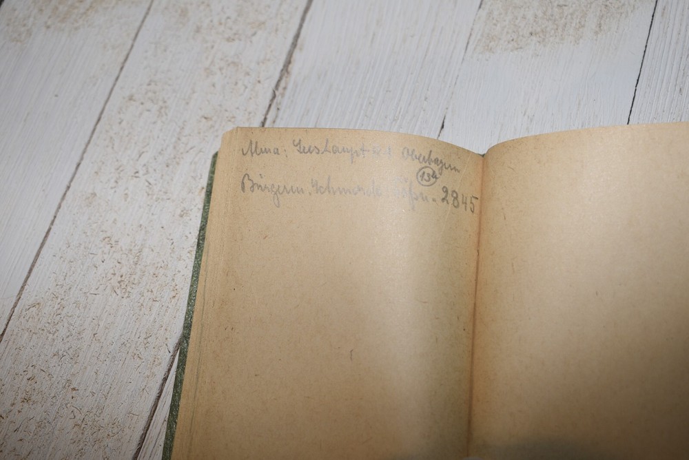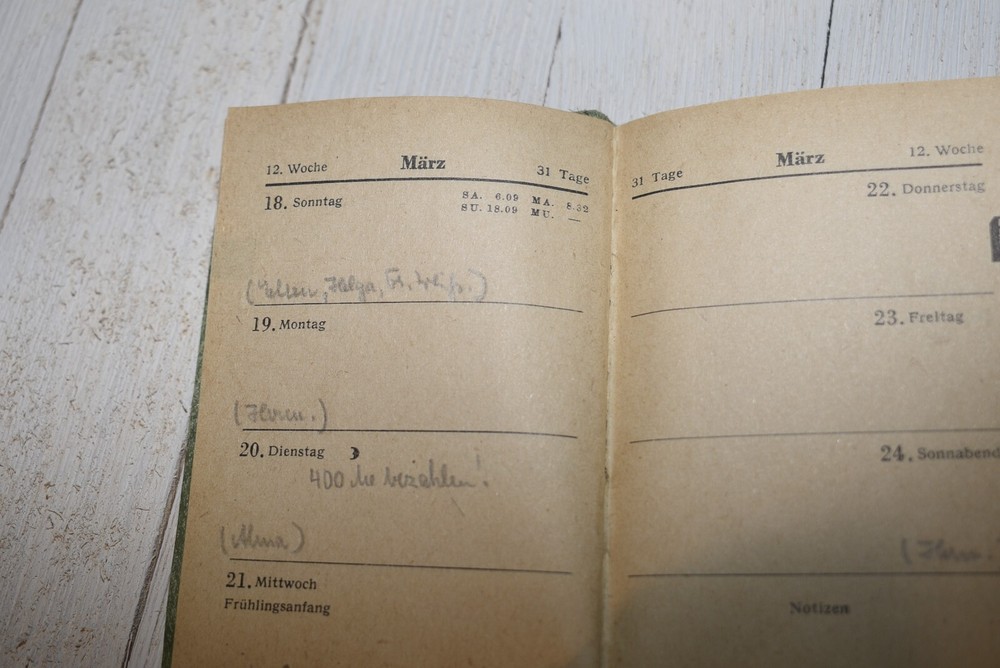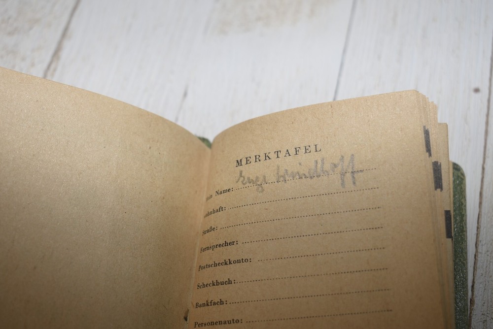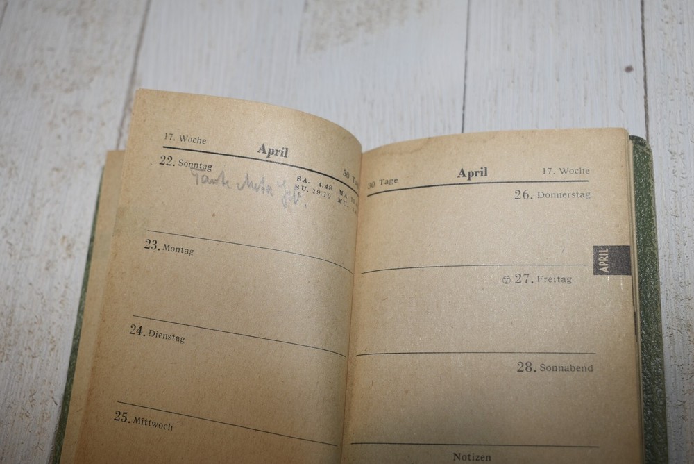 This vintage notebook from World War II is a rare find for collectors and history enthusiasts. The leather-bound notebook contains minimal notes in German, making it an intriguing artifact from the war era. The notebook serves as a daily planner and is a remarkable glimpse into the life of a soldier during WWII. The notebook's binding is made of high-quality leather and has withstood the test of time, making it a valuable addition to any collection. The notebook's unknown author and publisher add to its mystery and make it a unique piece for collectors of military and war artifacts. This item is a must-have for anyone interested in the history of WWII. WW2 WW11 Note Book Daily Planner 1945 Minimal notes German Notes.