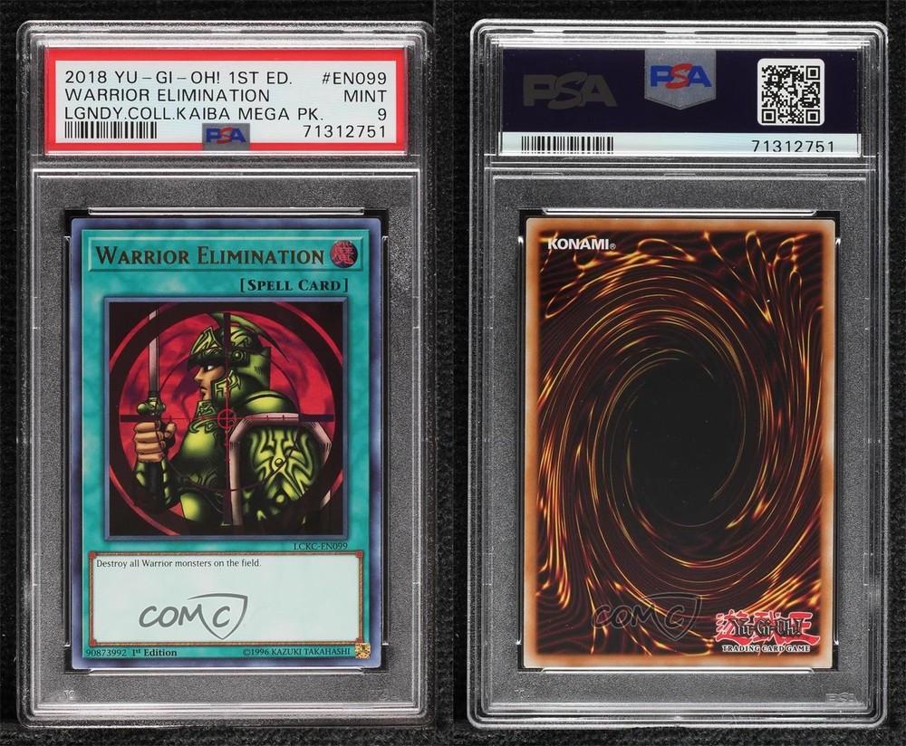 2018 Yu-Gi-Oh! - Legendary Collection Kaiba - [Base] - 1st Edition #LCKC-EN048 Ultra Rare - Warrior Elimination Graded PSA 9 MINT COMC Item: 172170068 - YuGiOh Card - Featuring Warrior Elimination Search for more: 2018 Yu-Gi-Oh! - Legendary Collection Kaiba Search for more: 2018 Yu-Gi-Oh! - Legendary Collection Kaiba - [Base] - 1st Edition View all of our Listings Auctions Buy It Now About Us Located in the beautiful Pacific Northwest, COMC (Check Out My Cards) is the world's largest consignment service for trading card singles. More than 10,000 people have used our consignment service to list over 50 million trading cards. Find out how we can help you consign your items on eBay by contacting us through eBay messaging. COMC -- "The Safe & Easy Way to Buy & Sell" Raw Condition for Modern Cards Unless otherwise noted, raw modern cards are listed in Near Mint-Mint condition or better. A NM-MT card appears to be Mint at first glance, but upon closer inspection, may exhibit some of the following: minor print defects (e.g. roller marks, print line, dimple), minor scratches, slight edge wear, and slight corner wear. Centering is clearly visible in the images provided and does not factor into our condition assessment. Raw Condition for Vintage Cards Unless otherwise noted, raw vintage cards are listed in Excellent condition or better. An EX card may exhibit some of the following: minor rounding of corners, surface wear, print defects, light scratches, and slight edge wear/chipping. Centering is clearly visible in the images provided and does not factor into our condition assessment. Domestic Shipping Combined shipping for multiple items is available. To receive combined shipping, please ensure all desired items are in your eBay shopping cart before proceeding to checkout. eBay limits orders to 40 items per order. We automatically combine multiple orders placed on the same day. If you place multiple orders on the same day, please contact us to request a refund of applicable shipping costs. Signature confirmation may be required on invoices over $400. All cards are protected and shipped securely. International Shipping COMC offers eBay's International Shipping (EIS) for international orders under $2,500* (see country exceptions below). All duties and import fees are paid at checkout; in the rare event that there are additional import fees upon delivery, these are borne by the buyer. EIS packages route through a shipping hub in Erlanger, KY before shipping to their final destination. Please note that EIS does not allow for combined shipments. The shipping rates are determined by eBay and cannot be adjusted. *Maximum sale price exceptions: Colombia, Kuwait ($2,000); Taiwan ($1,539); Chile, Costa Rica, Guatemala, Honduras, Trinidad and Tobago ($1,000); Antigua and Barbuda, Aruba, Belize, Dominica, Grenada, Philippines, Saint Kitts and Nevis, Saint Lucia, Montserrat, Turks and Caicos Islands ($500); Dominican Republic, El Salvador ($200). Please request a shipping quote through eBay messaging for orders that exceed the maximum sale price supported by eBay's International Shipping. You will be responsible for all duties and import fees for international orders shipped outside the EIS. All cards are protected and shipped securely. Payment COMC does not accept offers on our cards through our eBay storefront. COMC utilizes eBay’s managed payments system. If you are experiencing difficulties making a payment, please contact eBay for assistance. Return Policy Returns are only accepted on the rare occasion the item is not as described. If you are making a return, please initiate the return process through eBay so a mailing label can be provided for you. Prior to listing, our expert team carefully assessed this item to represent it accurately. Please review the description and high-definition images prior to purchasing to ensure this item meets your satisfaction. We welcome you to contact us if you have further questions about this item. Trust and Integrity COMC carefully assesses each item consigned to us to prevent fraudulent items from entering the marketplace. If you believe an item offered on COMC may be fraudulent, please contact us with details so we can investigate the issue. Items we determine are outside our supported items policy may be removed. Last Modified: 6/7/2025 2:57:36 AM PDT