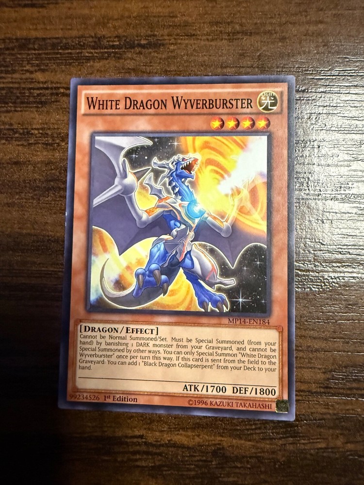 Elevate your Yu-Gi-Oh! TCG collection with the formidable White Dragon Wyverburster from the 2014 Mega-Tins Mega Pack. As a 1st Edition Effect-type monster, it brings a blend of strategic depth and powerful combat presence to the table. With an attack power of 1700 and a defense toughness of 1800, this Dragon-type creature is a force to be reckoned with. Card Number MP14-EN184, produced by Konami, features the iconic "Light" attribute and comes in English language. A Common / Short Print rarity card, it's a must-have for both seasoned players looking to enhance their decks and collectors seeking to complete their set.