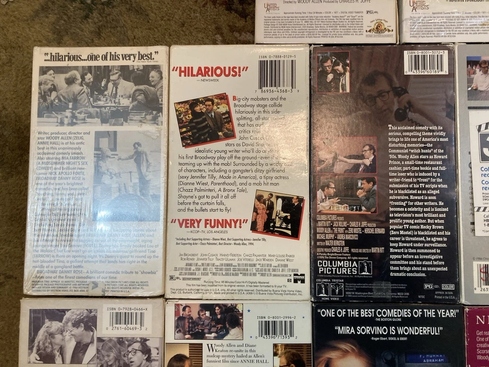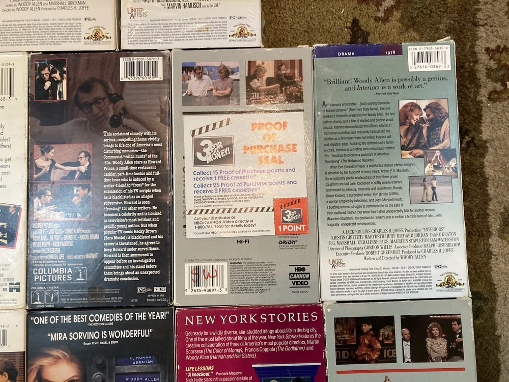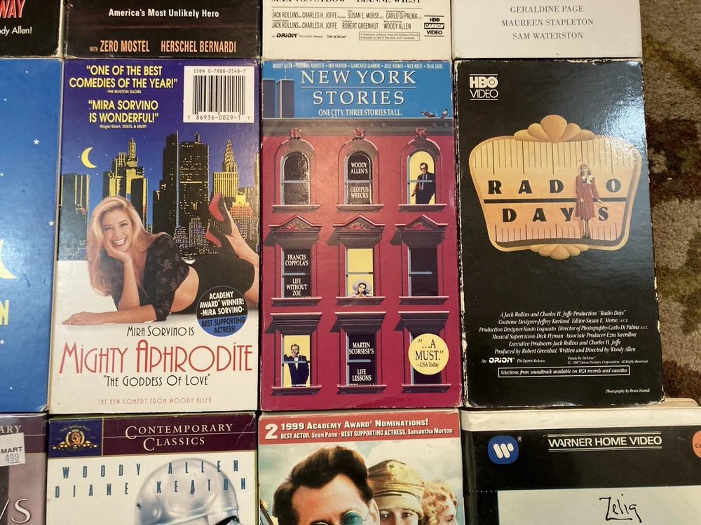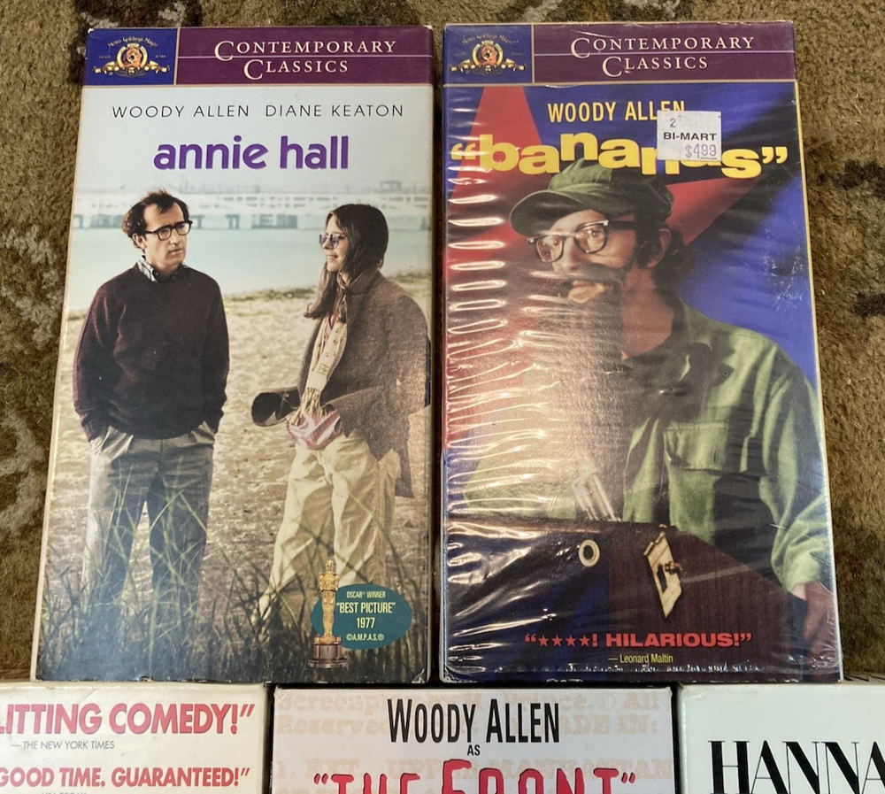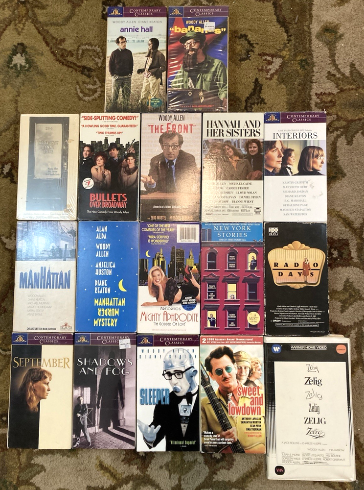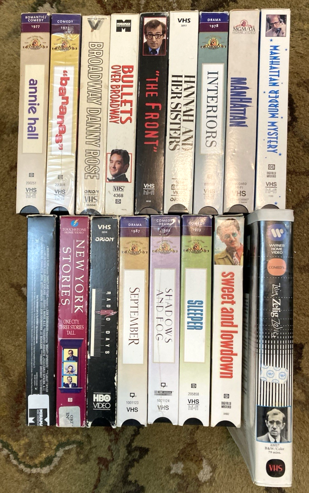 Nice lot of 17 VHS tapes, all are by or with Woody Allen. Overall good, watchable condition with the usual signs of age including some with degraded sound, color or sharpness. Cases are serviceable with some wear and stains. Several are previous rentals, two are new in the wrapper. Titles include: Annie Hall, Bananas, Broadway Danny Rose, Bullets Over Broadway, The Front, Hannah and Her Sisters, Interiors, Manhattan, Manhattan Murder Mystery, Mighty Aphrodite, New York Stories, Radio Days, September, Shadows and Fog, Sleeper, Sweet and Lowdown, and Zelig. See my eBay Store for the useful, vintage, well loved, nearly new and other old stuff.