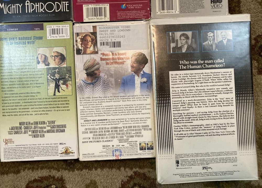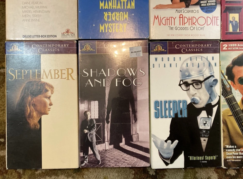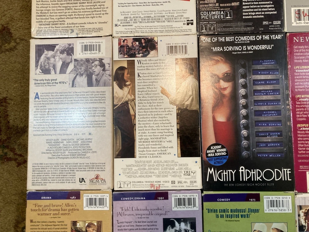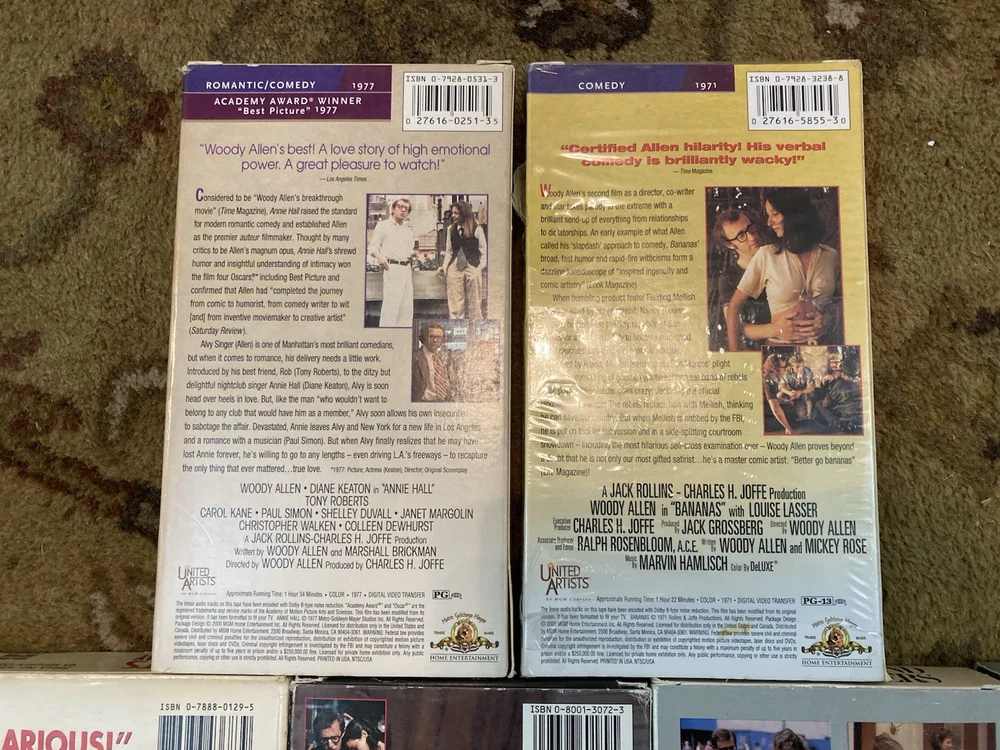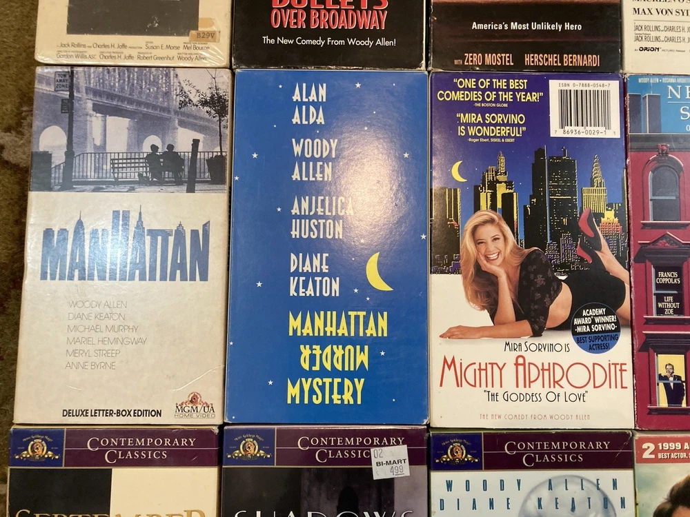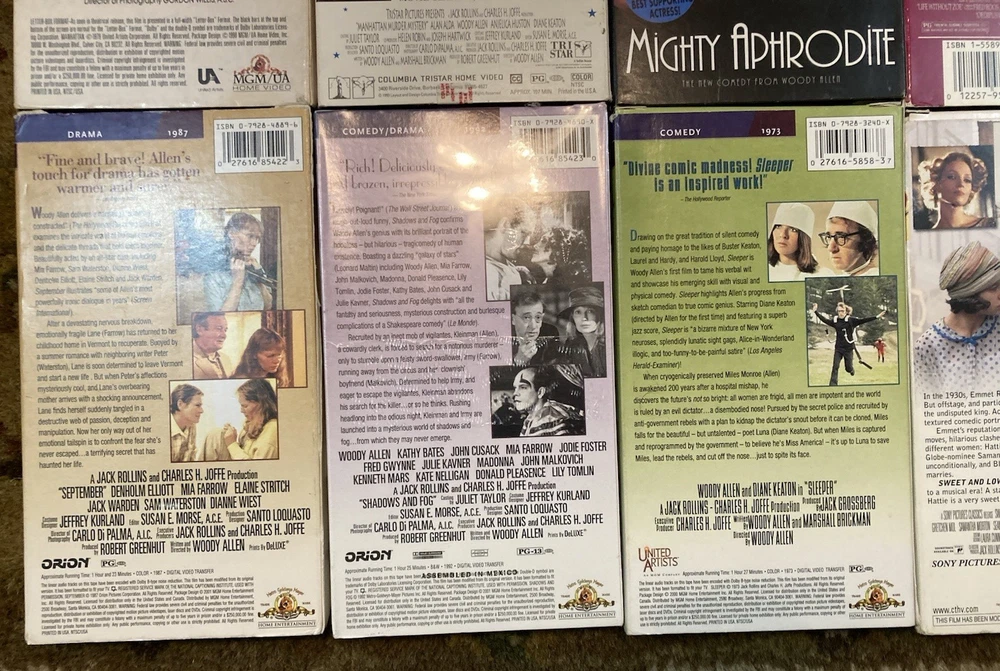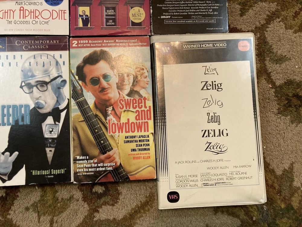 Nice lot of 17 VHS tapes, all are by or with Woody Allen. Overall good, watchable condition with the usual signs of age including some with degraded sound, color or sharpness. Cases are serviceable with some wear and stains. Several are previous rentals, two are new in the wrapper. Titles include: Annie Hall, Bananas, Broadway Danny Rose, Bullets Over Broadway, The Front, Hannah and Her Sisters, Interiors, Manhattan, Manhattan Murder Mystery, Mighty Aphrodite, New York Stories, Radio Days, September, Shadows and Fog, Sleeper, Sweet and Lowdown, and Zelig. See my eBay Store for the useful, vintage, well loved, nearly new and other old stuff.
