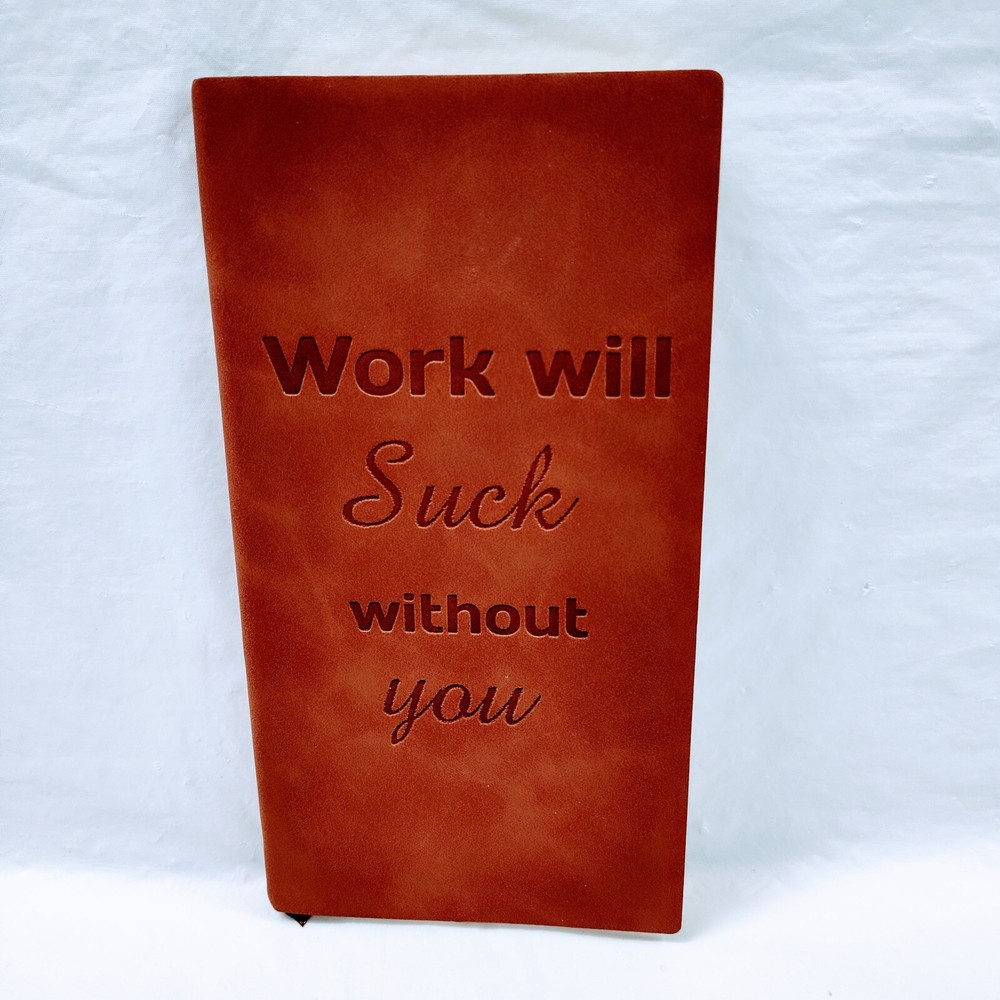 This faux leather bound notebook pad is perfect for young adults and adults who want to add a touch of sophistication to their work or personal life. The book title, "Work Will Suck Without You", is a great reminder to stay positive and keep working towards your goals. The notebook pad is perfect for taking notes, sketches, or anything else that comes to mind. The faux leather material gives it a sleek and stylish look that is sure to impress. This item is a must-have for anyone who wants to add a touch of elegance to their daily routine.