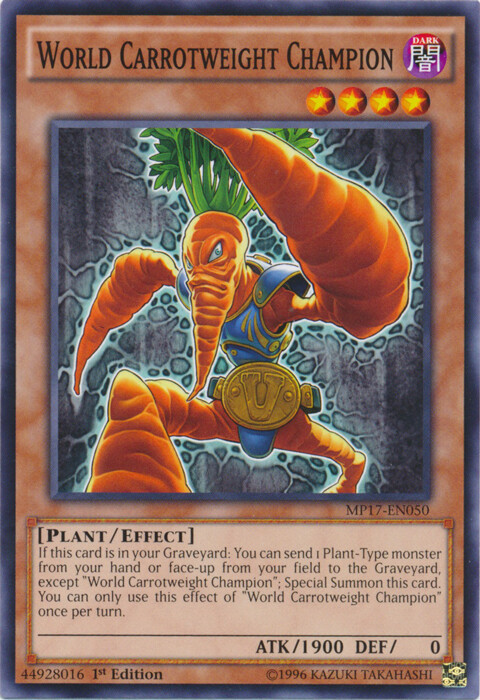 Please, carefully read the following: Image shown is a stock photo and does not reflect the actual card you will be receiving. Please refer to the condition guide below, the title and item description for what you will be receiving. Please also be aware that due to plastic shortages, orders may not always come in a plastic toploader but will always be protected as much as possible to prevent damage. You will receive 1x World Carrotweight Champion - MP17-EN050 - Common - 1st Edition - Condition: Lightly Played Please refer to the Title and Item Description above for the item being purchased. Delivery delays: Deliveries may not always fall within the estimated delivery dates when shipping outside of Canada and USA. Many factors may contribute to delays in delivering the package such as weather and customs. Please note that delivery to international locations may take up to 8 weeks to arrive . We always ship out orders within 1 business day and after dropping off with the post office, delivery times are out of our control. Feedback: We will always leave positive feedback for you and we ask if you can do the same for us. If there is any reason why the transaction was not up to your expectations, please message us before leaving feedback so we can address the issue. Combined shipping: To receive a combined shipping quote, please make sure that you commit to purchasing on ebay.ca . This allows us to send you a combined shipping invoice before payment. Shipping within the USA (6-10 Business days): FREE! Shipping within Canada (3-8 Business days): FREE! Shipping and handling delay: We aim to ship all orders within 1 business day. We do not ship on weekends and holidays. Condition Guide: We do not sell any cards that are in MINT condition, the best condition that we offer is near mint. Near Mint (NM) - Cards in Near Mint condition show minimal to no wear from shuffling, play or handling and can have a nearly unmarked surface, crisp corners and unblemished edges outside of a few minimal flaws. A Near Mint card may have a tiny edge nick or a tiny scratch or two, but overall look nearly unplayed with no major defects or flaws. Lightly Played (LP) - Cards in Lightly Played condition may have minor border or corner wear or even just slight scuffs or scratches. There are no major defects such as water damage, bends or issues with the structural integrity of the card. Noticeable imperfections are okay, but none should be too severe or at too high a volume. Moderately Played (MP) - Cards in Moderately Played condition exhibit condition issues visible at a casual glance. Cards in Moderately Played condition can have border wear, corner wear, scratching or scuffing, creases or whitening, minor dirt buildup or any combination of mild examples of these marks. A Moderately Played card may have some form of a more major marking, such as spot water damage or creasing that doesnʼt affect card integrity, but not in combination with other issues such as scratches, scuffs or border/edge wear and not impacting a large area of the card. Heavily Played (HP) - Cards in Heavily Played condition show a severe amount of wear. Heavily Played condition can include cards that have major creasing, major whitening, major border wear or any combination of those flaws. (These flaws cannot prevent the card from being tournament playable when sleeved.) Damaged - Cards in Damaged condition can exhibit a tear, bend or crease that may make the card illegal for tournament play, even in a sleeve. Cards in Damaged condition may have extreme border wear, extreme corner wear, heavy scratching or scuffing, folds, creases or tears or other damages that impacts the structural integrity of the card.