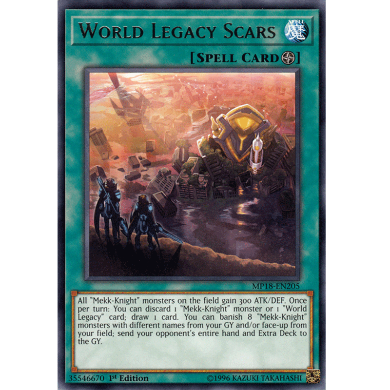 World Legacy Scars - MP18-EN205 - Rare - 1st Edition Image is a stock photo of the card. You will receive the card in Lightly Played condition Condition: Lightly Played ATK/DEF : Attribute : Spell Card Number : MP18-EN205 Card Rules : Card Text : All "Mekk-Knight" monsters on the field gain 300 ATK/DEF. Once per turn: You can discard 1 "Mekk-Knight" monster or 1 "World Legacy" card; draw 1 card. You can banish 8 "Mekk-Knight" monsters with different names from your GY and/or face-up from your field; send your opponent's entire hand and Extra Deck to the GY. Card Type : FieldSpell Card Edition : 1st Level : Monster Type : Name : World Legacy Scars Passcode : 35546670 Pendulum Scale : Rarity : Rare Set : 2018 Mega-Tin Mega Pack Be sure to visit our store for a wide selection of your favorite cards! We are running specials RIGHT NOW!! Shipping Options: ~Ships in a regular white envelope with a stamp for FREE! (THERE IS NO TRACKING INFORMATION AVAILABLE FOR THE ABOVE METHOD. SHIPPING TIME IS 4-10 BUSINESS DAYS) ~Ships in a TRACKEDbubble mailer for $5.99! ~Shipments are handled same or next business day. ~FREE SHIPPING for each additional card, so shop around our store!