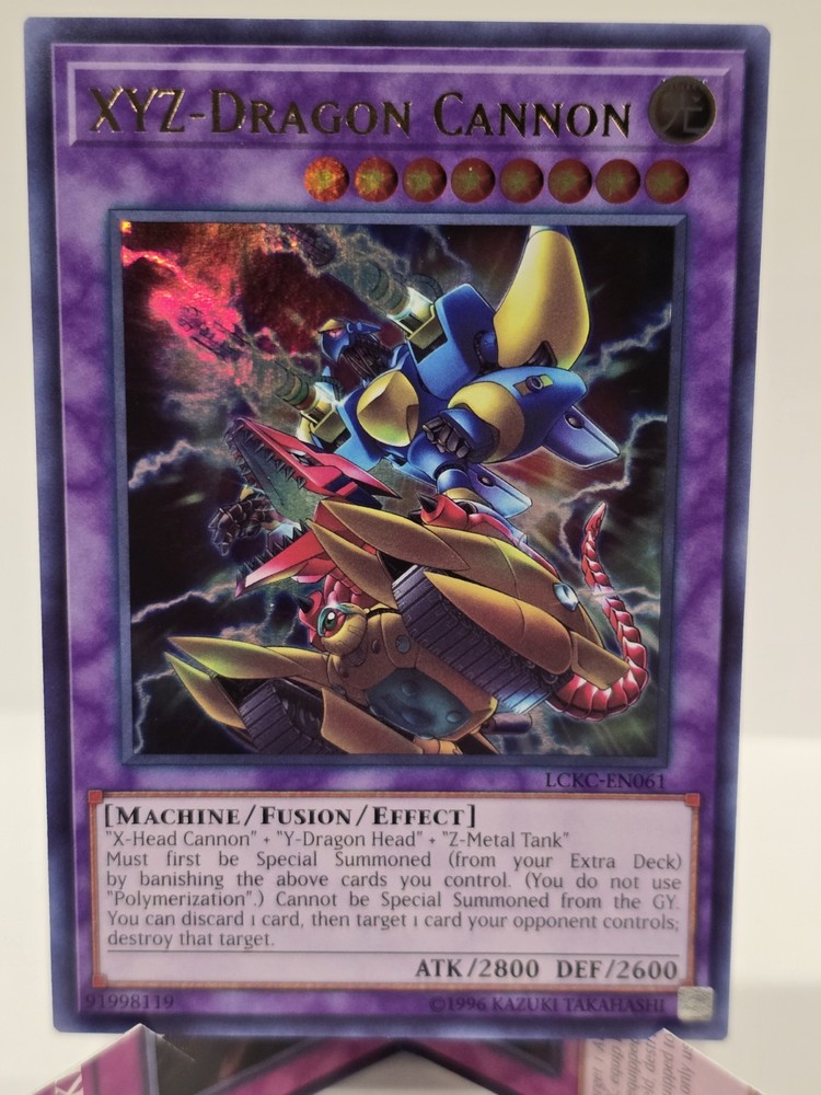 The XYZ-Dragon Cannon LCKC-EN061 card from the Legendary Collection Kaiba Unlimited Edition is a Light-type Machine monster with 2600 defense and 2800 attack power. This ultra-rare card features the fusion of three powerful cards - "X-Head Cannon," "Y-Dragon Head," and "Z-Metal Tank" - with unique abilities. It must be Special Summoned from the Extra Deck by banishing the above cards you control and can discard 1 card to target and destroy your opponent's card. Manufactured by Konami, this English-language card is a sought-after addition for Yu-Gi-Oh! TCG collectors and players.
