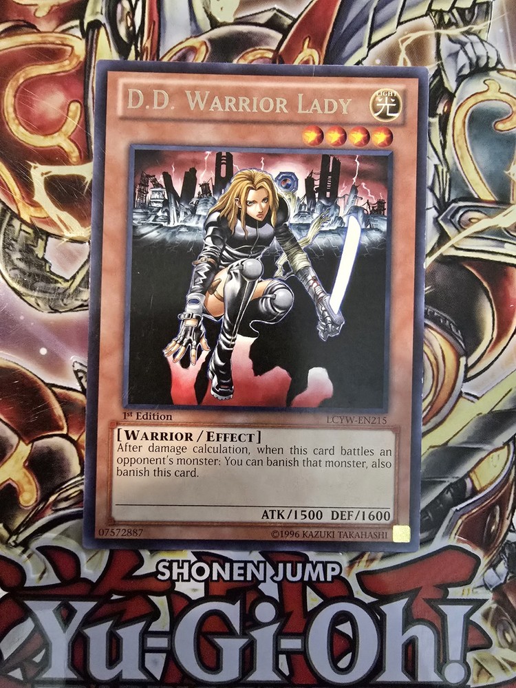 The YUGIOH D.D. Warrior Lady card is from the Legendary Collection 3: Yugi's World set in the Yu-Gi-Oh! TCG. It is a Rare 1st Edition card with a Light attribute, Japanese card size, and a Warrior monster type. The card has an Attack/Power of 1500 and Defense/Toughness of 1600, making it a formidable addition to a player's deck. This foil card features D.D. Warrior Lady as an Effect card, adding strategic value to gameplay.