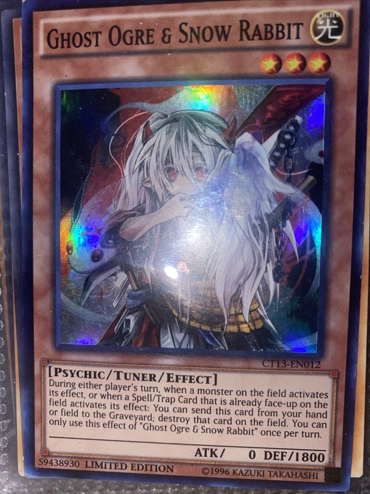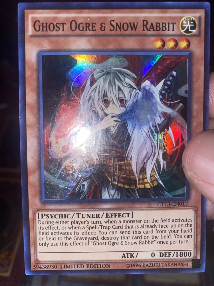 | Card Text | During either player's turn, when a monster on the field activates its effect, or when a Spell/Trap Card that is already face-up on the field activates its effect: You can send this card from your hand or field to the Graveyard; destroy that card on the field. You can only use this effect of "Ghost Ogre & Snow Rabbit" once per turn. |