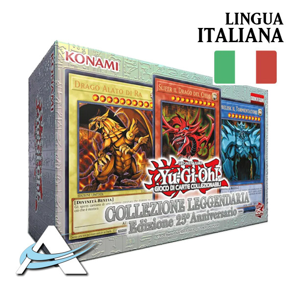 Nuovo & Sigillato Uno dei primi e più famosi oggetti di Yu-Gi-Oh! GIOCO DI CARTE COLLEZIONABILI torna per il 25esimo anniversario del gioco di carte! La primissima Collezione Legendaria ritorna come Collezione Leggendaria 25th Anniversary ! Contiene 6 buste di espansione e 6 carte Ultra Rare inclusa una carta variant speciale di alcuni dei più famosi mostri della serie originale del cartone animato. In aggiunta alle 6 carte Ultra Rare che includono le richiestissime promo delle carte Divinità Egizie, l'edizione 25° Anniversario include una settima carta bonus. La settima carta offrirà ai duellanti un'anticipazione su una nova rarità creata apposta per il 25esimo anniversario: il Quarter Century Secret Rare ! Ogni Collezione Leggendario 25° Anniversario includerà una carta random Quarter Century Secret Rare di 6 carte speciali variant. Ciascuna Collezione Leggendario 25° Anniversario contiene: 1 Busta di Leggenda del Drago Bianco Occhi Blu 1 Busta di Predoni Metallici 1 Busta di Sovrano della Magia 1 Busta di Servitore del Faraone 1 Busta di Crisi Oscura 1 Busta di Invasione del Chaos 1 Carta Ultra rara per ciascuno dei seguenti mostri Obelisk il Tormentatore , Slifer il Drago del Cielo , il Drago Alato di Ra , Drago Bianco Occhi Blu , Mago Nero , Drago Nero Occhi Rossi e una carta Quarter Century Secret Rare delle carte appena citate. Factory Sealed One of the first and most famous items from Yu-Gi-Oh! TRADING CARD GAME returns for the 25th anniversary of the card game! The very first Legendary Collection returns as the Legendary Collection 25th Anniversary ! Contains 6 booster packs and 6 Ultra Rare cards including a special variant card of some of the most famous monsters from the original cartoon series. In addition to the 6 Ultra Rare cards that include the highly requested Egyptian God card promos, the 25th Anniversary Edition includes a seventh bonus card. The seventh card will offer duelists a sneak peek at a new rarity created especially for the 25th anniversary: the Quarter Century Secret Rare ! Each Legendary Collection 25th Anniversary Edition will include a random Quarter Century Secret Rare card of 6 variant special cards. Each Legendary Collection 25th Anniversary Edition contains: 1 Legend of Blue-Eyes White Dragon booster pack 1 Metal Raiders booster pack 1 Spell Ruler booster pack 1 Pharaoh's Servant booster pack 1 Dark Crisis booster pack 1 Invasion of Chaos booster pack 1 Ultra Rare card for each of the following monsters Obelisk the Tormentor , Slifer the Sky Dragon , Winged Dragon of Ra , Blue-Eyes White Dragon , Dark Magician , Red-Eyes Black Dragon , and one Quarter Century Secret Rare card of the above cards.