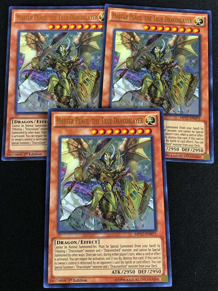 YUGIOH MASTER PEACE THE TRUE DRACOSLAYER MP17-EN075 1ST ULTRA X3 ALL CARDS IN THIS AUCTION ARE IN NEAR MINT TO MINT CONDITION UNLESS STATED OTHERWISE IN THE TITLE. AND, YOU ARE GUARANTEED TO RECEIVE THE CARD NAMED IN THE TITLE. PLEASE NOTE, IF THERE'S MORE THAN 1 COPY AVAILABLE, YOU MAY NOT RECIEVE THE SAME EXACT CARD IN THE PHOTO. HOWEVER, IT WILL BE THE SAME EXACT CARD IN THE TITLE, AND DESCRIPTION! PLEASE CONTACT ME IF THERE IS ANYTHING WRONG WITH YOUR ORDER OR SHIPPING BEFORE LEAVING FEEDBACK. PLEASE GIVE ME A CHANCE TO FIX ANY PROBLEM YOU MAY HAVE. THANK YOU! Shipping Information: Shipping and Handling for this auction will be Free inside the United States - With Tracking! International Shipping Available Through Ebay’s Global Shipping Program. (BUYER IS RESPONSIBLE FOR ANY TAX) **Read the TITLE to see the condition of the cards Before you place a bid. Any damaged cards will be listed as such In The Title (FOR EXAMPLE: Blue Eyes White Dragon LOB-001 (HP) If it doesn't say anything about damage, it is in near-mint to mint condition. If you have any questions, message me Before you place your bid.** *PLEASE READ* Ebay's Card Condition Guidelines: (NM) = Near mint or better Comparable to a fresh pack Flaws may include Minor corner and edge wear (LP) = Lightly played (Excellent) Has clearly visible signs of wear Flaws may include Moderate edge chipping Moderate surface scuffing Fuzzy corners (MP) = Moderately played (Very good) Has moderate-to-heavy damage all over Flaws may include Moderate discoloration Moderate creasing Moderate to heavy edge chipping Rounding and soft corner (HP) = Heavily played (Poor) Is extremely worn and displays flaws all over Heavily Played condition cards exhibit signs of heavy wear. Heavily Played condition cards may include cards that have significant creasing, folding, severe water damage, heavy whitening, heavy border wear, and/or tearing. RETURN POLICY: RETURNS ARE ACCEPTED IF THE ITEM ARRIVES DAMAGED, OR NOT AS DESCRIBED. RETURNS ARE NOT ACCEPTED FOR BUYERS REMORSE. CHECK OUT MY OTHER AUCTIONS! _gsrx_vers_1680 (GS 9.8.3 (1680))