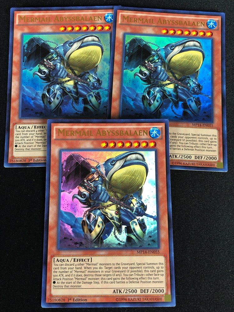 YUGIOH MERMAIL ABYSSBALAEN MP14-EN055 1ST ULTRA X3 ALL CARDS IN THIS AUCTION ARE IN NEAR MINT TO MINT CONDITION UNLESS STATED OTHERWISE IN THE TITLE. AND, YOU ARE GUARANTEED TO RECEIVE THE CARD NAMED IN THE TITLE. PLEASE NOTE, IF THERE'S MORE THAN 1 COPY AVAILABLE, YOU MAY NOT RECIEVE THE SAME EXACT CARD IN THE PHOTO. HOWEVER, IT WILL BE THE SAME EXACT CARD IN THE TITLE, AND DESCRIPTION! PLEASE CONTACT ME IF THERE IS ANYTHING WRONG WITH YOUR ORDER OR SHIPPING BEFORE LEAVING FEEDBACK. PLEASE GIVE ME A CHANCE TO FIX ANY PROBLEM YOU MAY HAVE. THANK YOU! Shipping Information: Shipping and Handling for this auction will be Free inside the United States - With Tracking! International Shipping Available Through Ebay’s Global Shipping Program. (BUYER IS RESPONSIBLE FOR ANY TAX) **Read the TITLE to see the condition of the cards Before you place a bid. Any damaged cards will be listed as such In The Title (FOR EXAMPLE: Blue Eyes White Dragon LOB-001 (HP) If it doesn't say anything about damage, it is in near-mint to mint condition. If you have any questions, message me Before you place your bid.** *PLEASE READ* Ebay's Card Condition Guidelines: (NM) = Near mint or better Comparable to a fresh pack Flaws may include Minor corner and edge wear (LP) = Lightly played (Excellent) Has clearly visible signs of wear Flaws may include Moderate edge chipping Moderate surface scuffing Fuzzy corners (MP) = Moderately played (Very good) Has moderate-to-heavy damage all over Flaws may include Moderate discoloration Moderate creasing Moderate to heavy edge chipping Rounding and soft corner (HP) = Heavily played (Poor) Is extremely worn and displays flaws all over Heavily Played condition cards exhibit signs of heavy wear. Heavily Played condition cards may include cards that have significant creasing, folding, severe water damage, heavy whitening, heavy border wear, and/or tearing. RETURN POLICY: RETURNS ARE ACCEPTED IF THE ITEM ARRIVES DAMAGED, OR NOT AS DESCRIBED. RETURNS ARE NOT ACCEPTED FOR BUYERS REMORSE. CHECK OUT MY OTHER AUCTIONS! _gsrx_vers_1680 (GS 9.8.3 (1680))